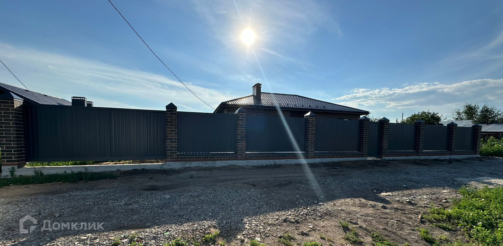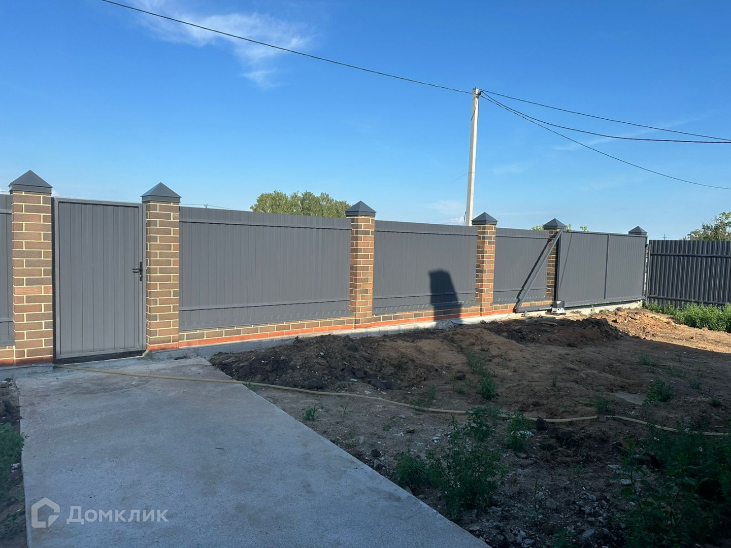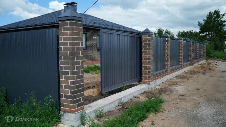 установленный забор по периметру с фасадом из кирпичных колонн в цвет дома, откатные ворота с ДУ, калитка с домофоном, защебененная площадка под автомобиль.