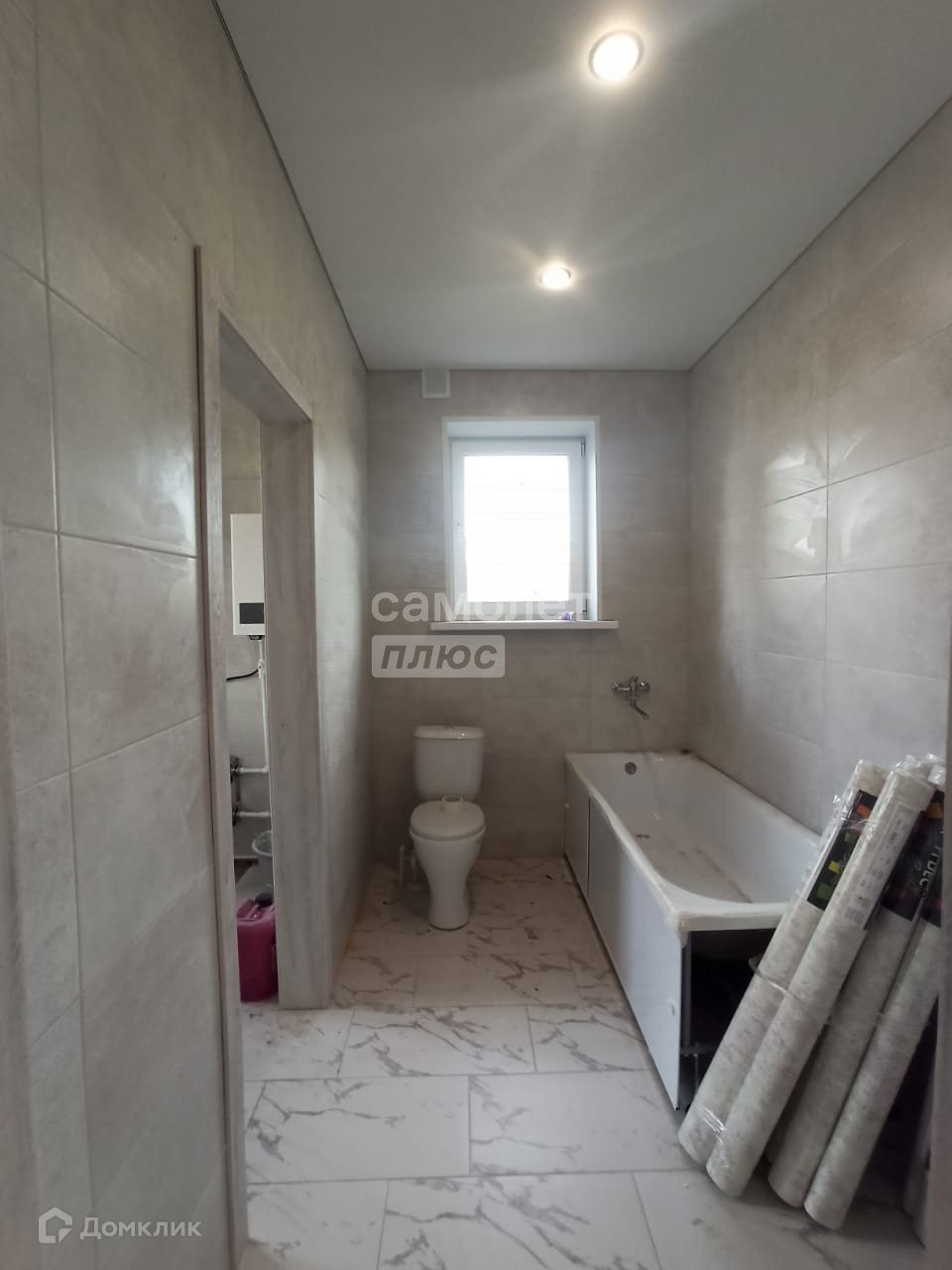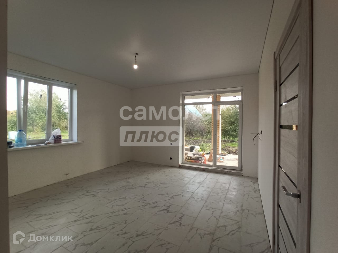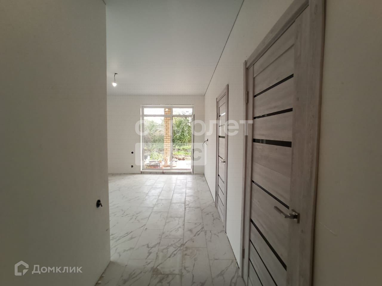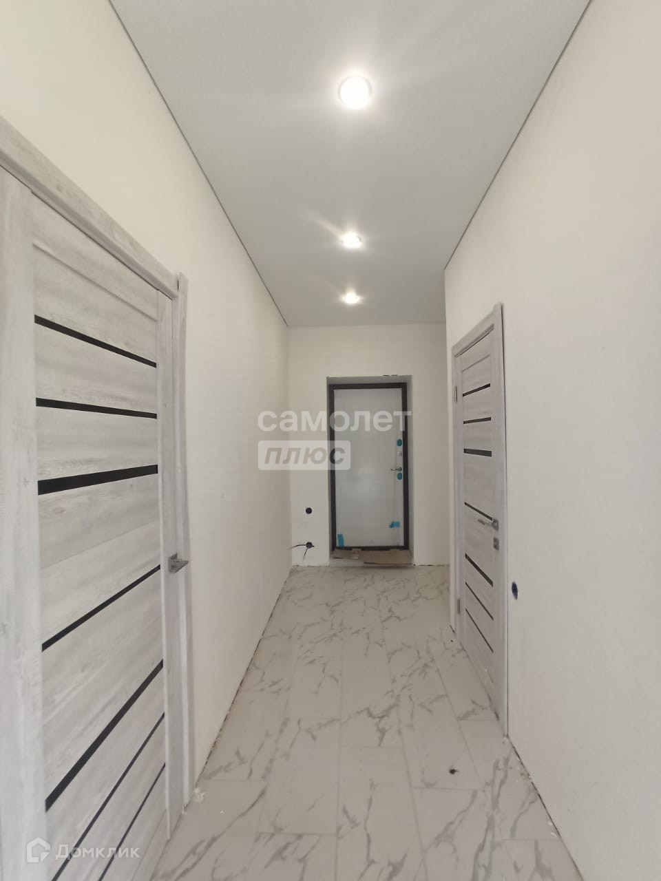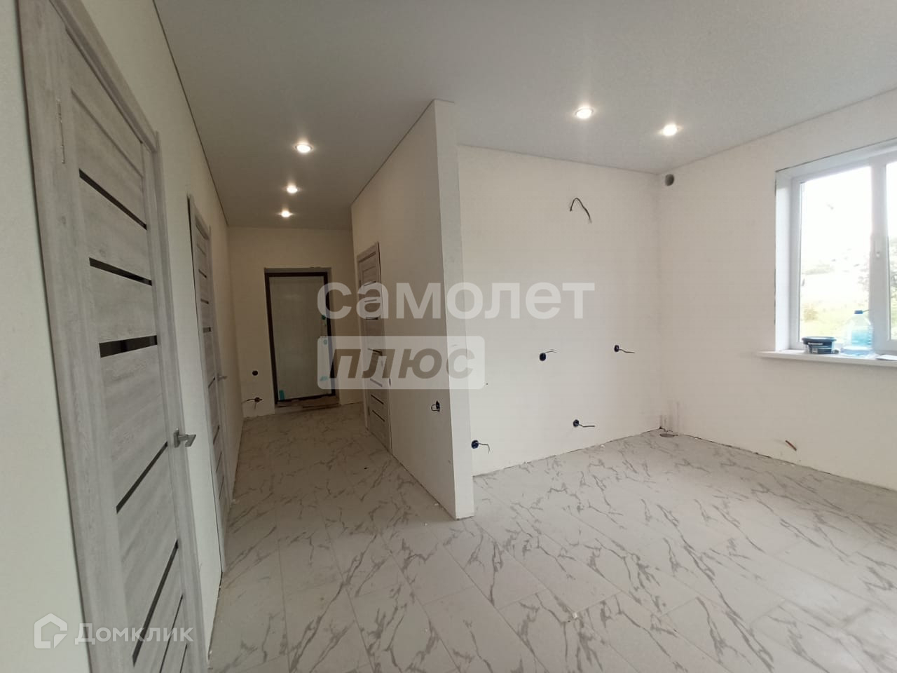 Чистовая отделка включает натяжные потолки, двери, ламинат в комнатах, плитка в коридоре и кухне-гостиной. В санузле на полу плитка.