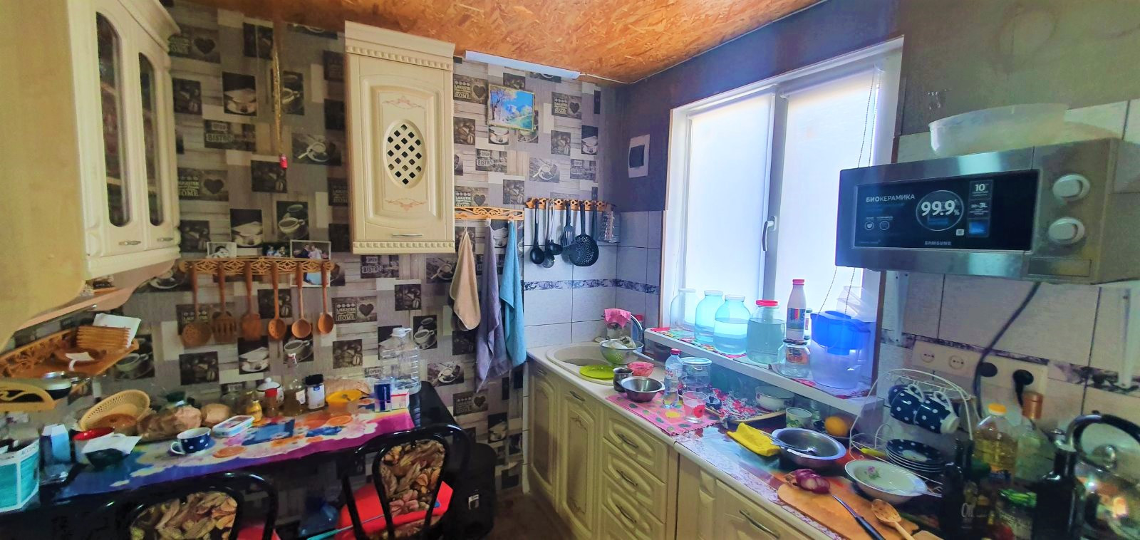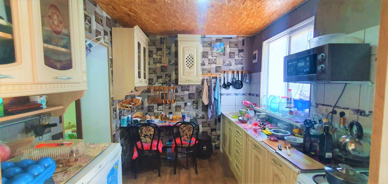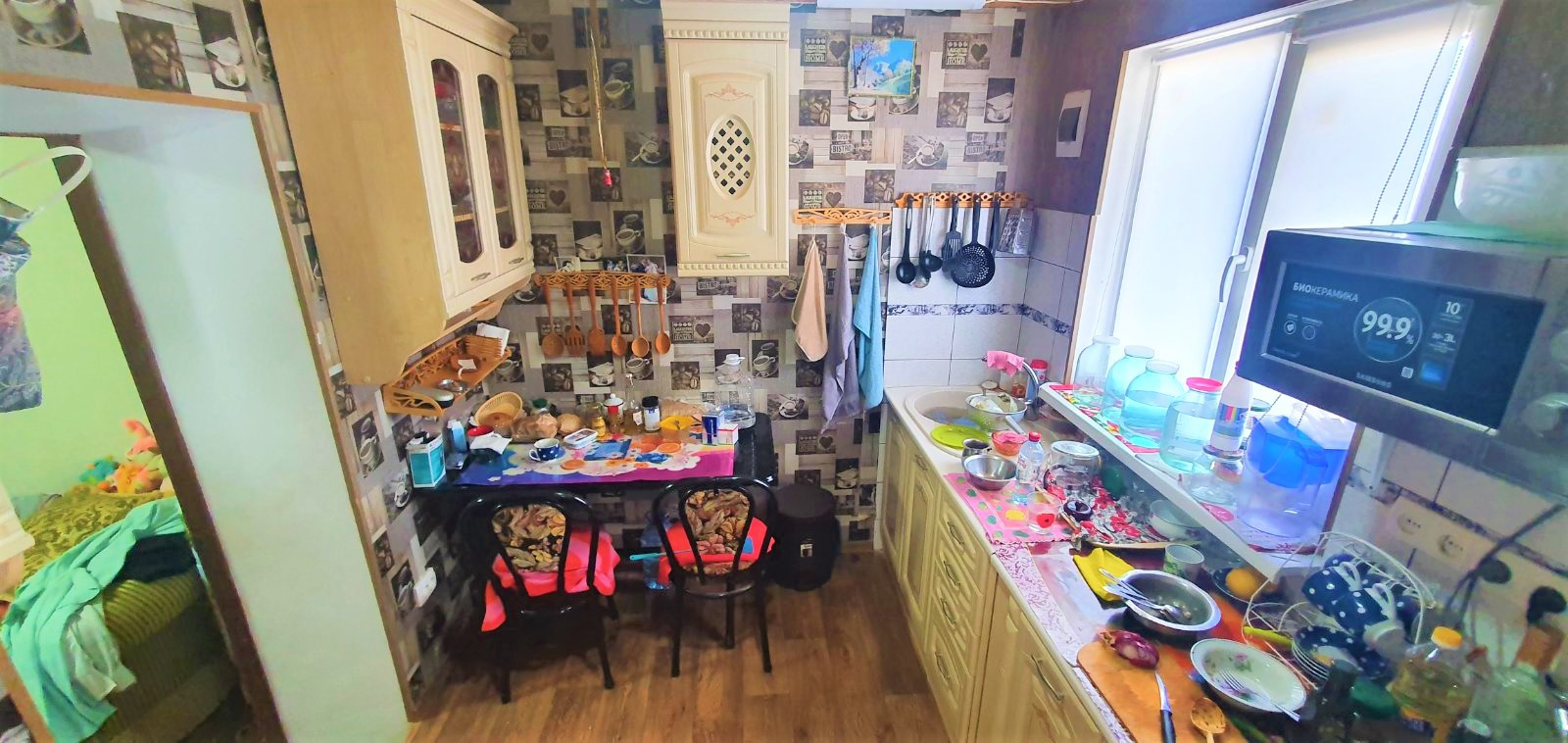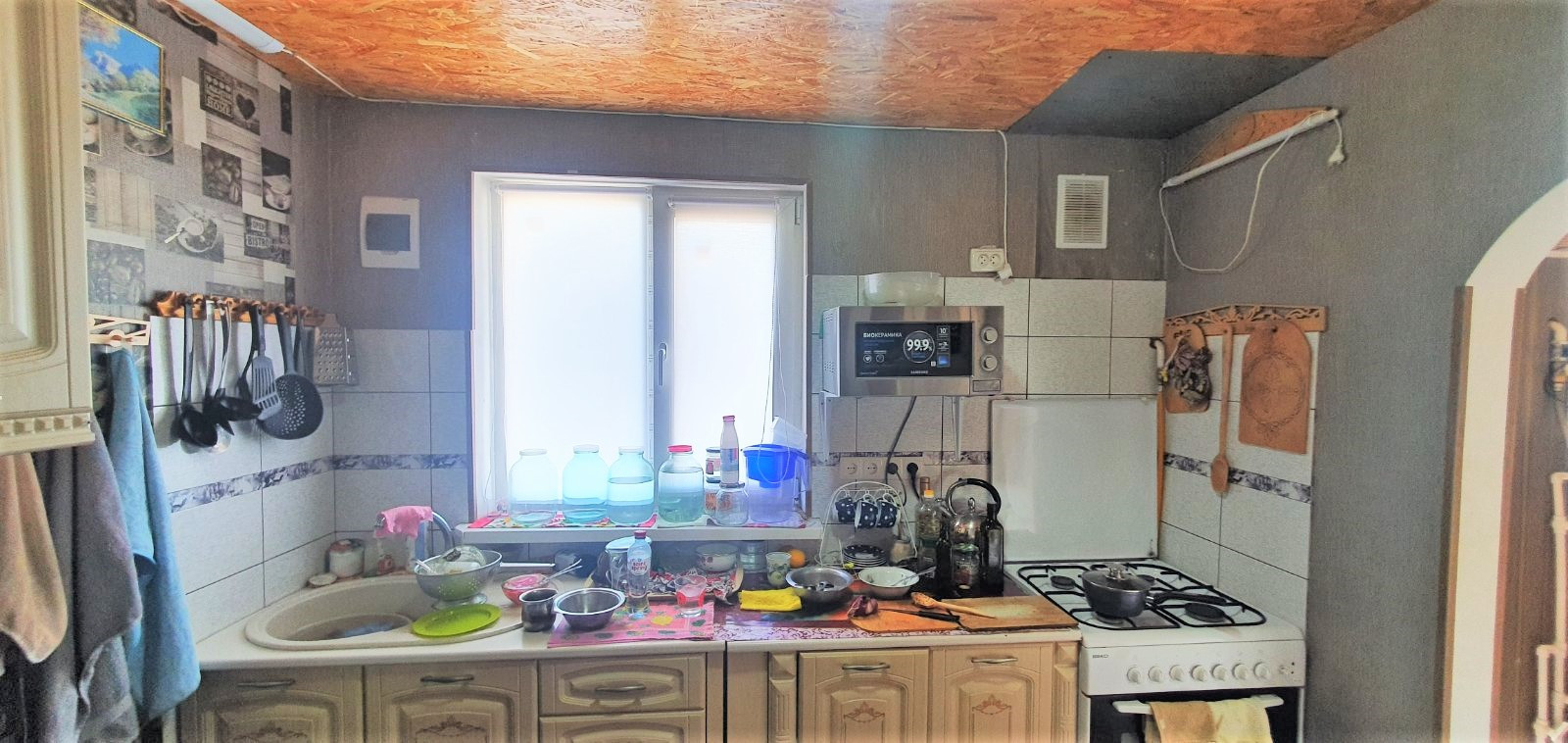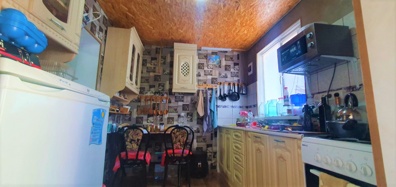 Кухня облицована плиткой и укомплектована мебелью и техникой.