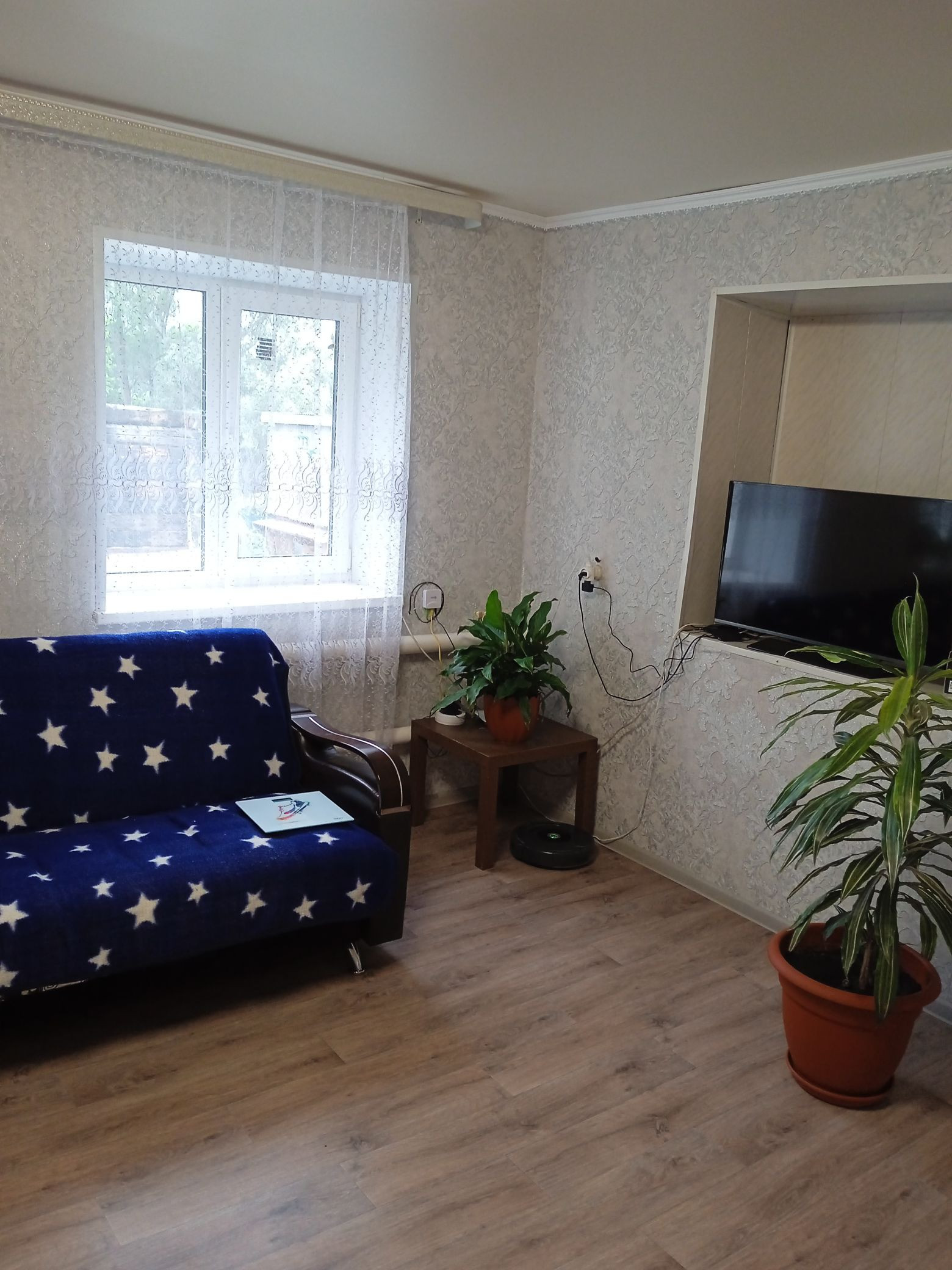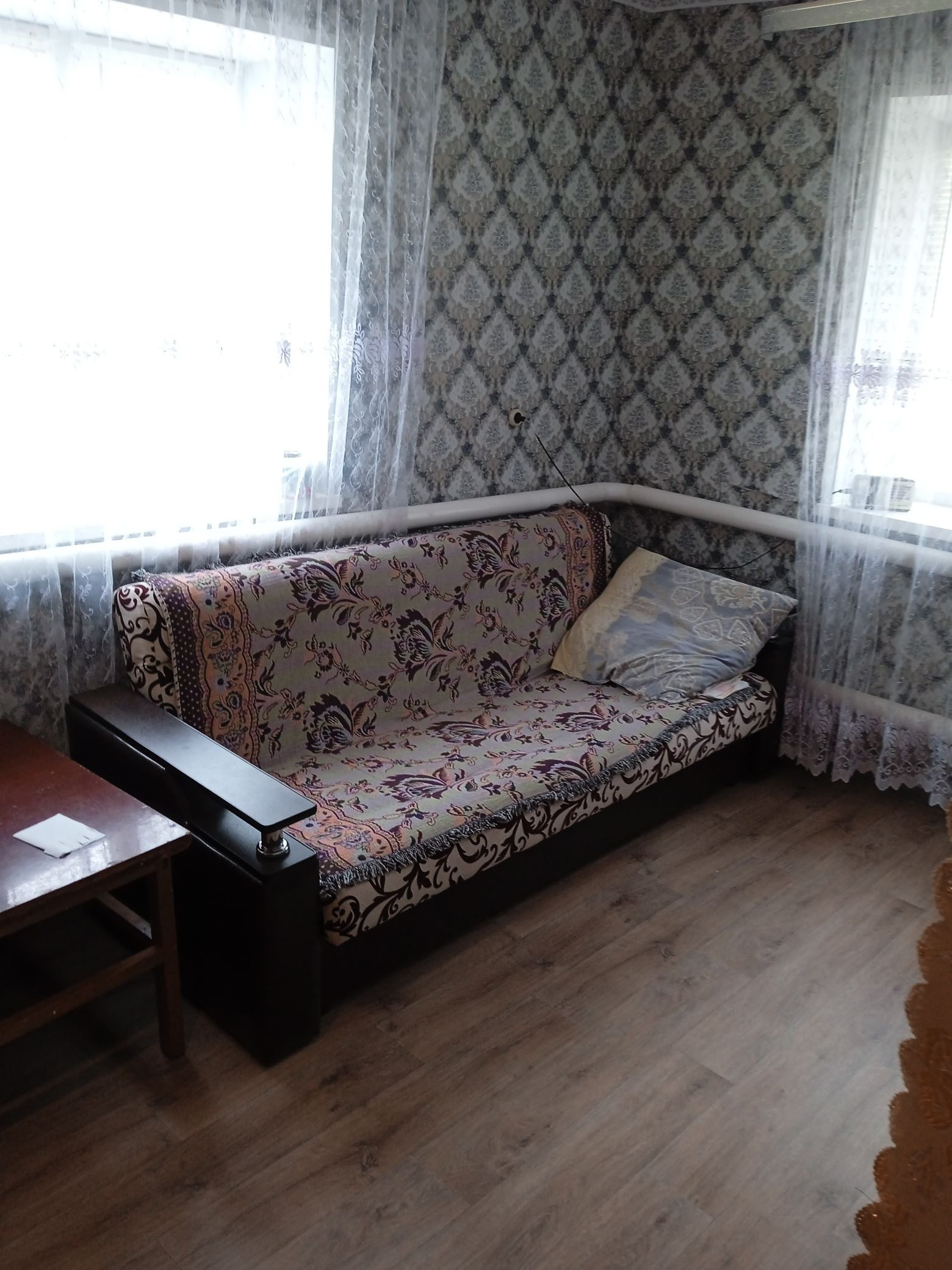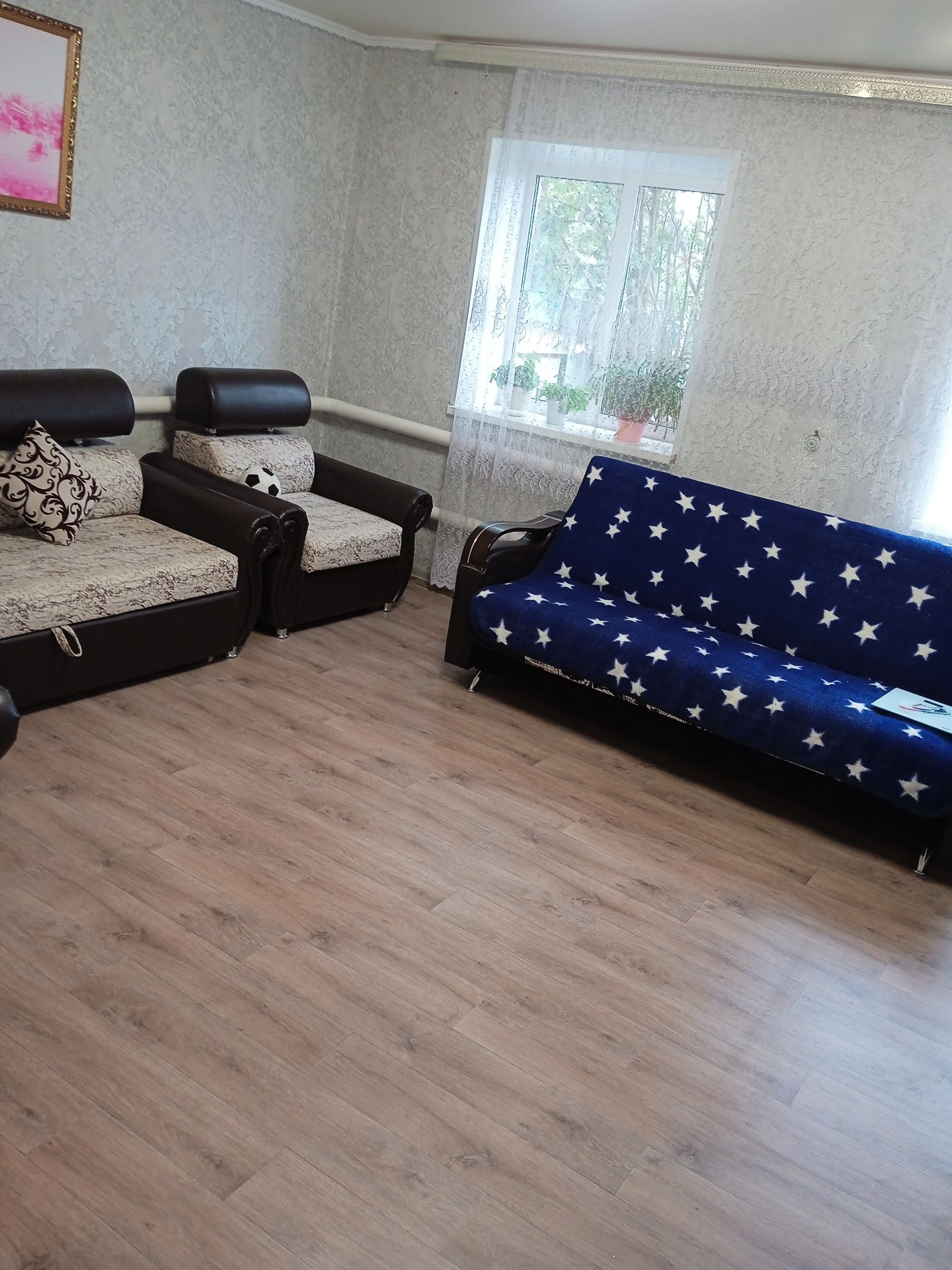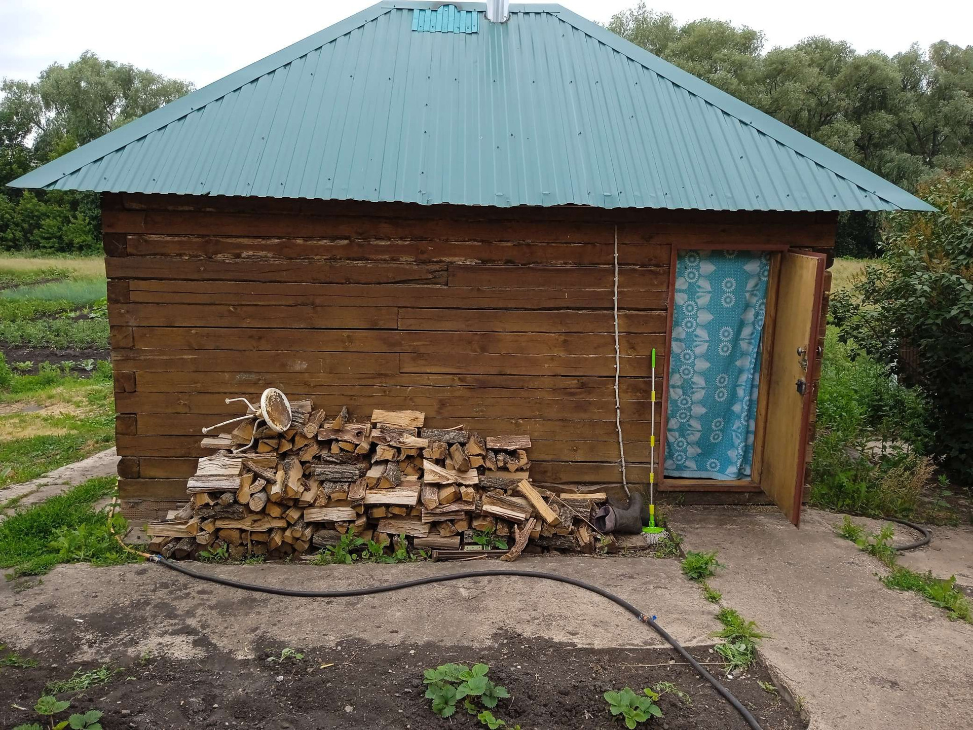 уютный дом в 15 км от города, автобусы ездят 3 раза в день. В доме: горячая и холодная вода, канализация. Есть насаждения, не достроенный гараж, баня, большой двор.