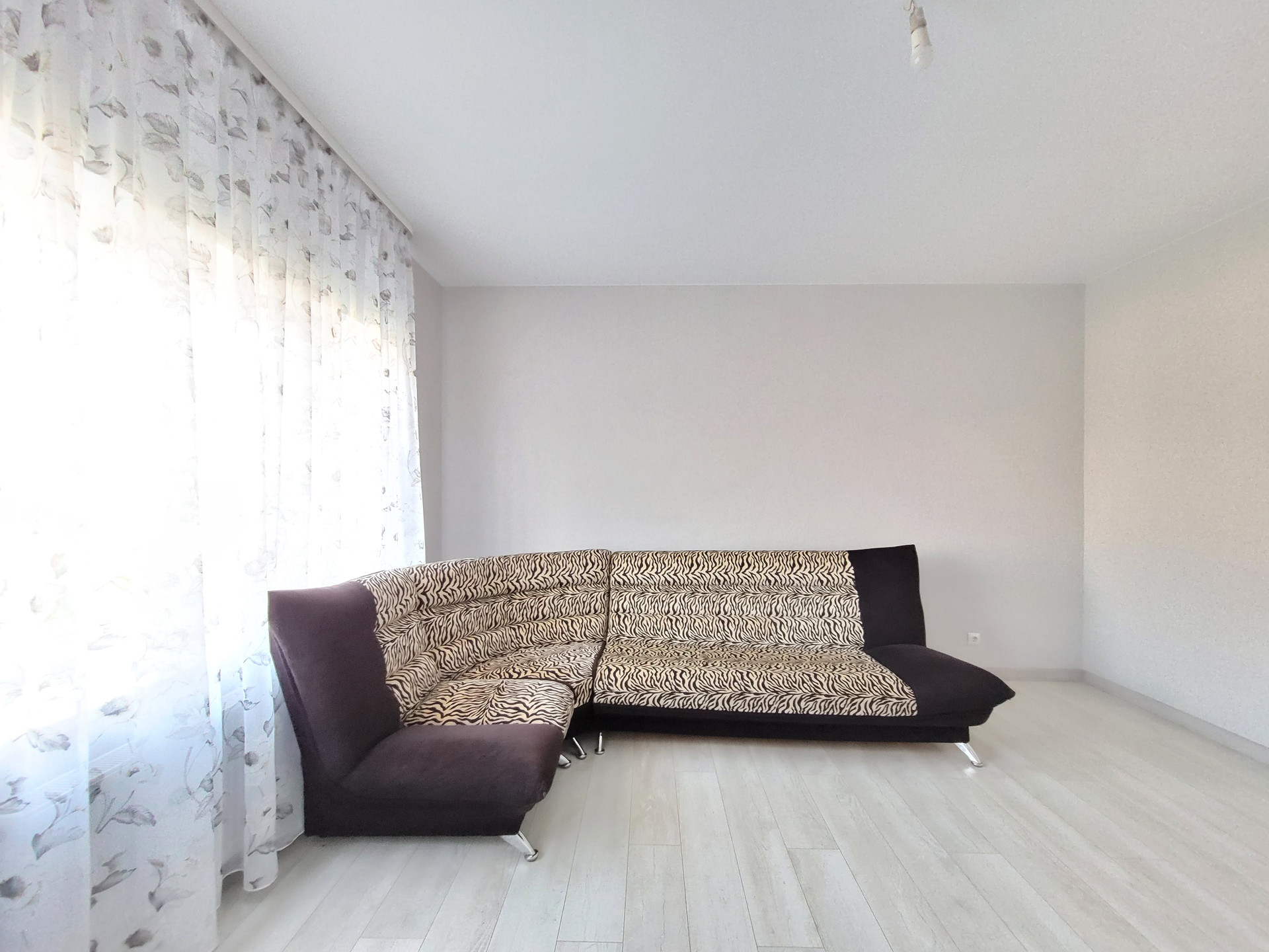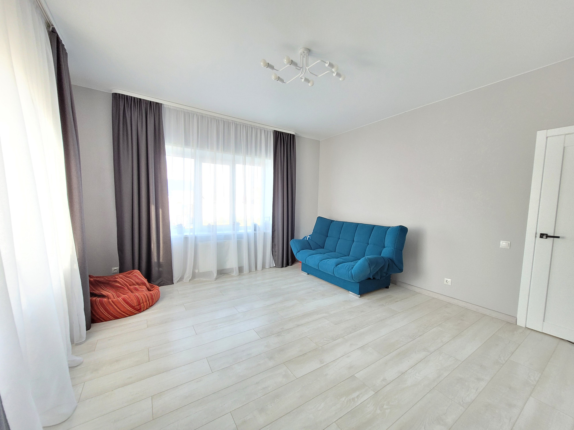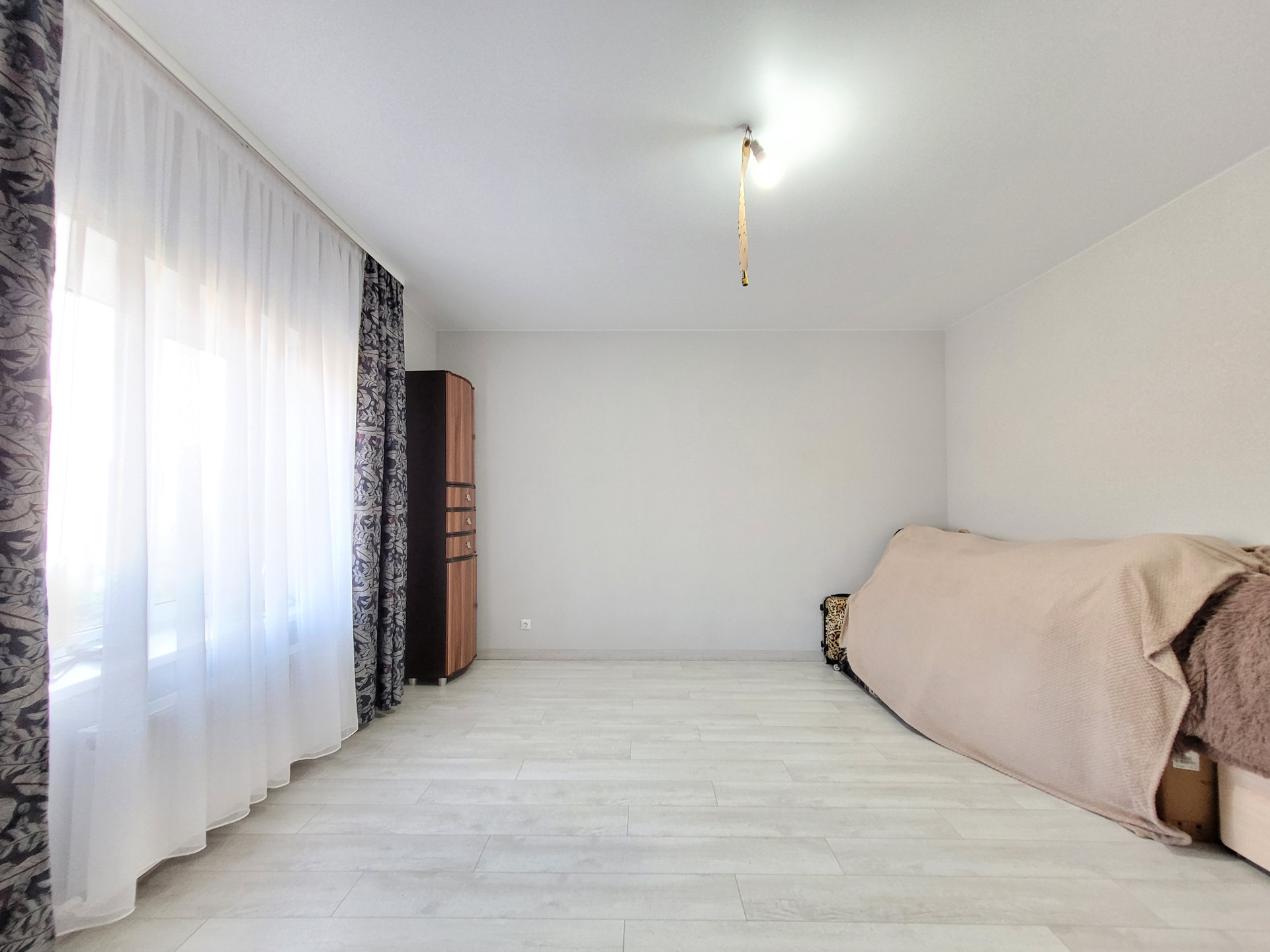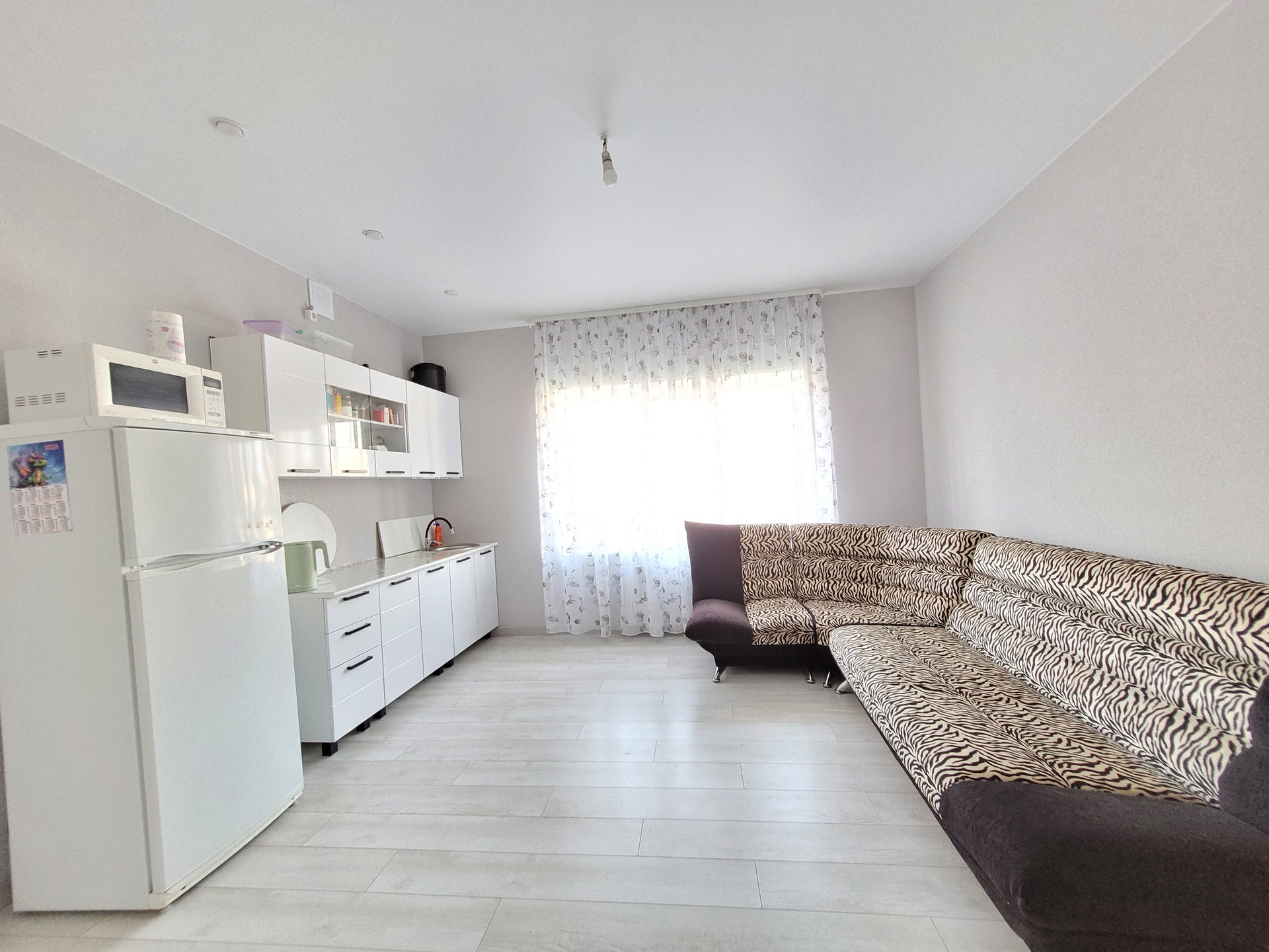 - Свежий Евроремонт: кафель под стилистику ламината в прихожей и санузле, ламинат в спальнях и кухне-гостиной, матовый натяжной потолок во всех помещениях, стены - короед