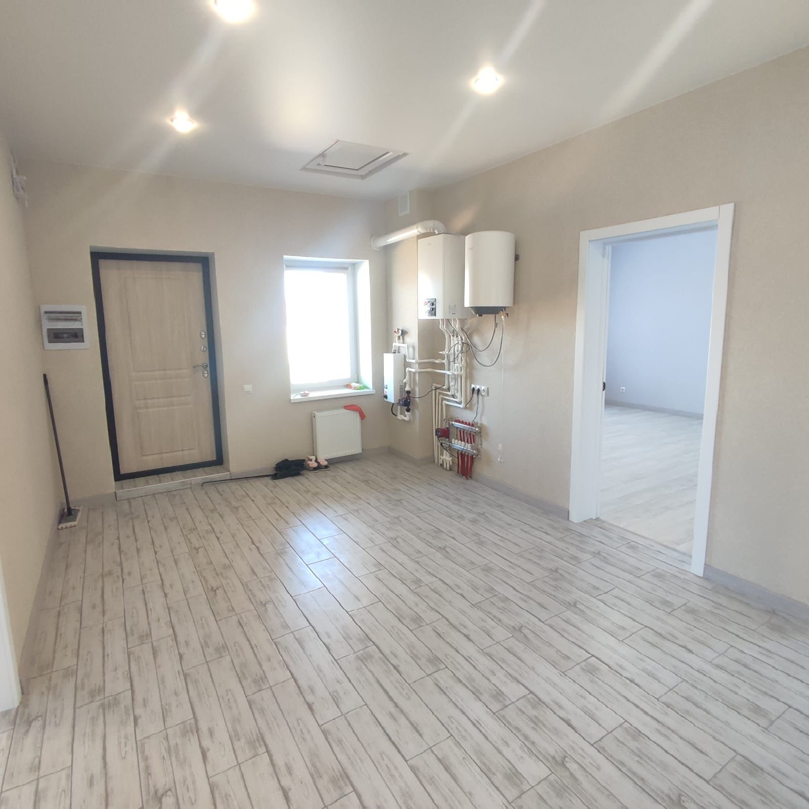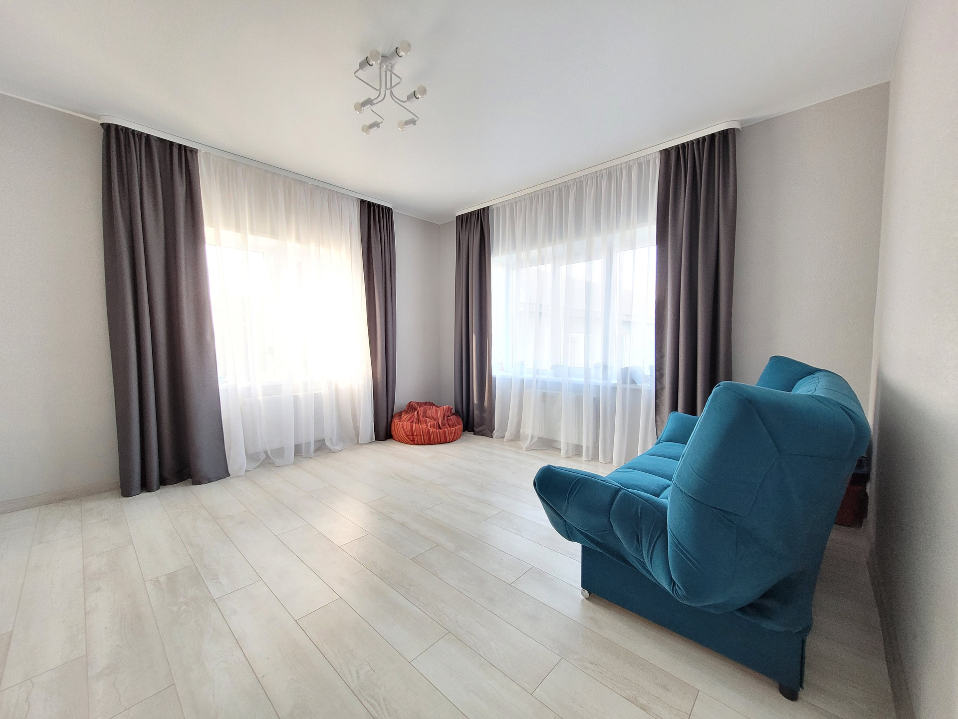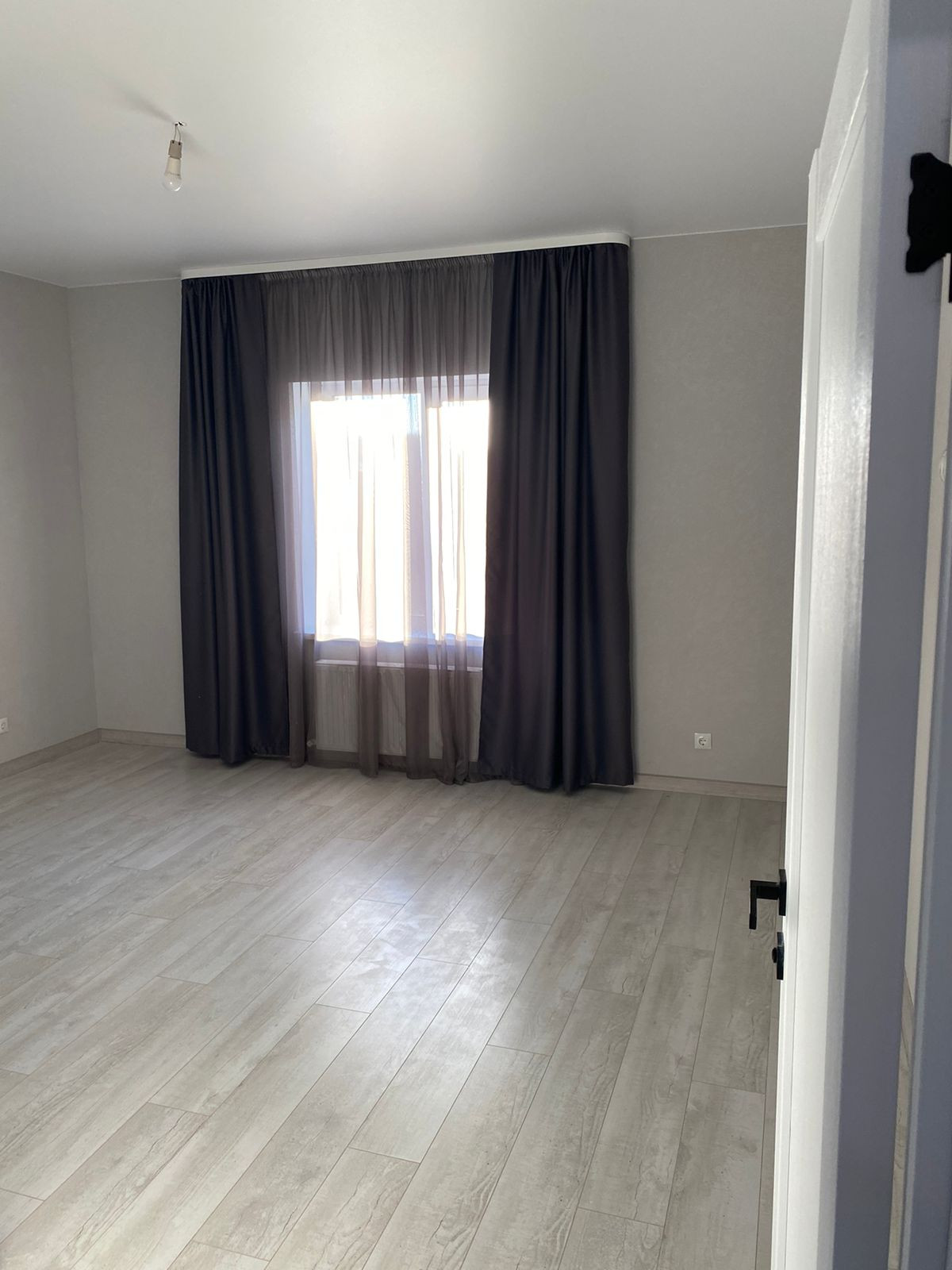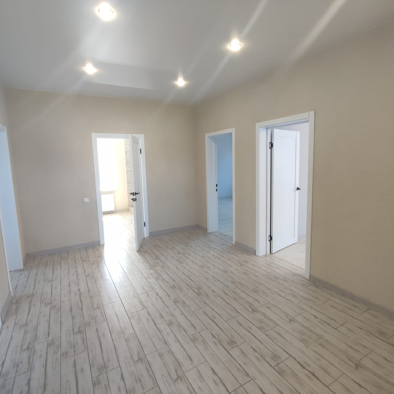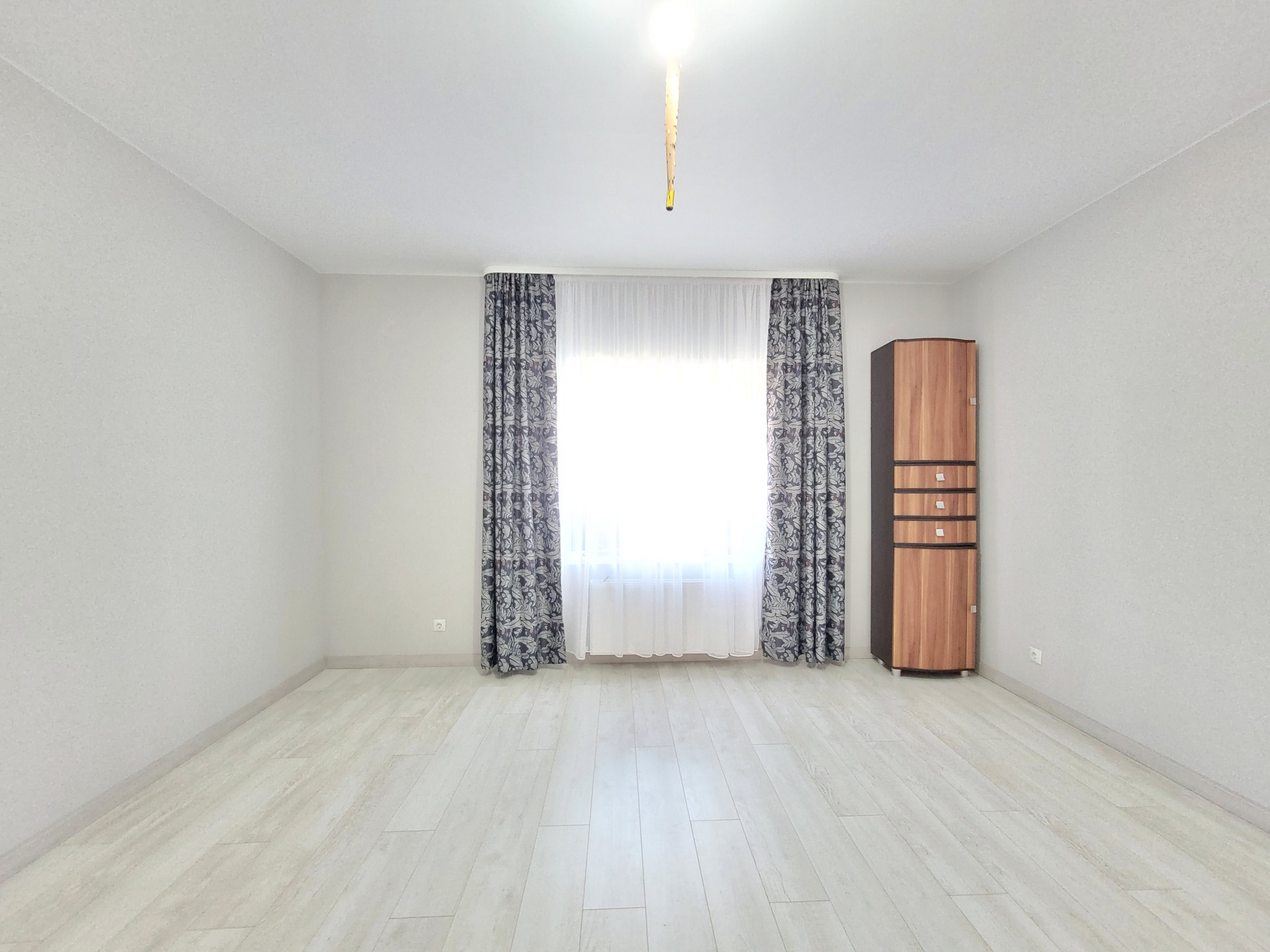 - Свежий Евроремонт: кафель под стилистику ламината в прихожей и санузле, ламинат в спальнях и кухне-гостиной, матовый натяжной потолок во всех помещениях, стены - короед