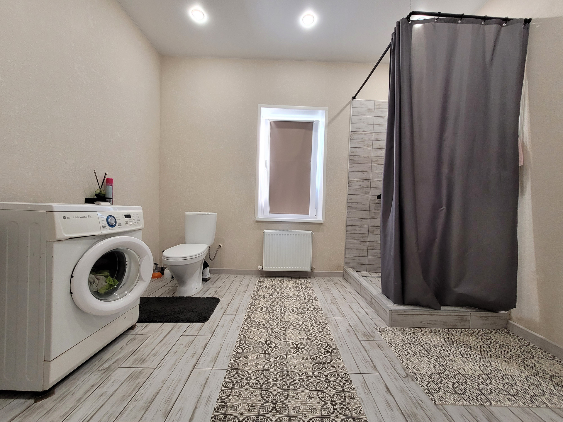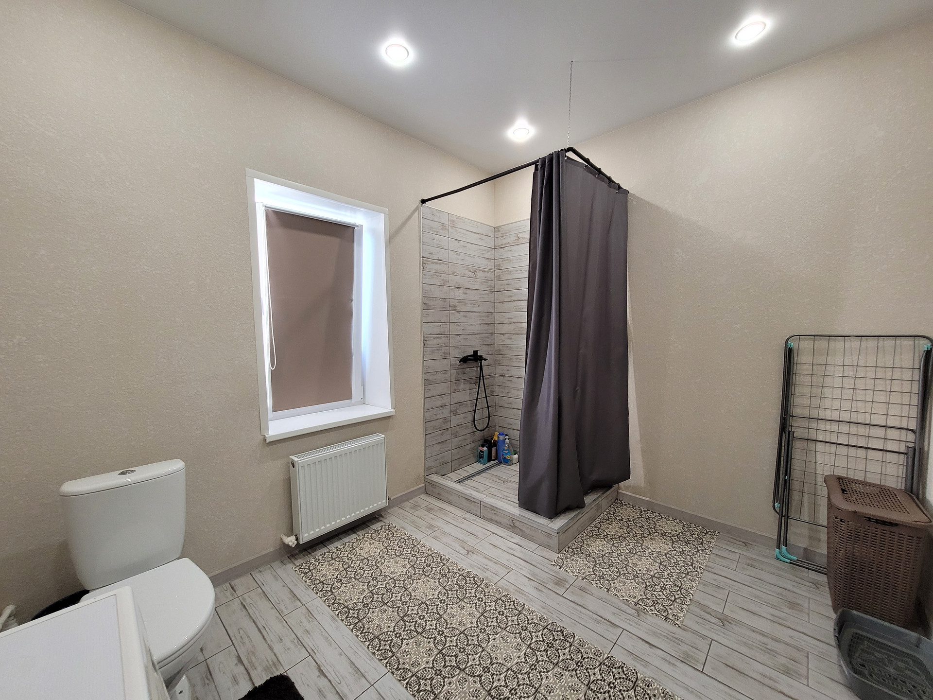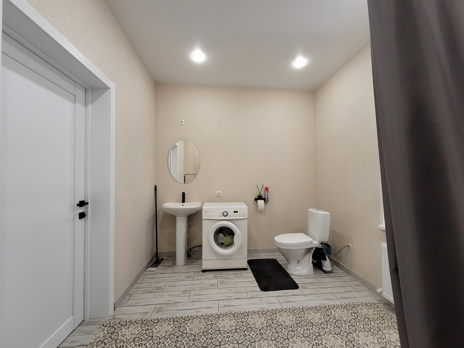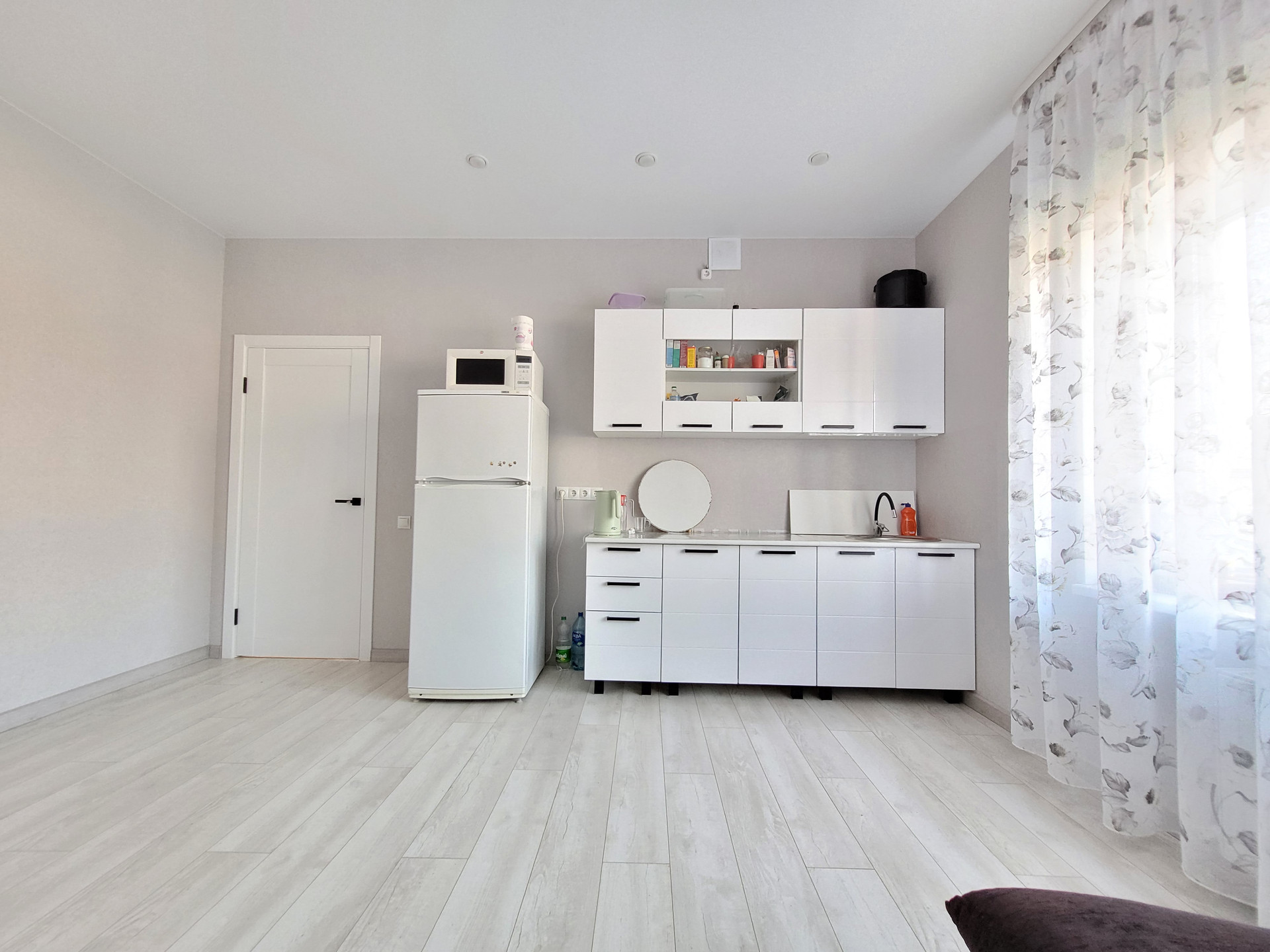 - Свежий Евроремонт: кафель под стилистику ламината в прихожей и санузле, ламинат в спальнях и кухне-гостиной, матовый натяжной потолок во всех помещениях, стены - короед