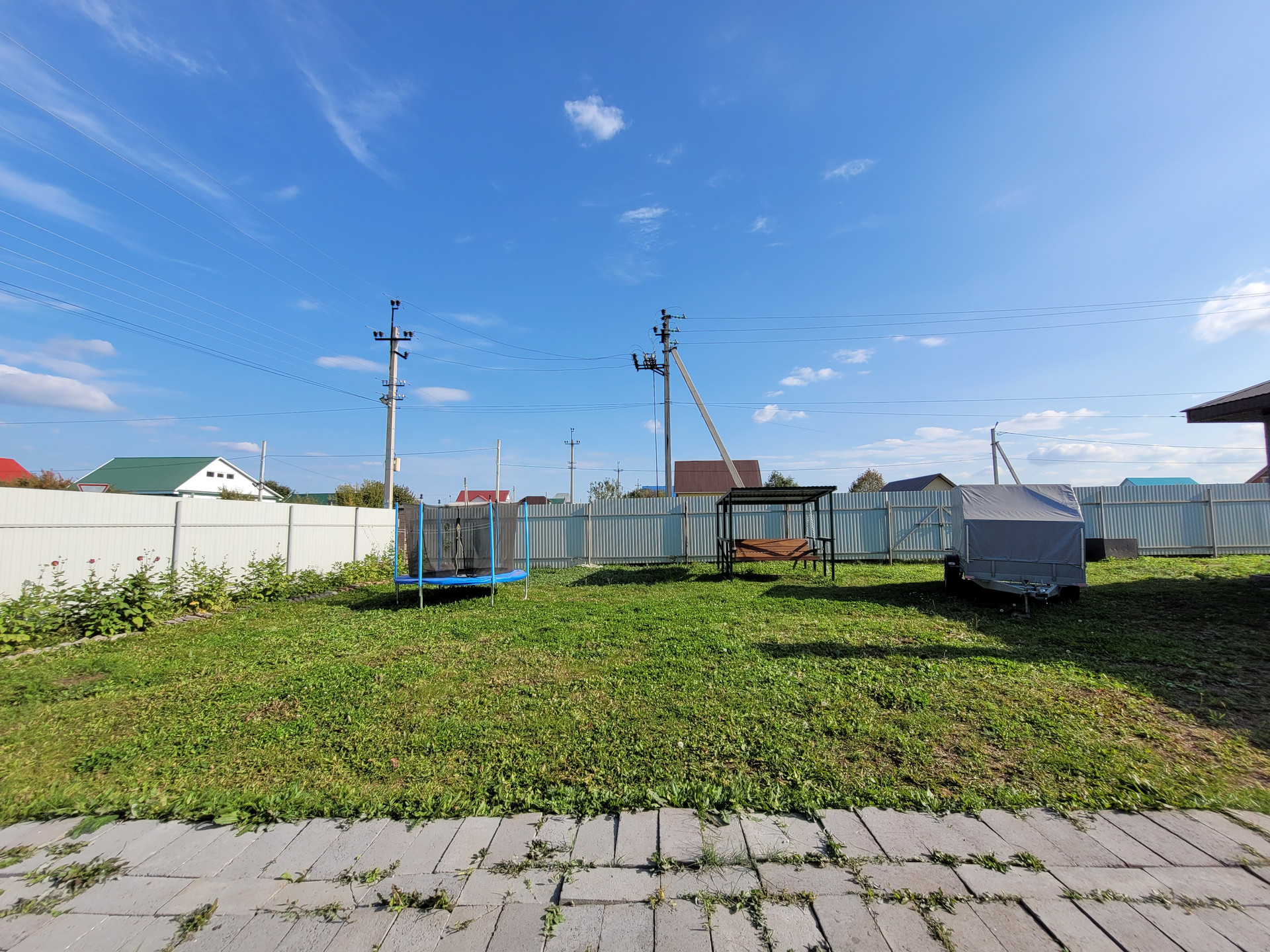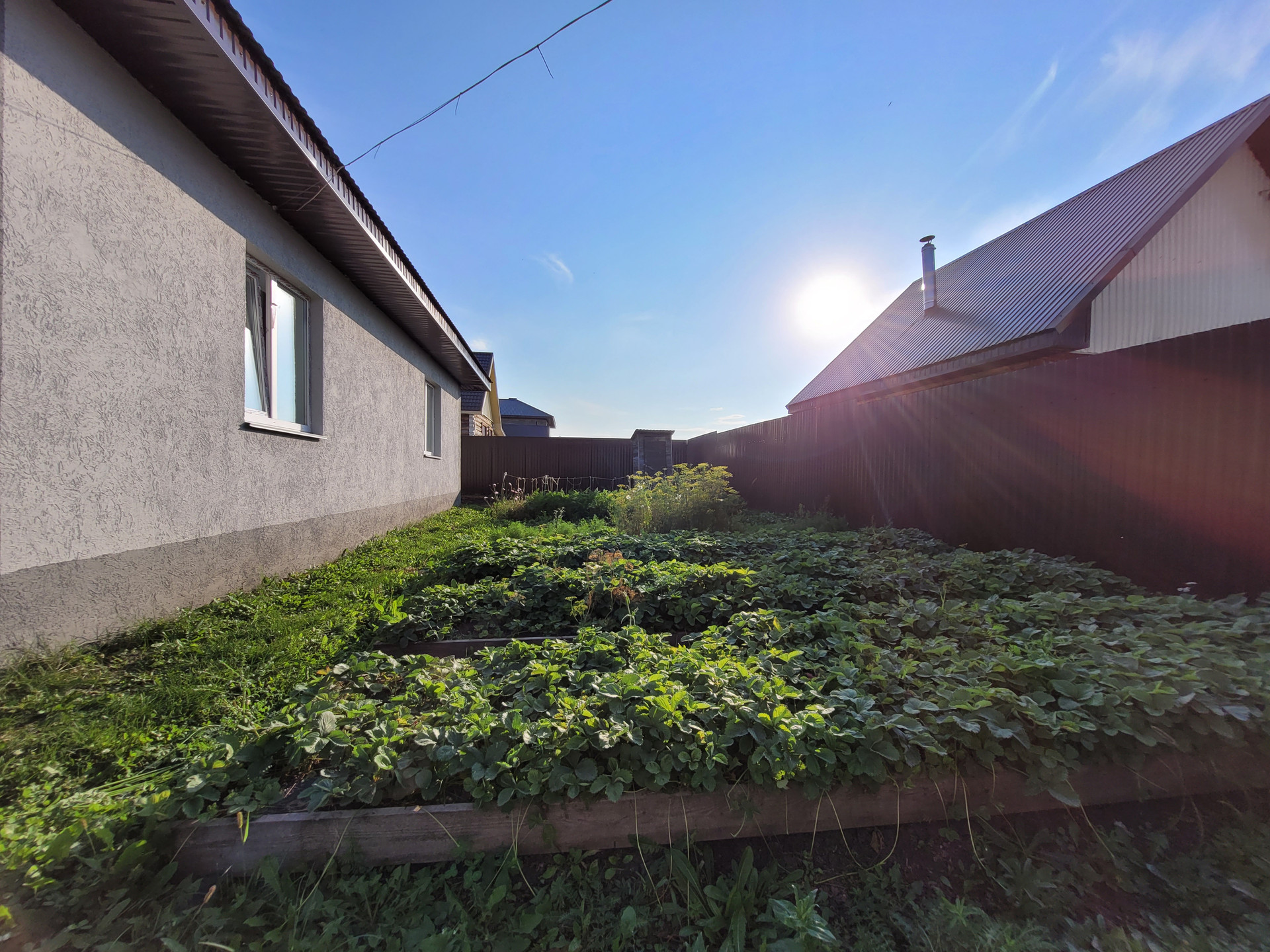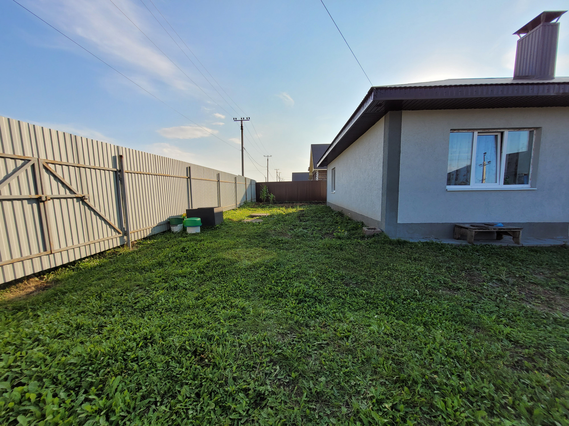 - По периметру участка забор из профнастила с воротами для въезда автомобиля и калиткой.