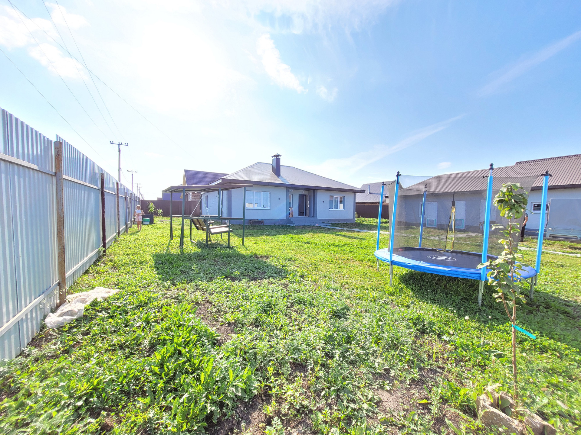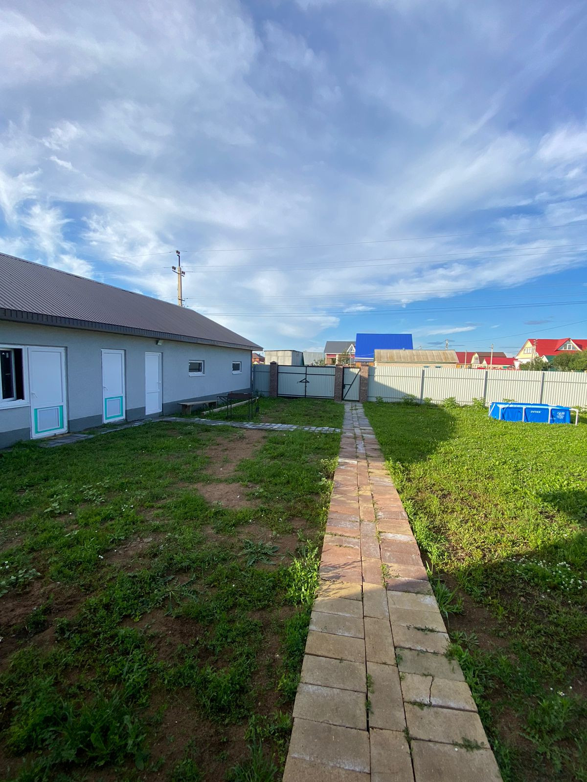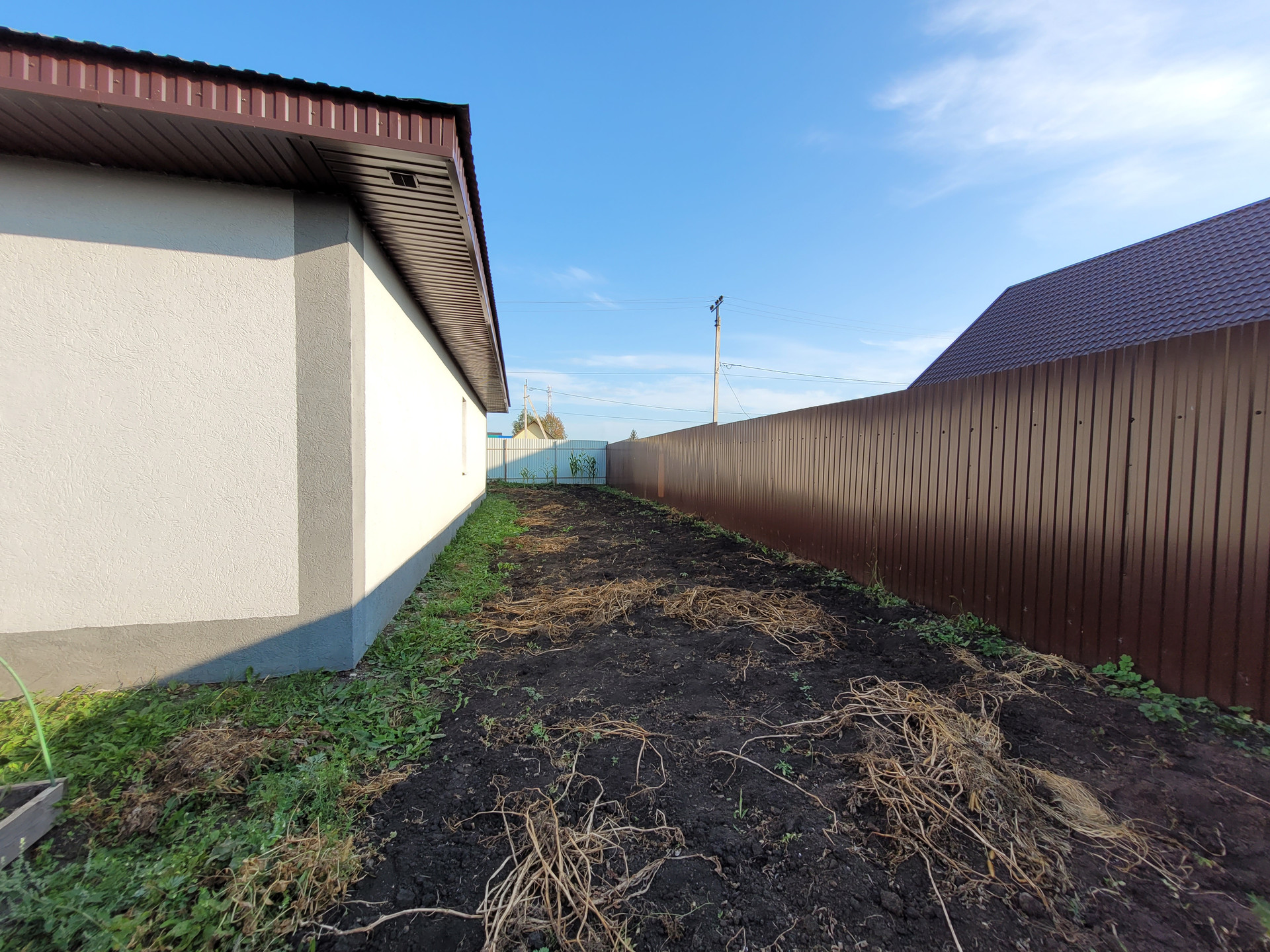 - По периметру участка забор из профнастила с воротами для въезда автомобиля и калиткой.