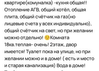 Комната в 3хкомнатной квартире(комуналка) -кухня общая!! Отопление АГВ, общий котёл, общая плита, общий счётчик на газ(но лицевые счета у всех индивидуально), общий счётчик на свет, но при желании можно отдельно! ☺️Комната 18кв.теплая- очень! 2этаж, двор имеется! Туалет пока на улице, но при желании можно и в доме! ( есть и место и старая канализация... |