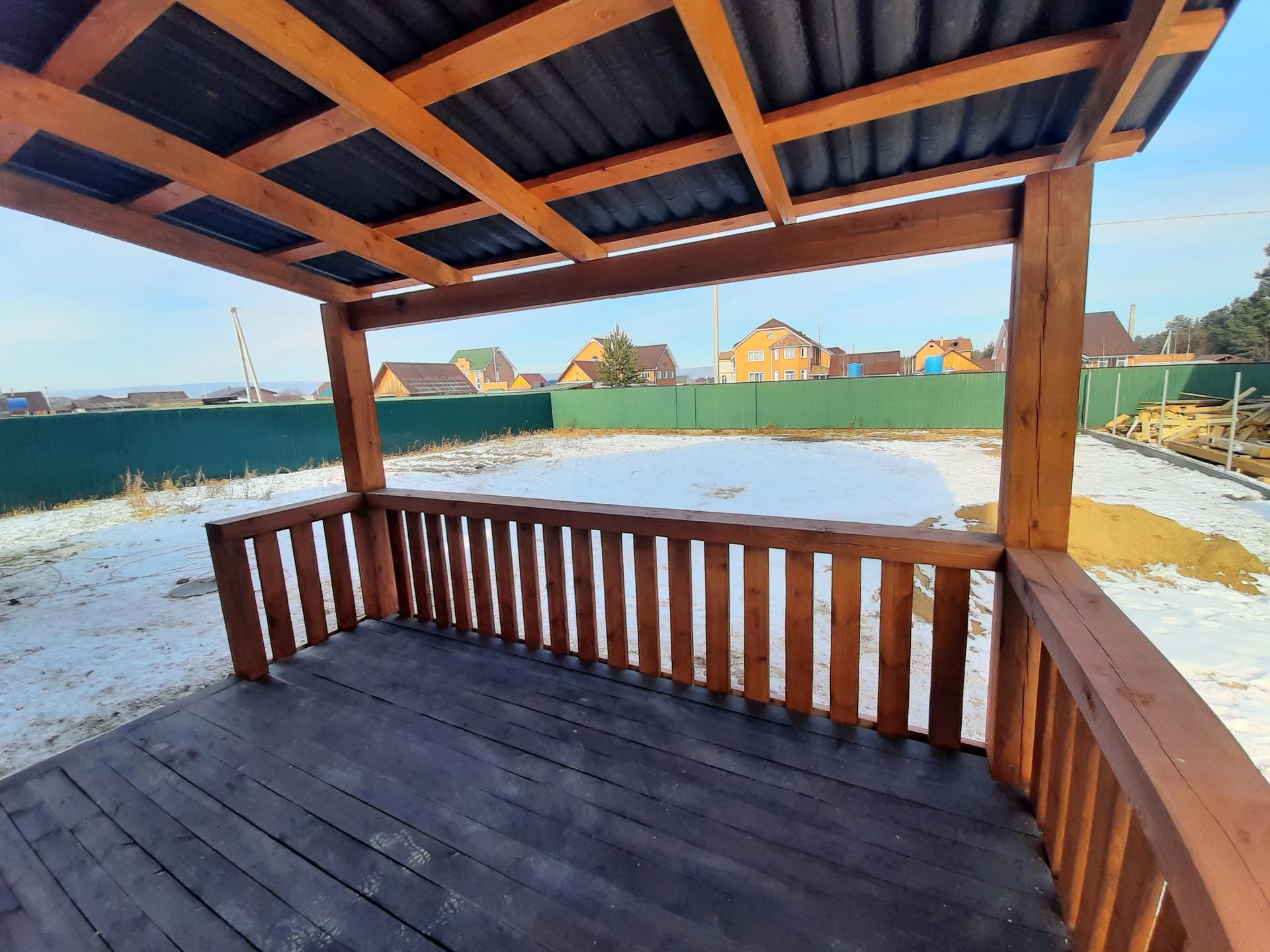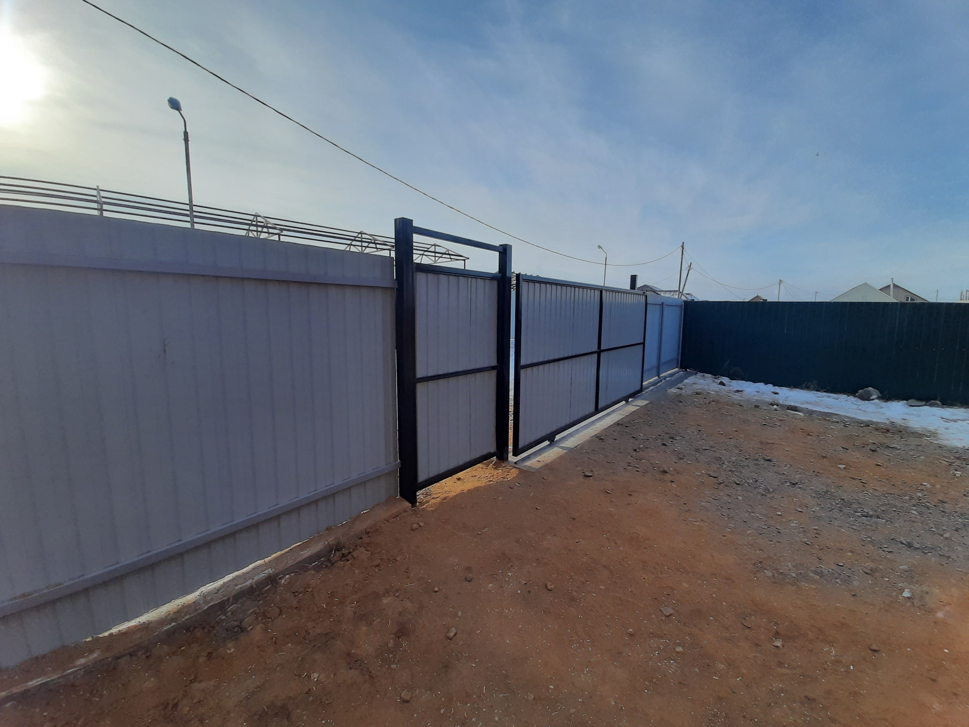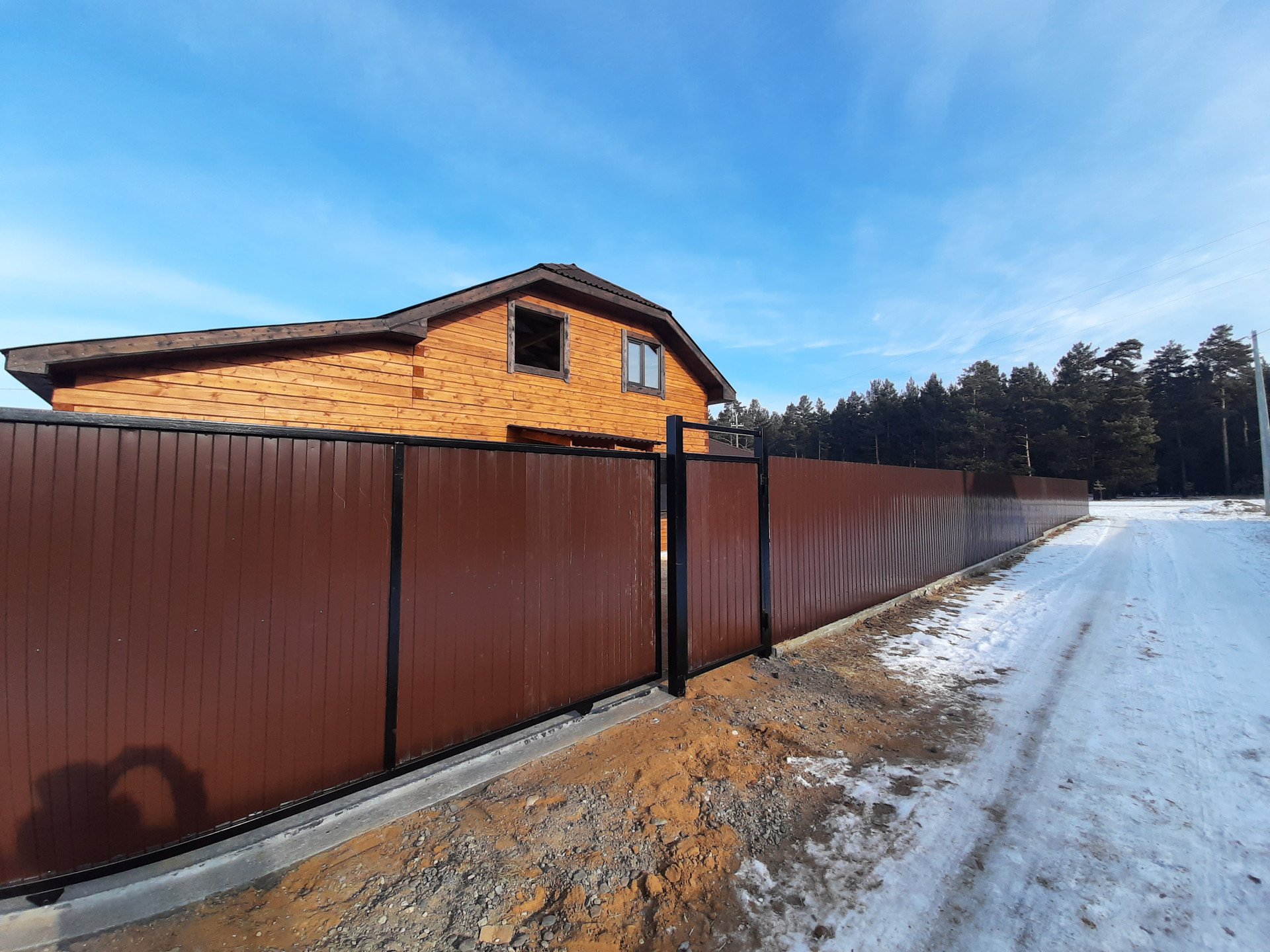 Участок огорожен забором на фундаменте из профлиста, откатные ворота.
