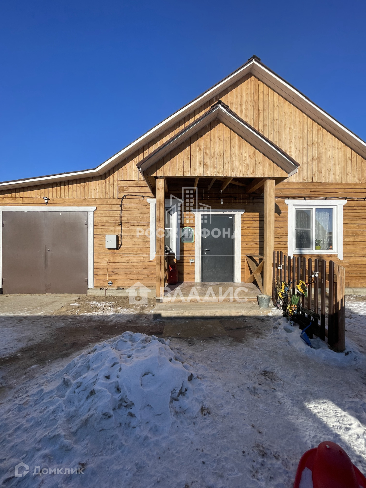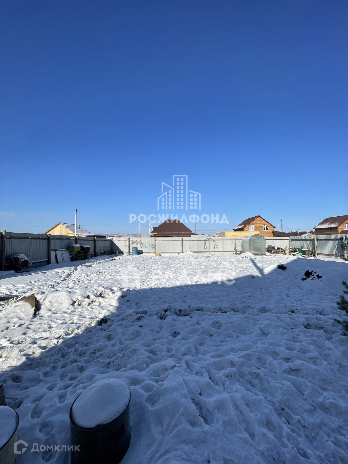 Участок огорожен с трех сторон деревянным забором, первая линия - профлист с откатными воротами.