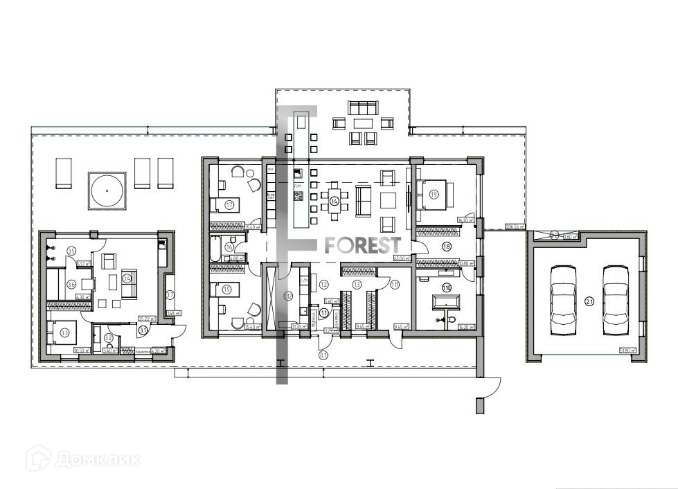 2 спальные комнатыМастер - спальня с с/у и гардеробнойКухня-гостиная3 с/уКотельнаяКоридор2 гардеробныеТеррасаБаняГараж на 2 машины