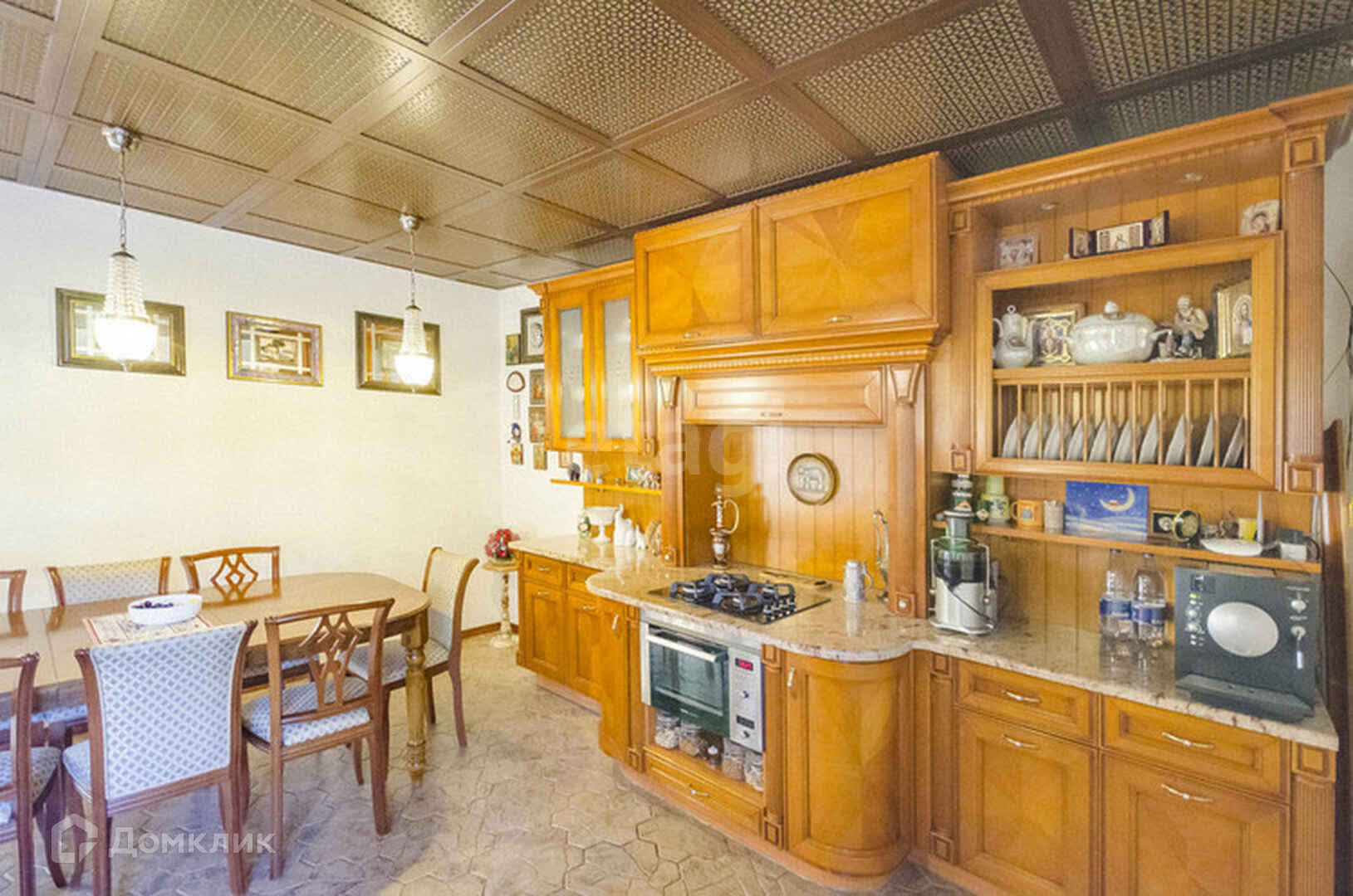 Столовый зал с гарнитурном из натурального ясеня и мраморными столешницами;
