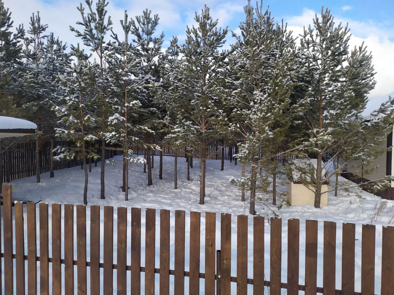Угловой участок с сосновым лесом, мимо никто не ездит.