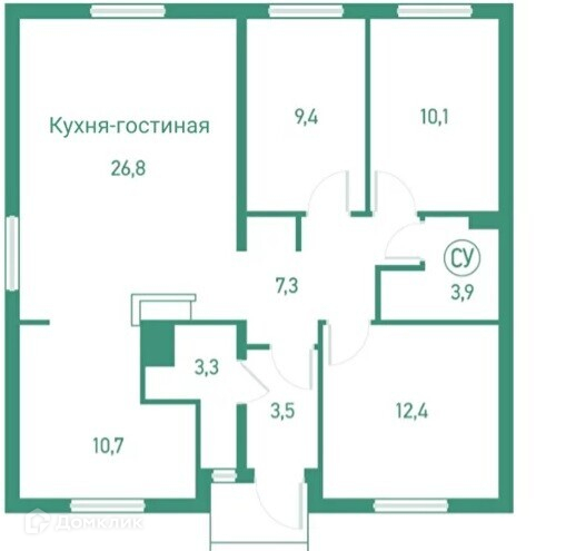 Три спальни, кухня-гостиная, санузел, котельная и прихожая.