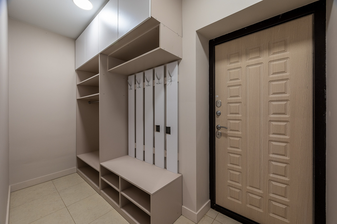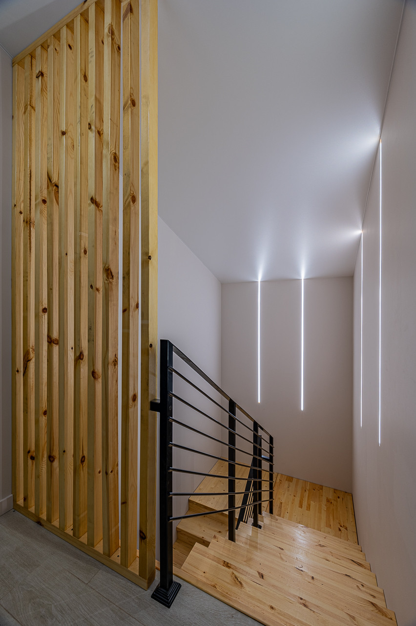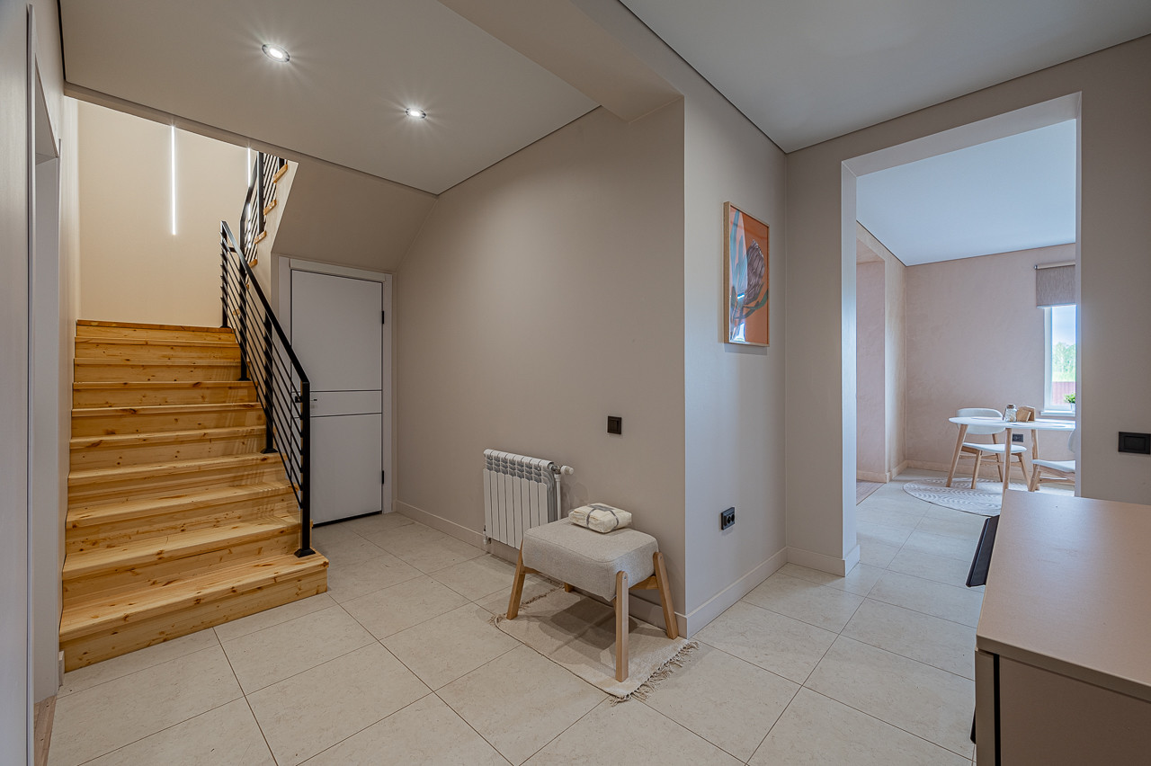 Лестница на второй этаж, под ней можно организовать дополнительное место хранения + лестница в цокольный этаж .