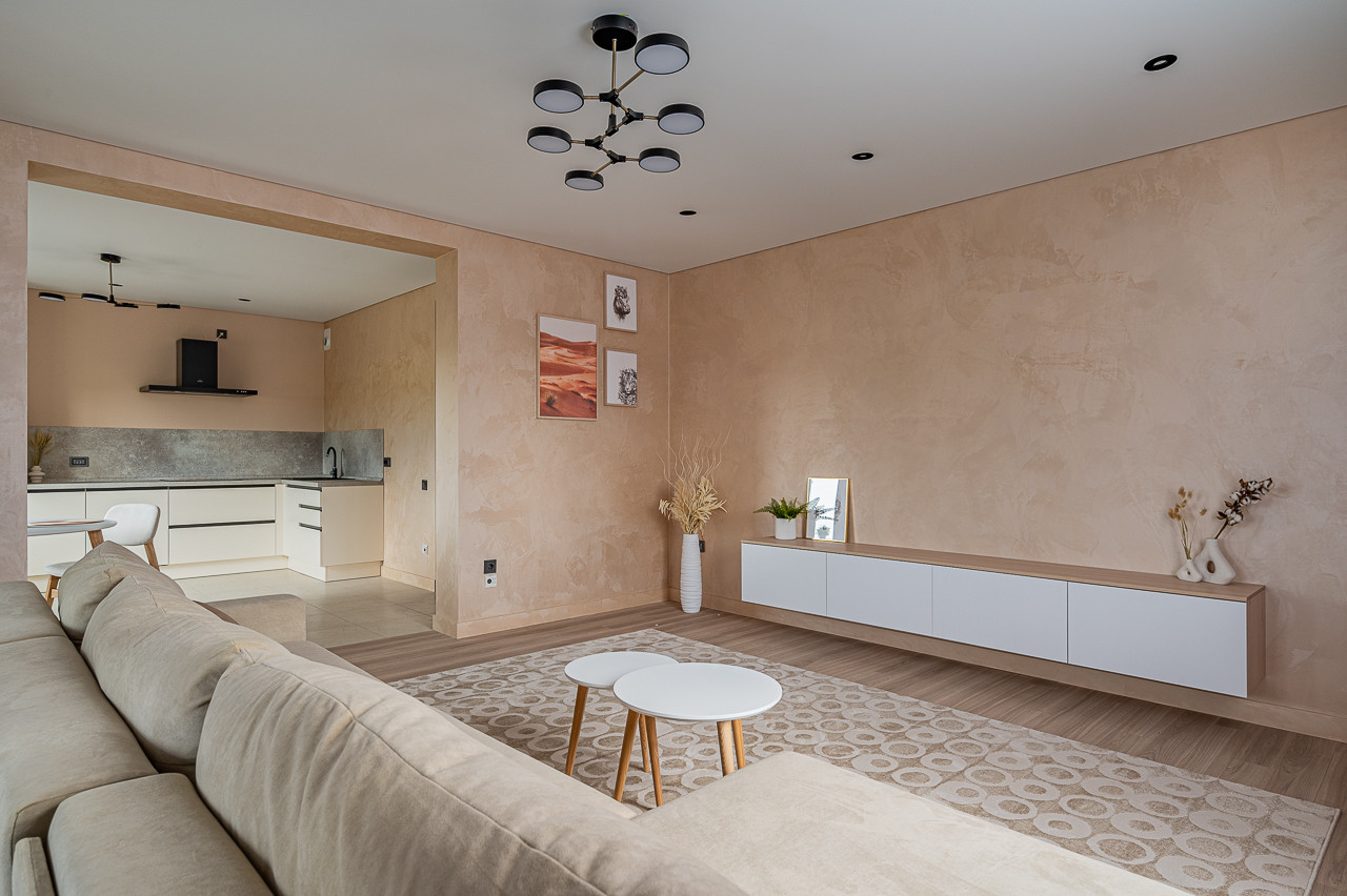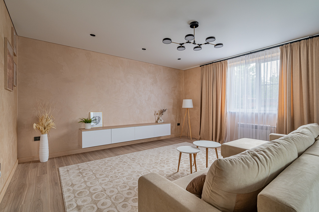 Отделка : декоративная штукатурка и покраска . Кафель, керамогранит керама марацци. На полу ламинат хорошего качества.