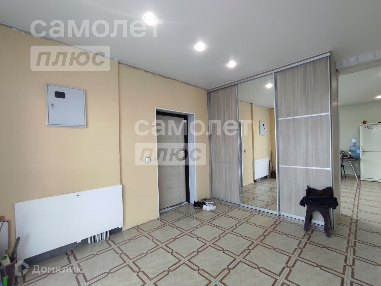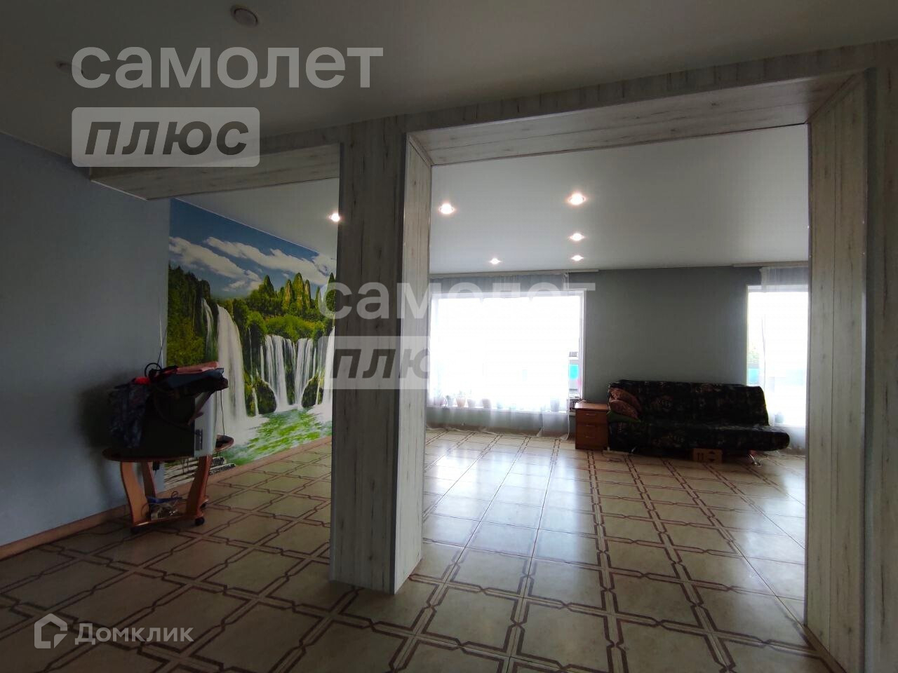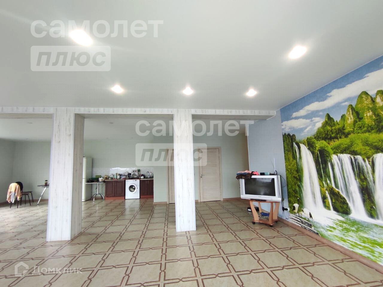 Пол по всему первому этажу выложен плиткой. Оформлены плинтусами. Стены выровнены, оштукатурены и оклеины обоями. Потолки натяжные с точечными светильниками.