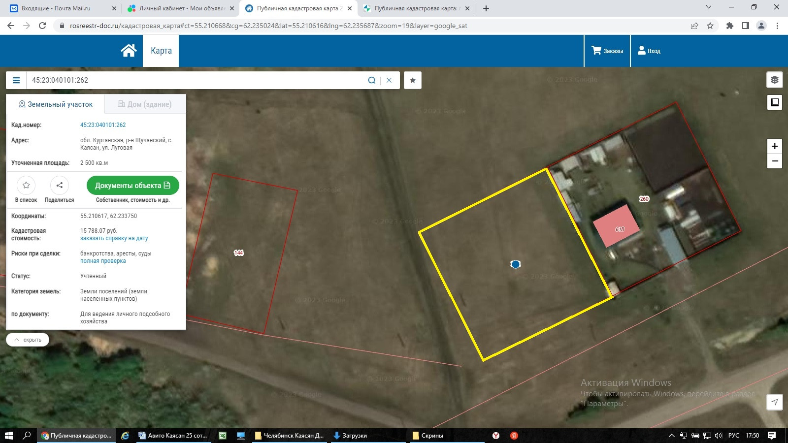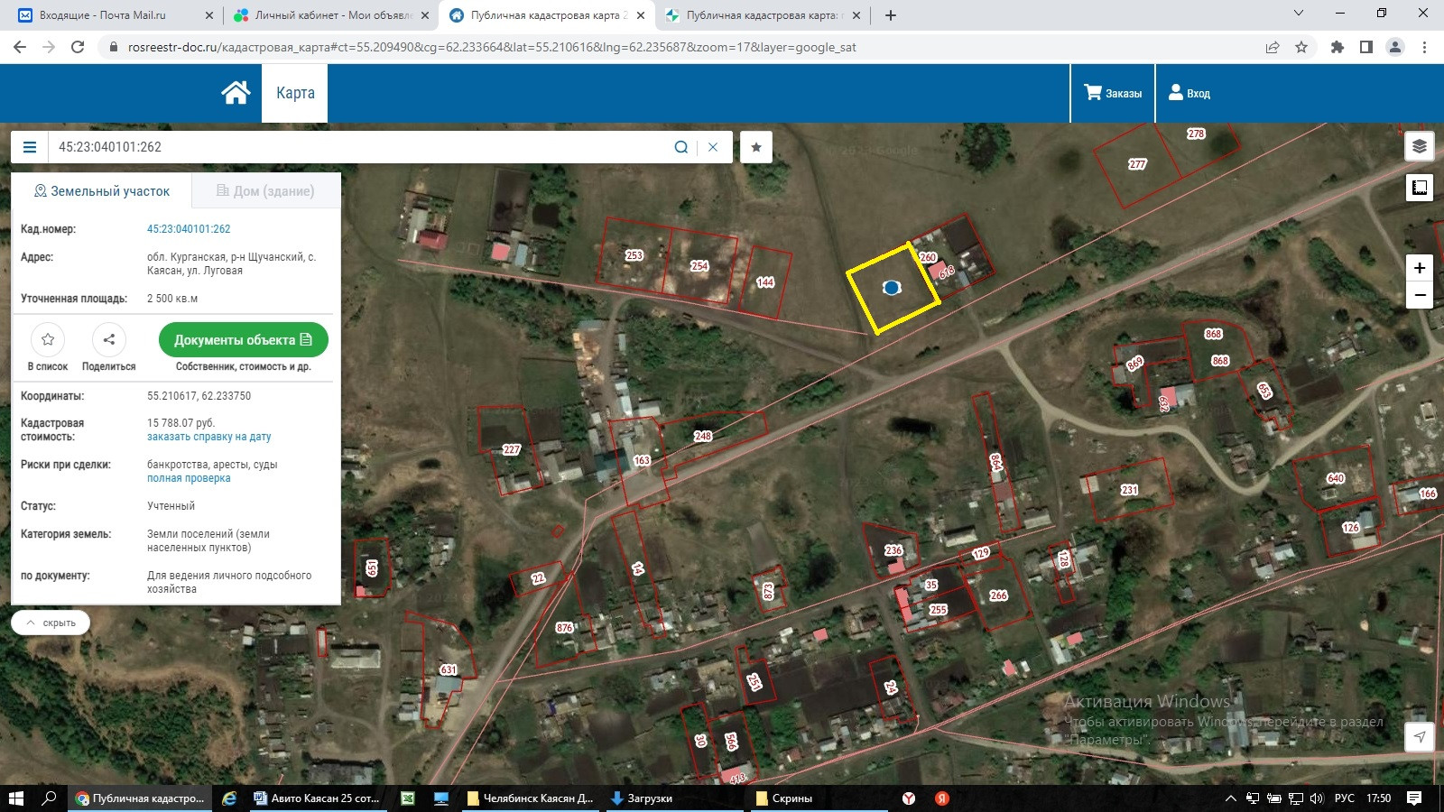 От собственника продаётся земельный участок площадью 2500 кв.м, для строительства индивидуального жилого дома с возможностью регистрации в нём. Кадастровый номер участка 45:23:040101:262  Адрес: Курганская обл, Щучанский р-н, с. Каясан, ул. Луговая. Координаты участка на Яндекс карте/навигаторе  55.210645, 62.235706  Метка на карте здесь соответствует действительности, участок виден на ПКК и на снимках, просьба осмотр провести самостоятельно. Без обременений. Торг, ипотека, рассрочка возможны.