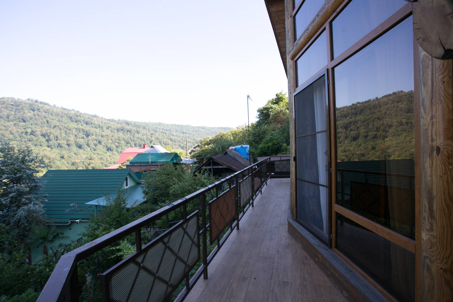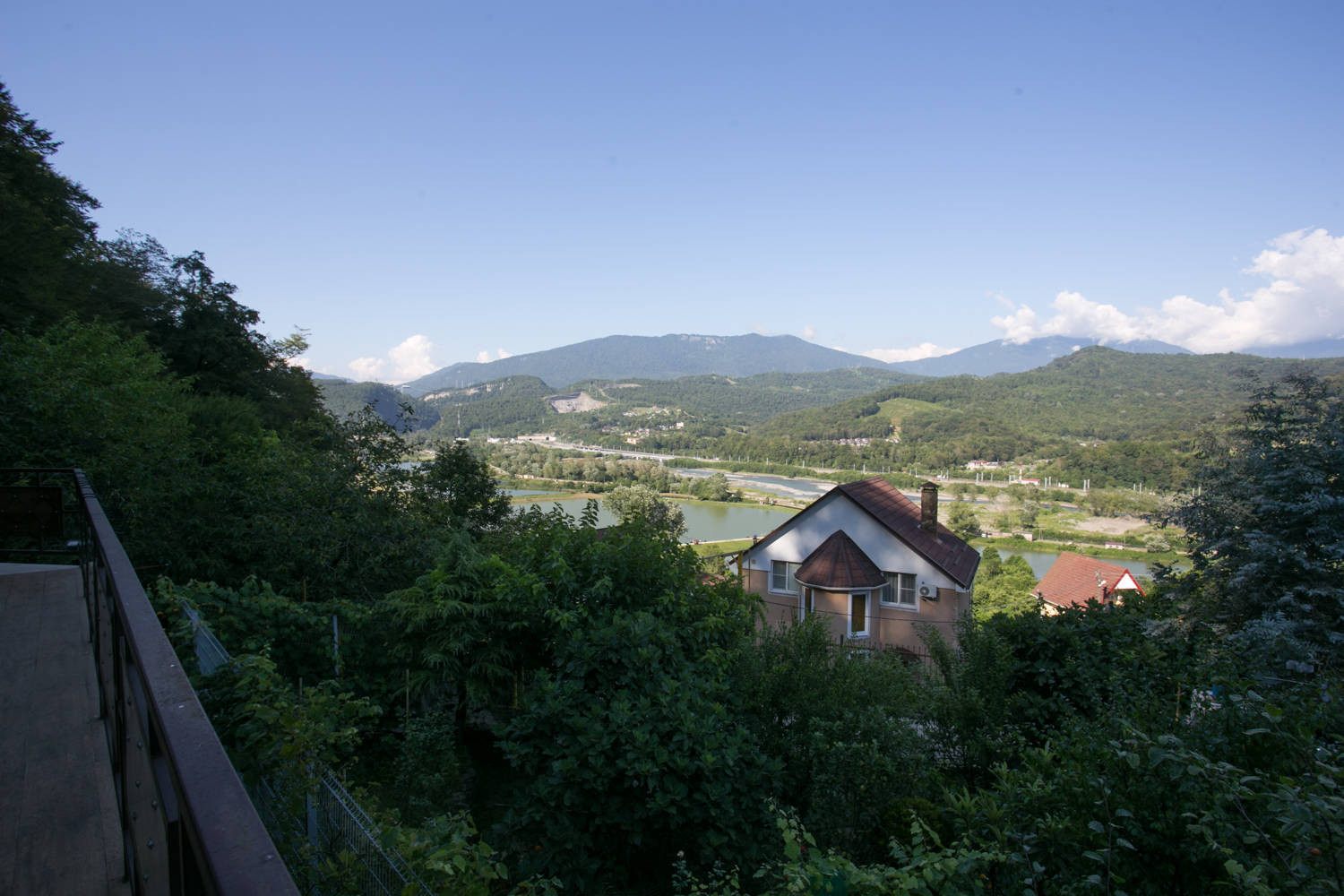 С террасы можно любоваться видом на горы, реку Мзымта, Скайпарк и форелевое хозяйство.Рыбку можно купить, а можно и поймать.