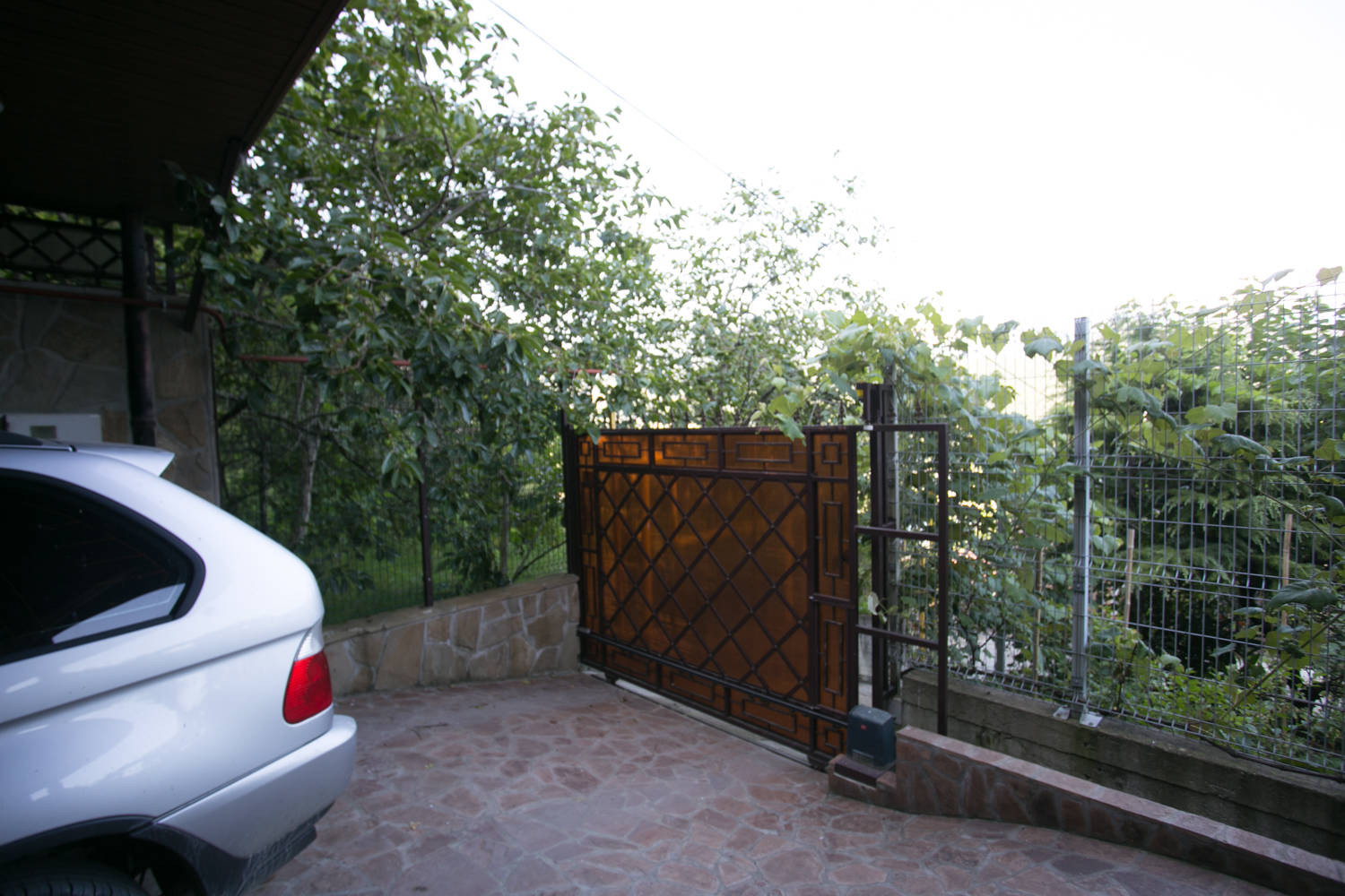 Во дворе крытая парковка для машины .