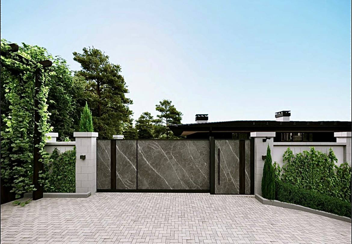 Покрытие двора  гранитная брусчатка.