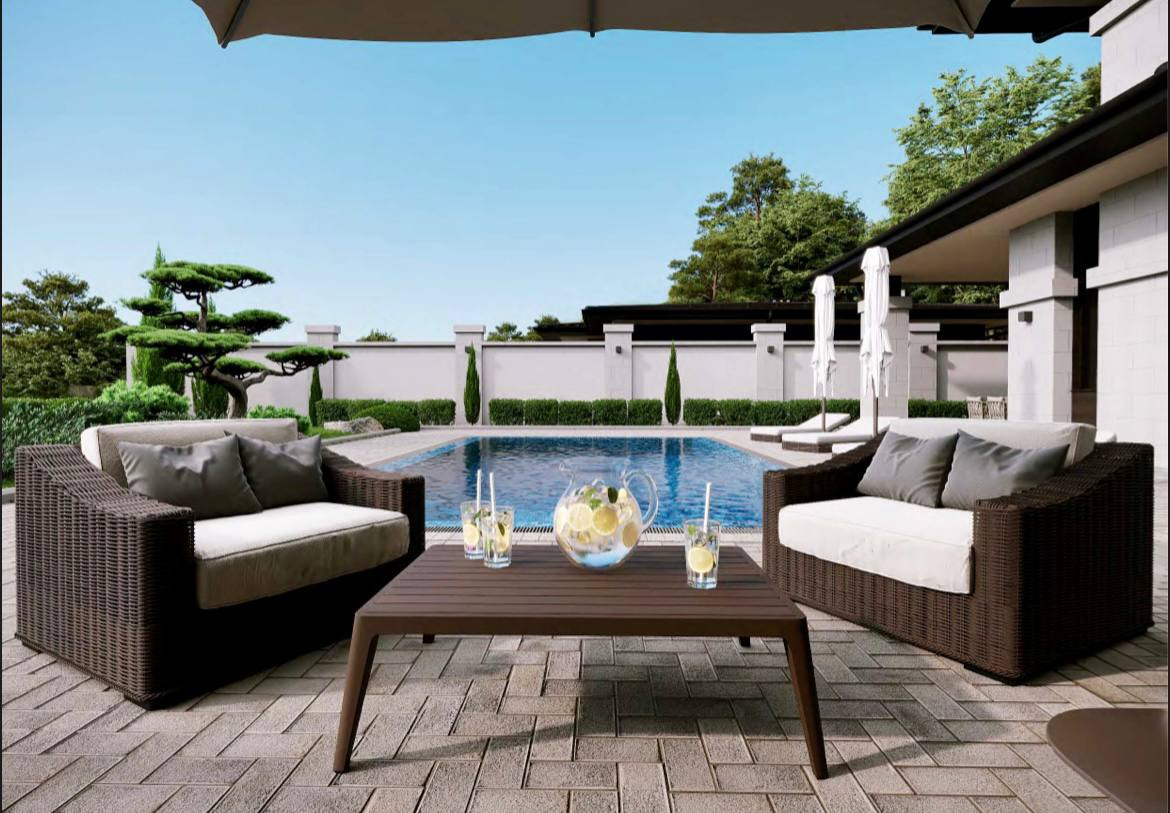 На территории выполнено ландшафтное озеленение , переливной бассейн с подогревом.