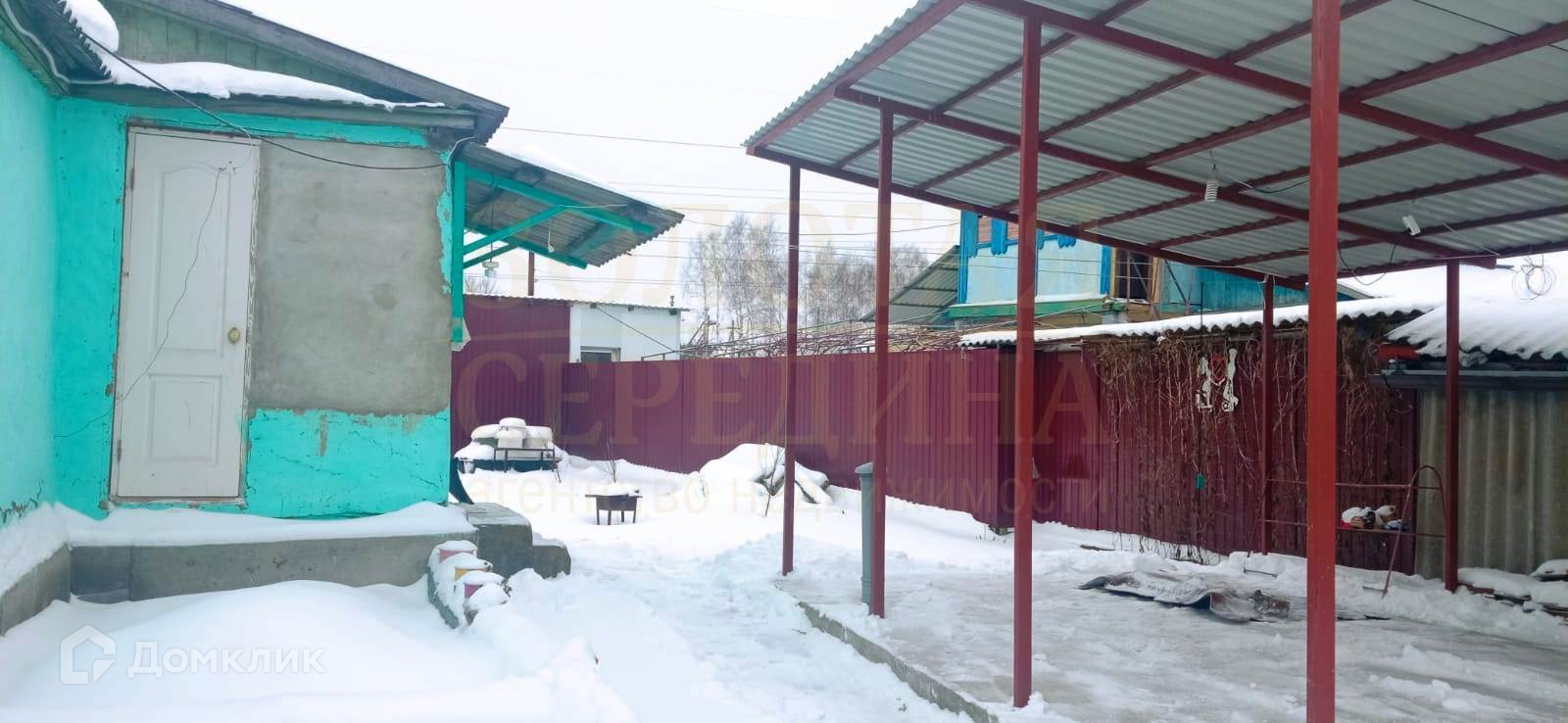 Дом построен из бревен, оштукатурен и покрашен, крыша - шифер, территория огорожена забором из профлиста.