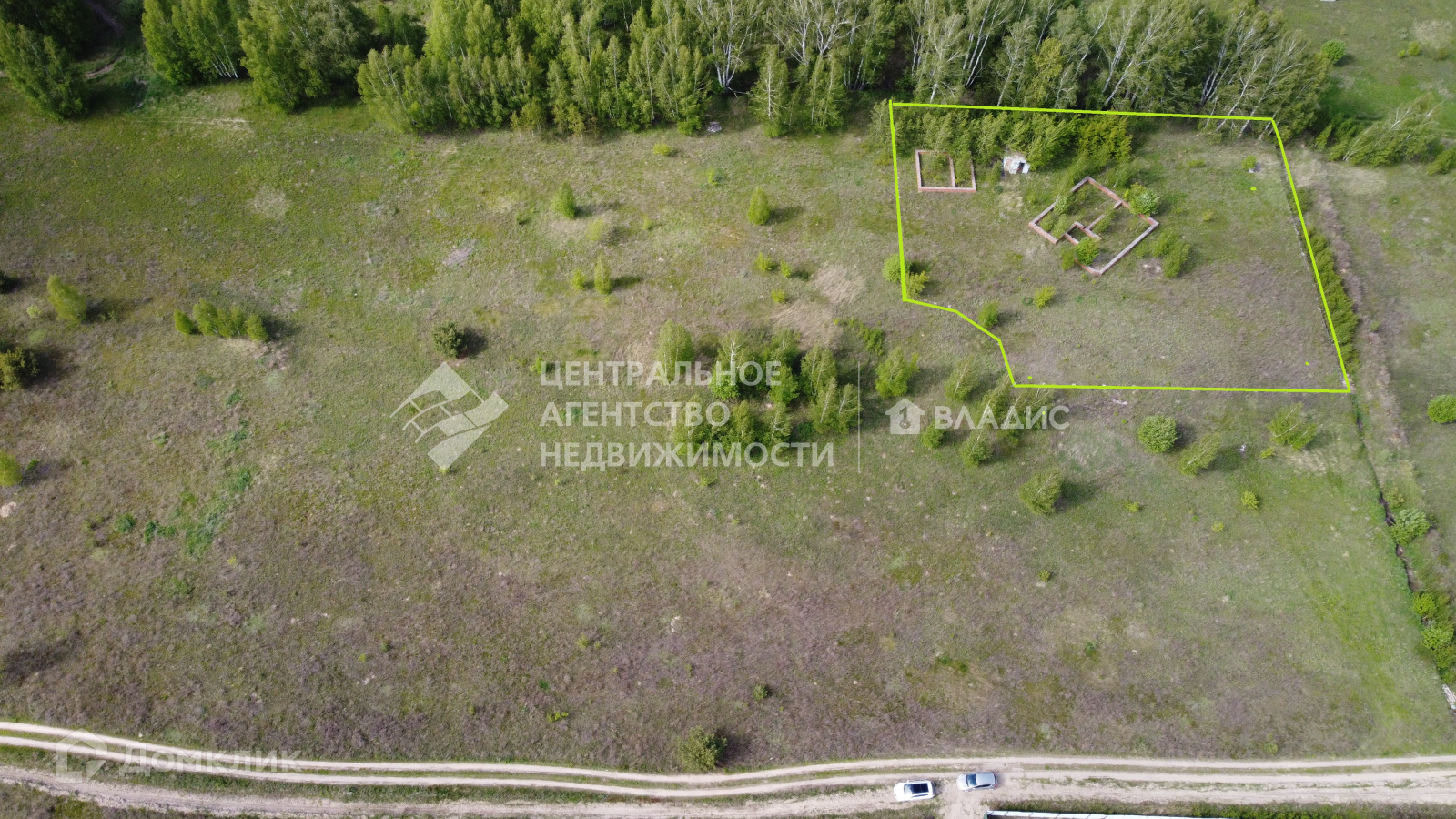 На участке имеется два фундамента под дом и баню, а также по периметру участка под забор.