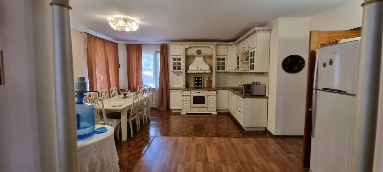 На первом этаже: веранда, занузел, кухня- столовая, спальня, гардеробная.