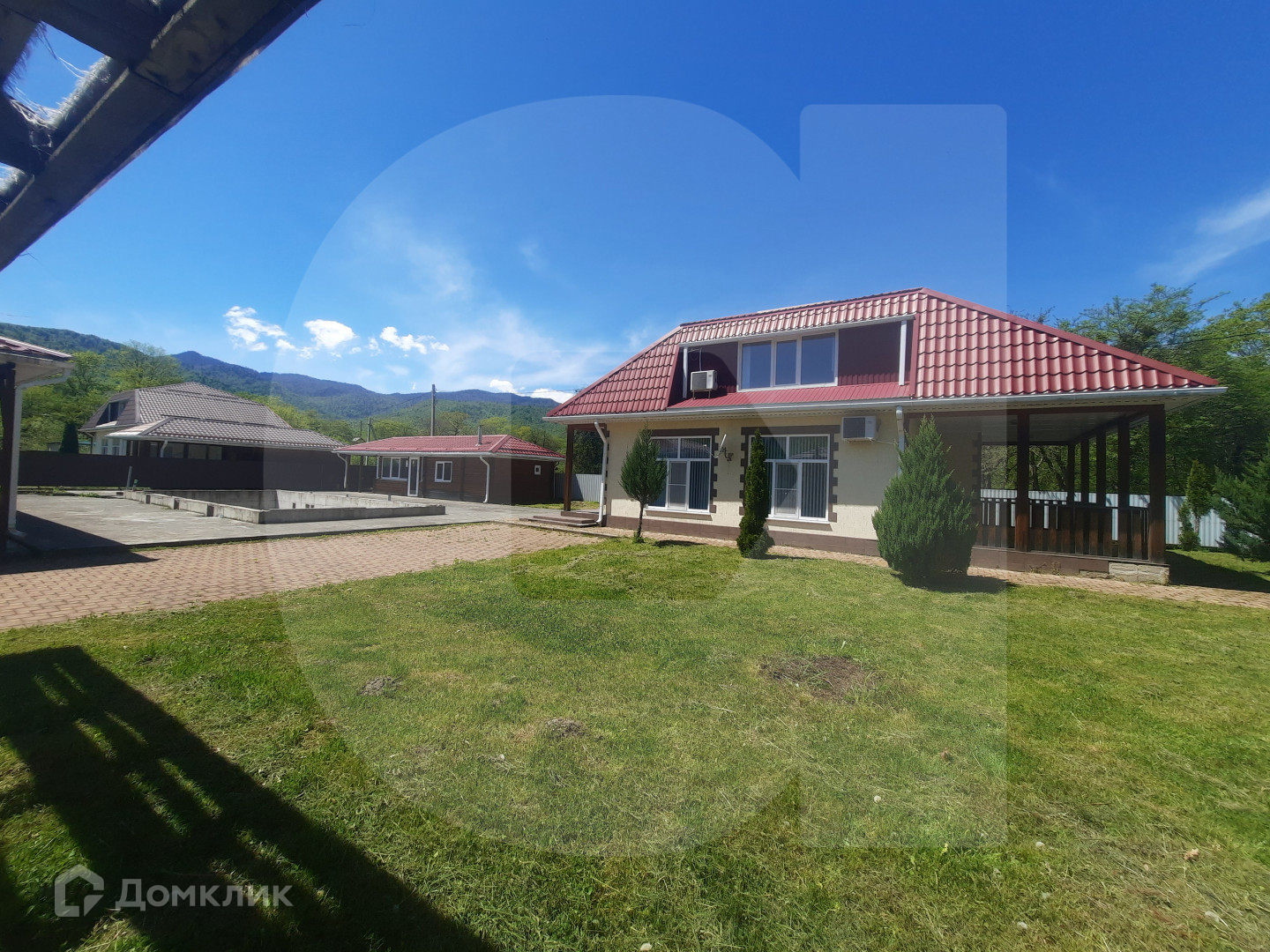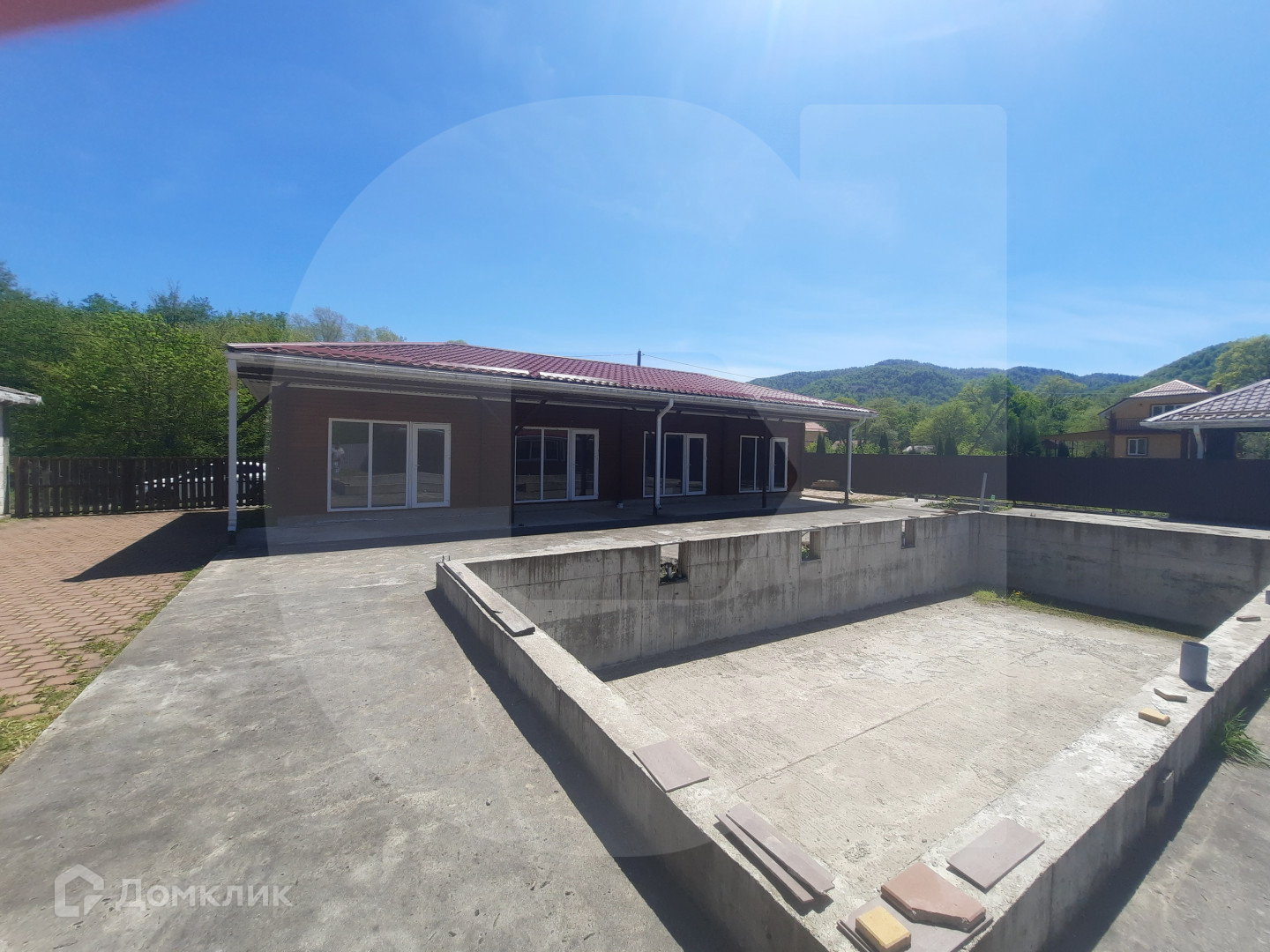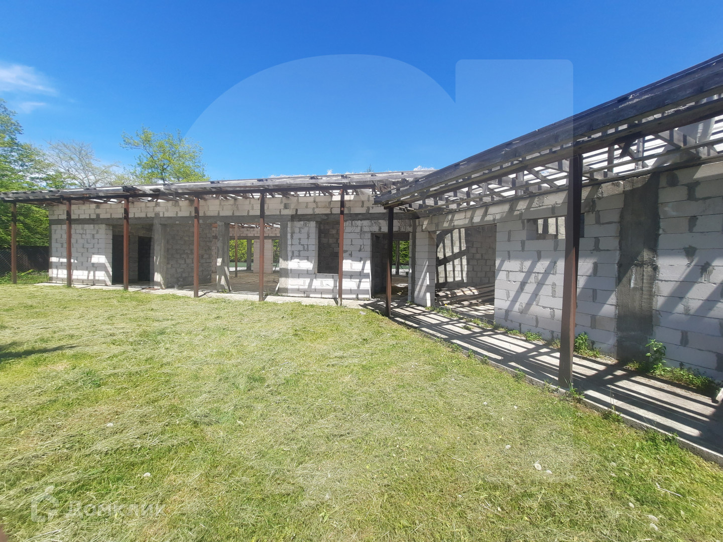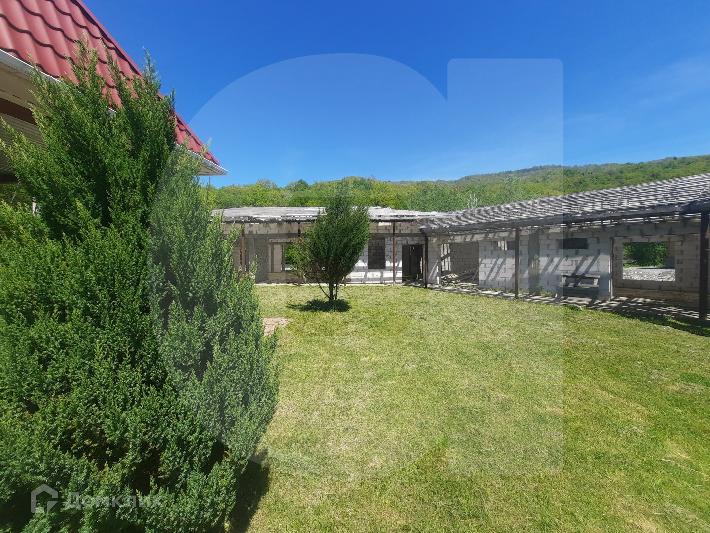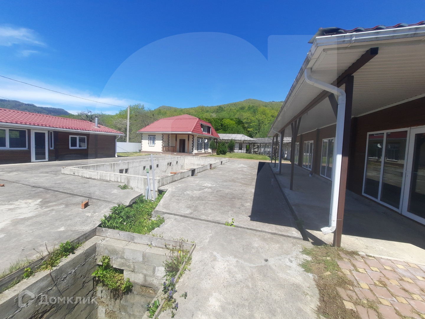 4. Капитальное здание (одноэтажное, незавершенного строительства) общей площадью 382 кв.м. для размещения 5 гостиничных номеров и кафе (ресторана).Материал стен- пеноблок, высота потолок -0 2.80м. Планировка: кухня, обеденный зал, гостиничные номера, терраса (с видом на реку и горы), подсобные помещения. Коммуникации: электричество вода из скважины канализация септик газ отсутствует, но ГРП уже установлен в 150 м от участка.