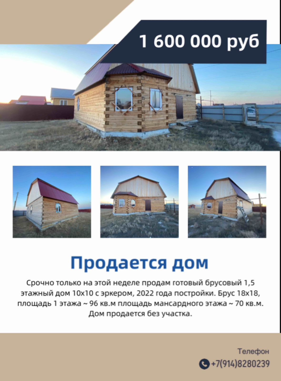 Продам брусовый 1,5 этажный дом 10х10 с эркером, 2022 года постройки с окнами, крышей, входной дверью и тд. (как на фото)