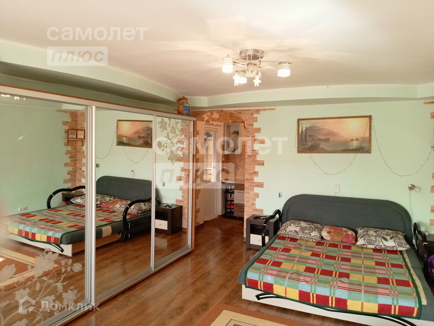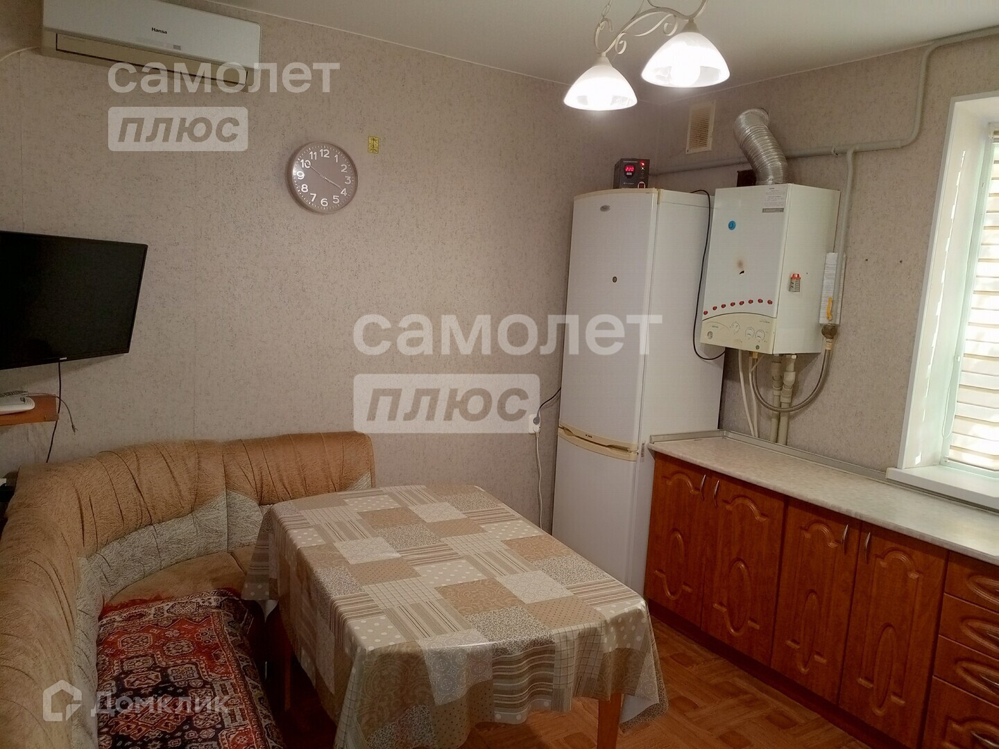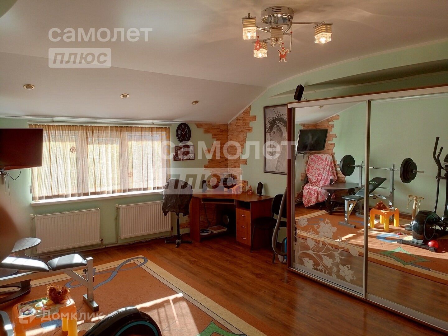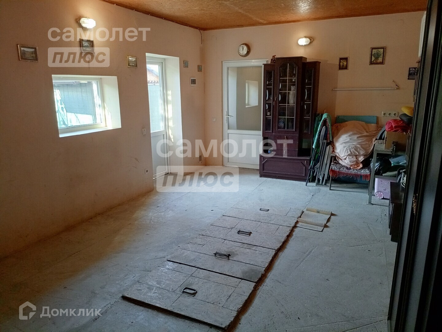 В доме сделан косметический ремонт. Выравнены стены, наклеены обои светлых тонов, уложен новый линолеум, натянуты потолки.