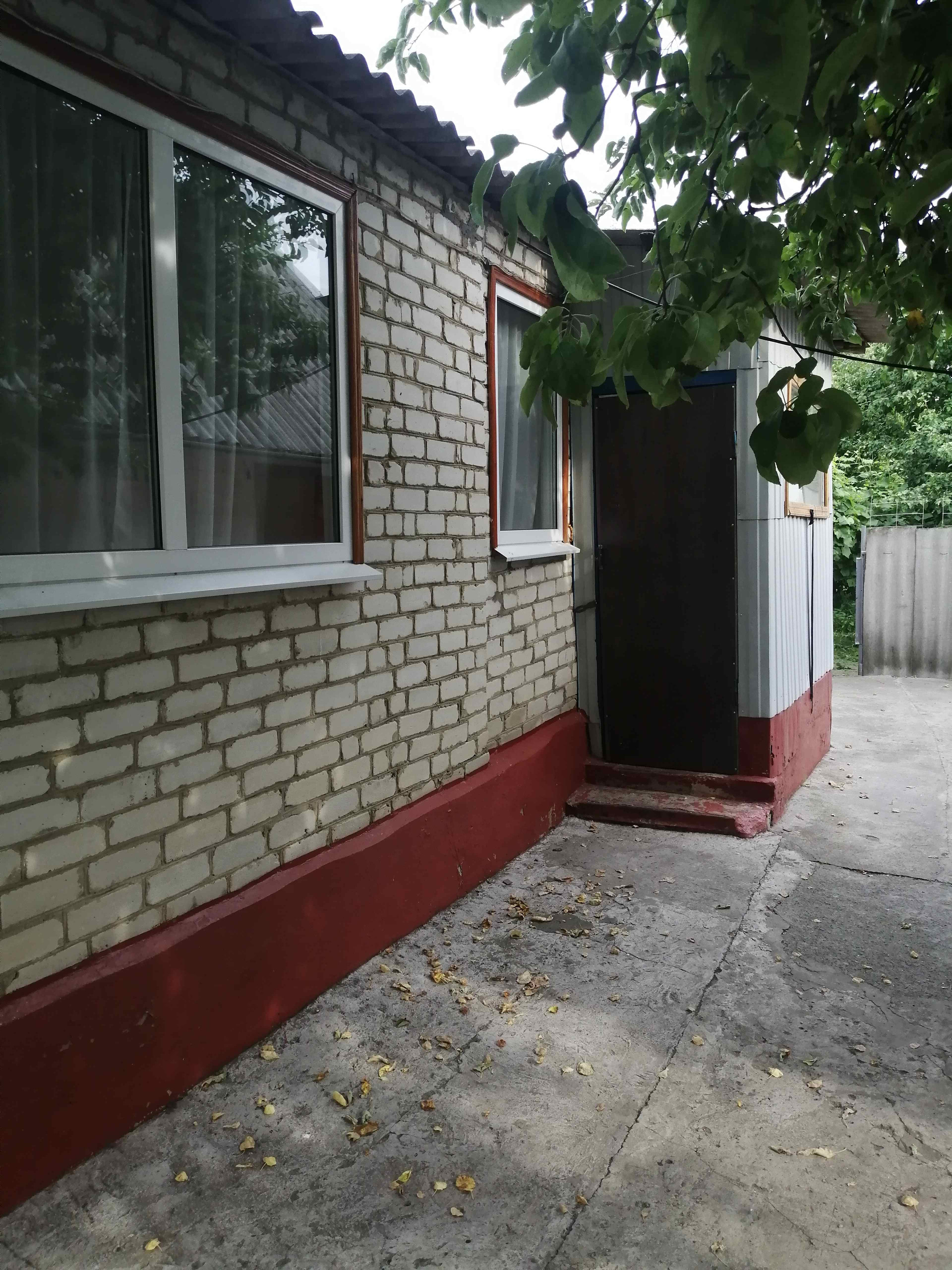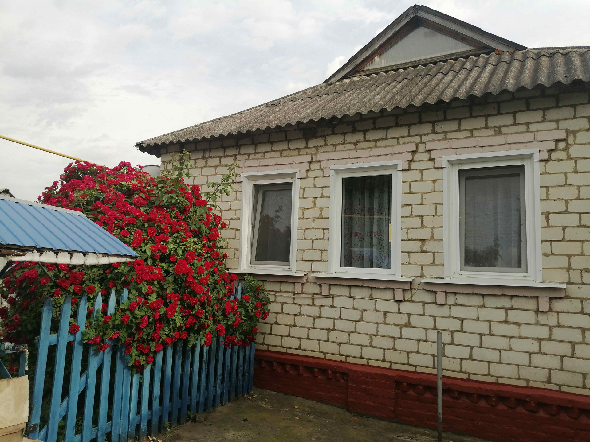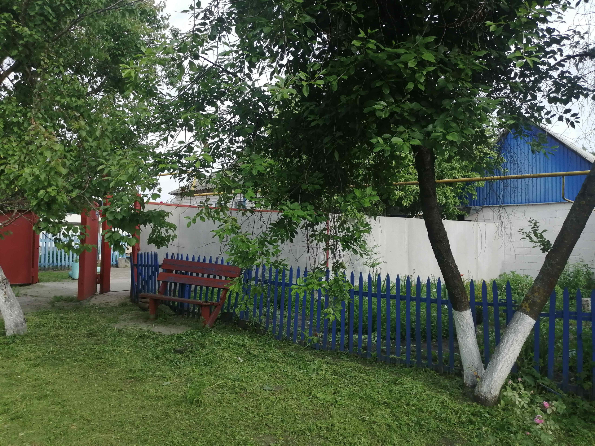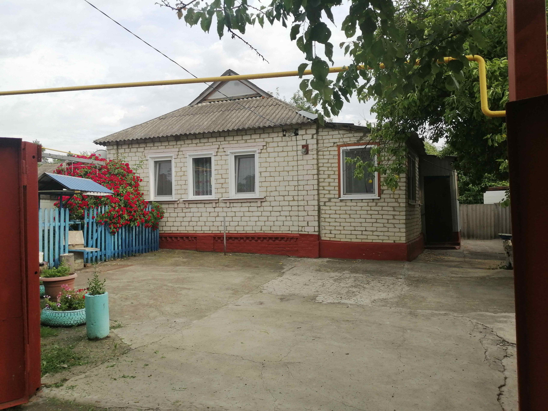 Дом обложен кирпичом. Двор забетонирован и огорожен, есть газон.