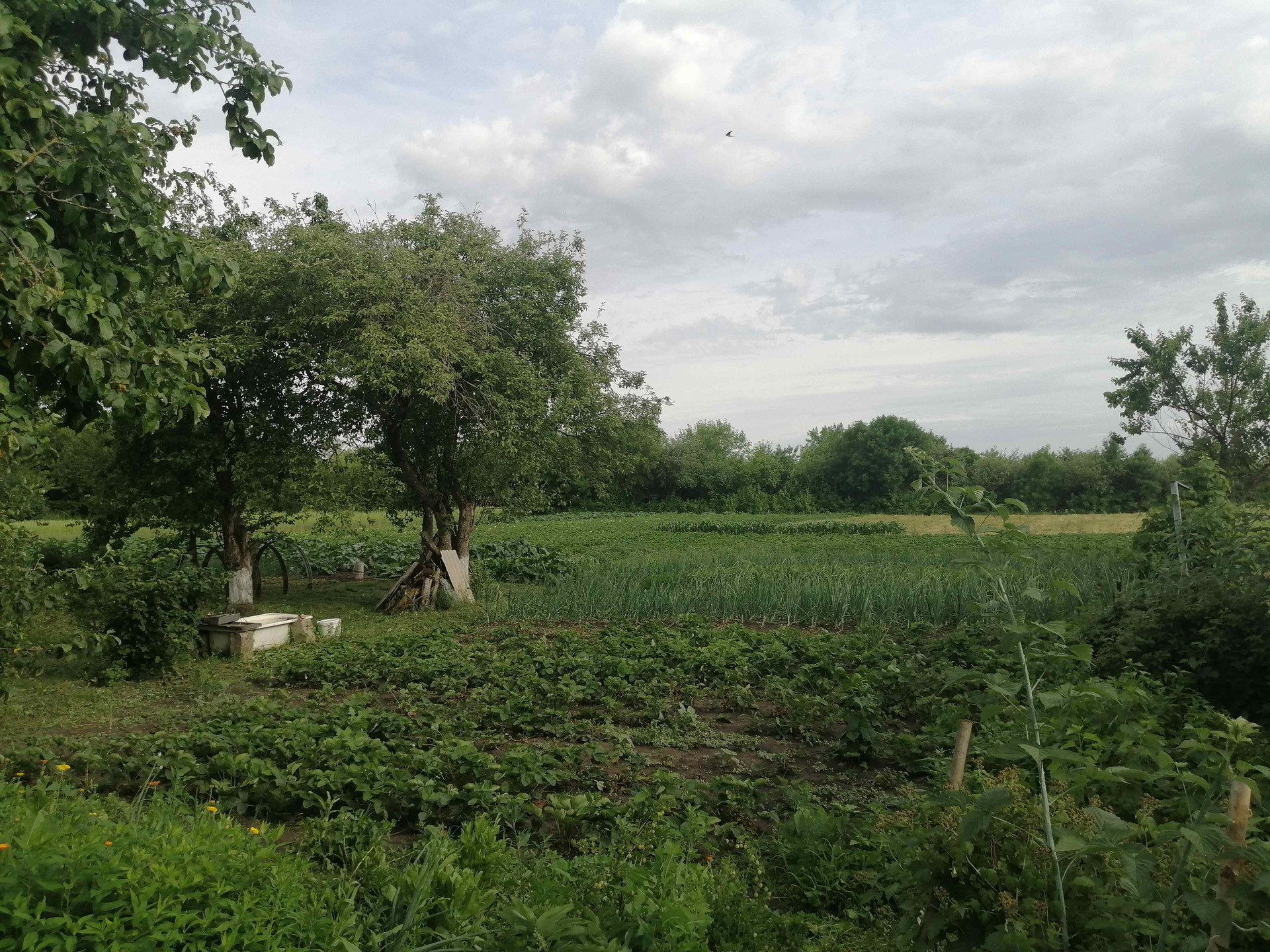 Земля обработана, садовые растения, яблони, вишни, орех, виноград, крыжовник, малина -всё плодоносит.