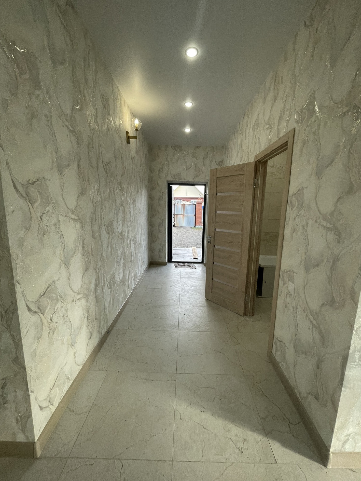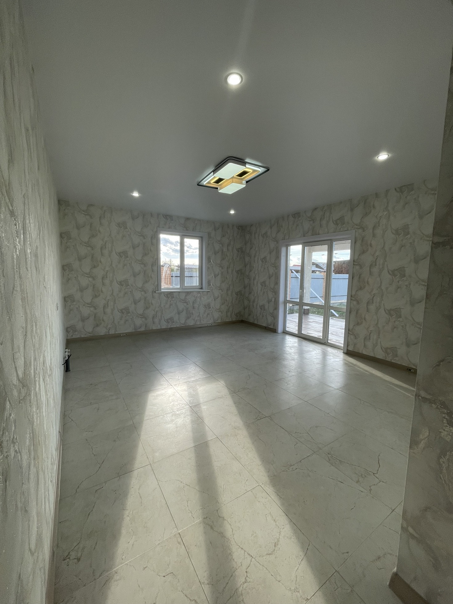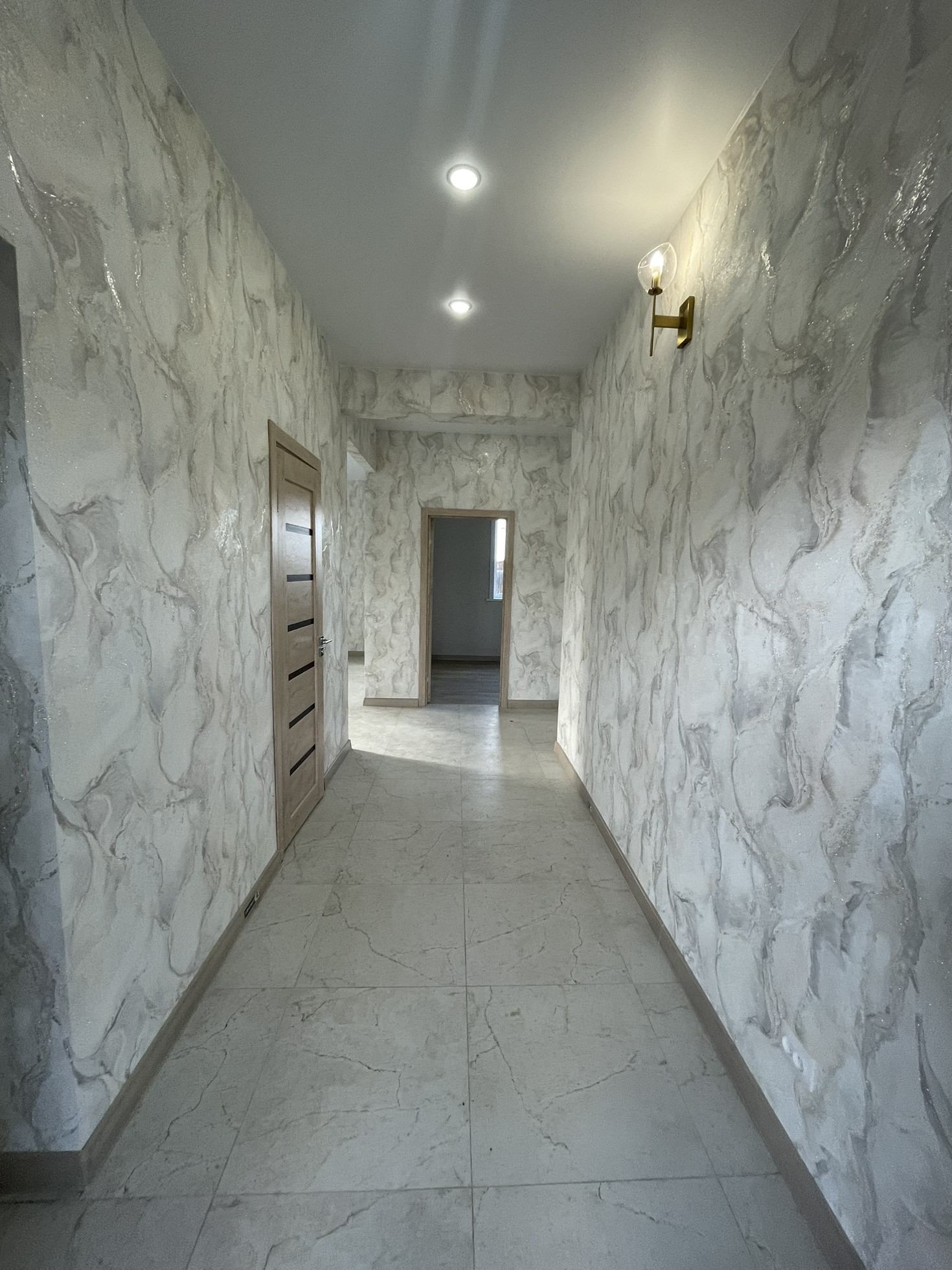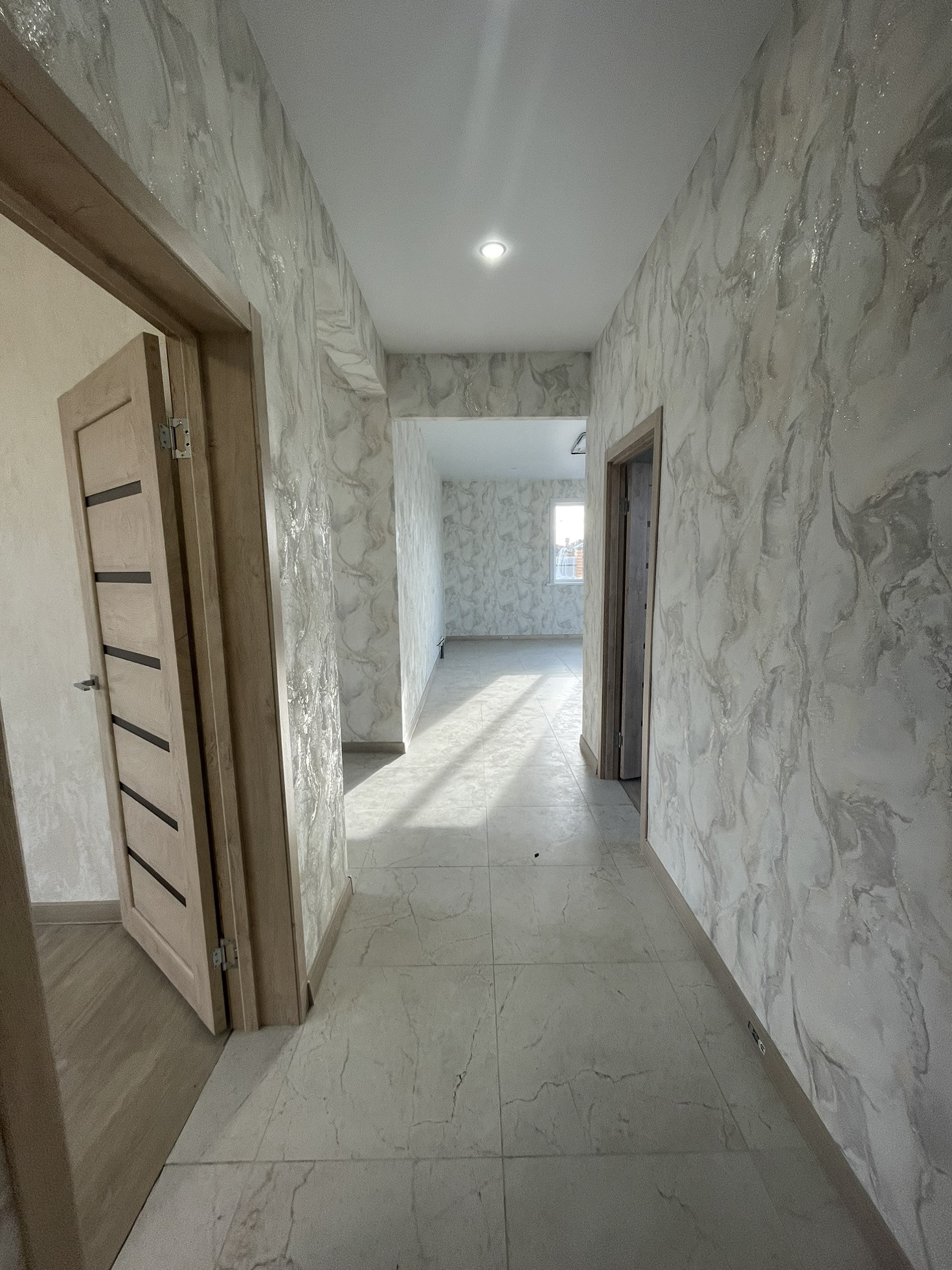На полу керамогранит, в спальнях кварц плитка, дорогие красивые  обои, хорошие межкомнатные двери