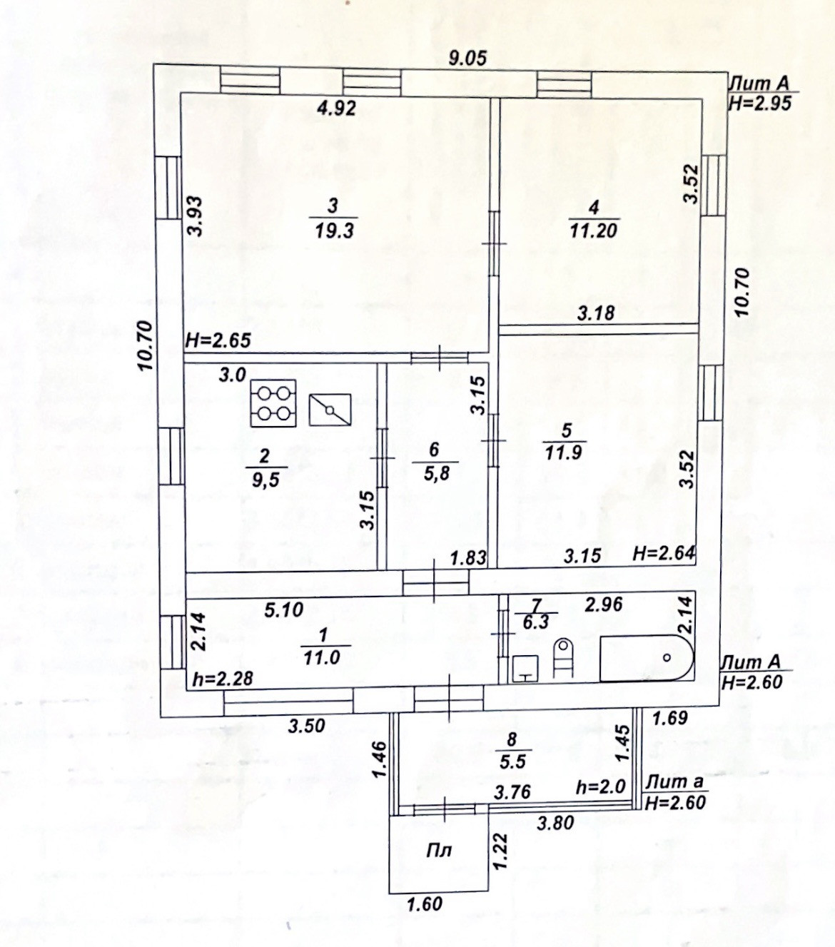 Дом из трёх комнат + кухня + веранда, санузел в доме. Смотрите план дома в фото.