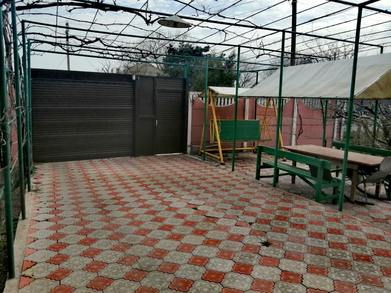 Благоустроенный, уютный двор, выложен плиткой, с цветниками и зоной отдыха (садовая качель, беседка с навесом). Въезд во двор - рол ворота. Автоматический полив по всему участку.