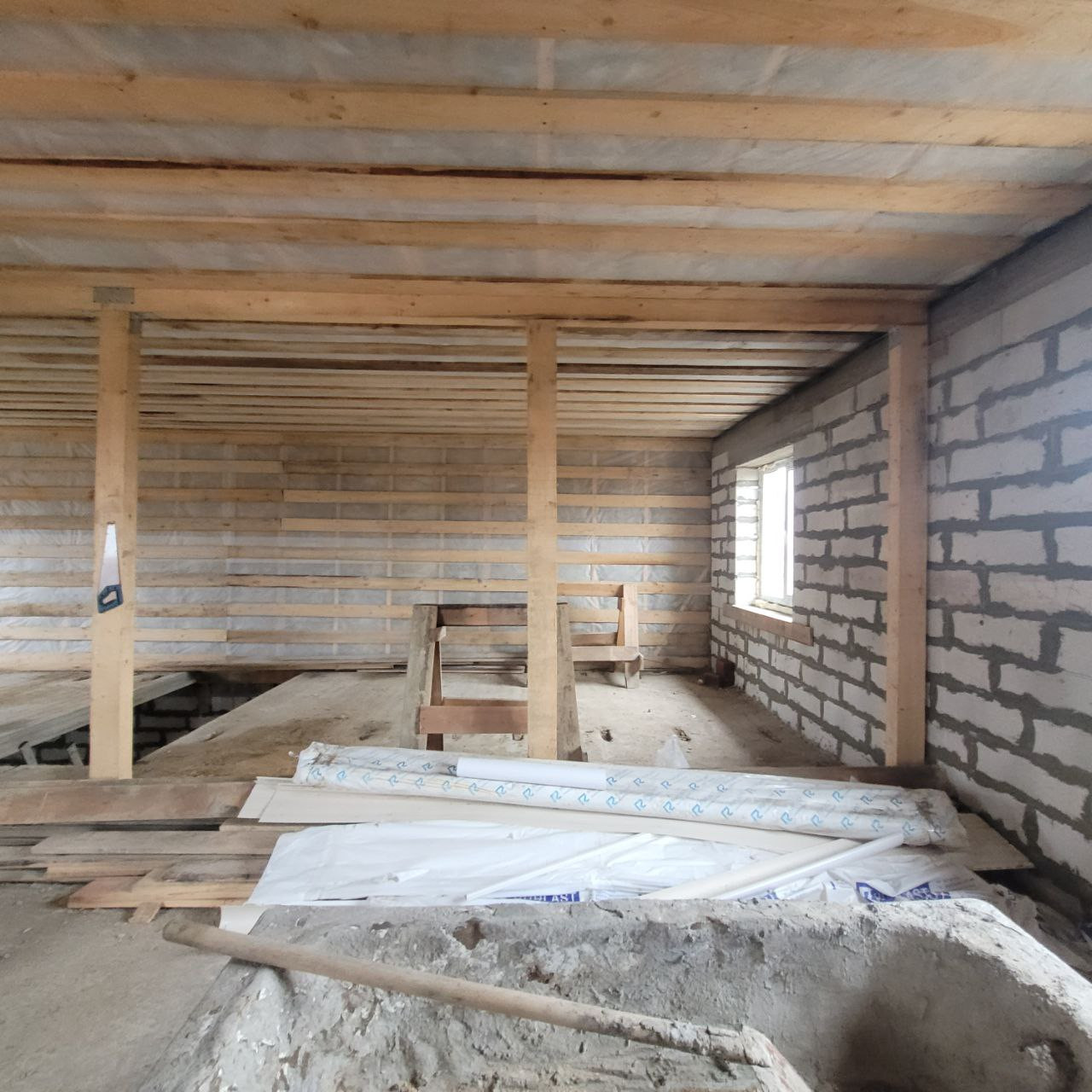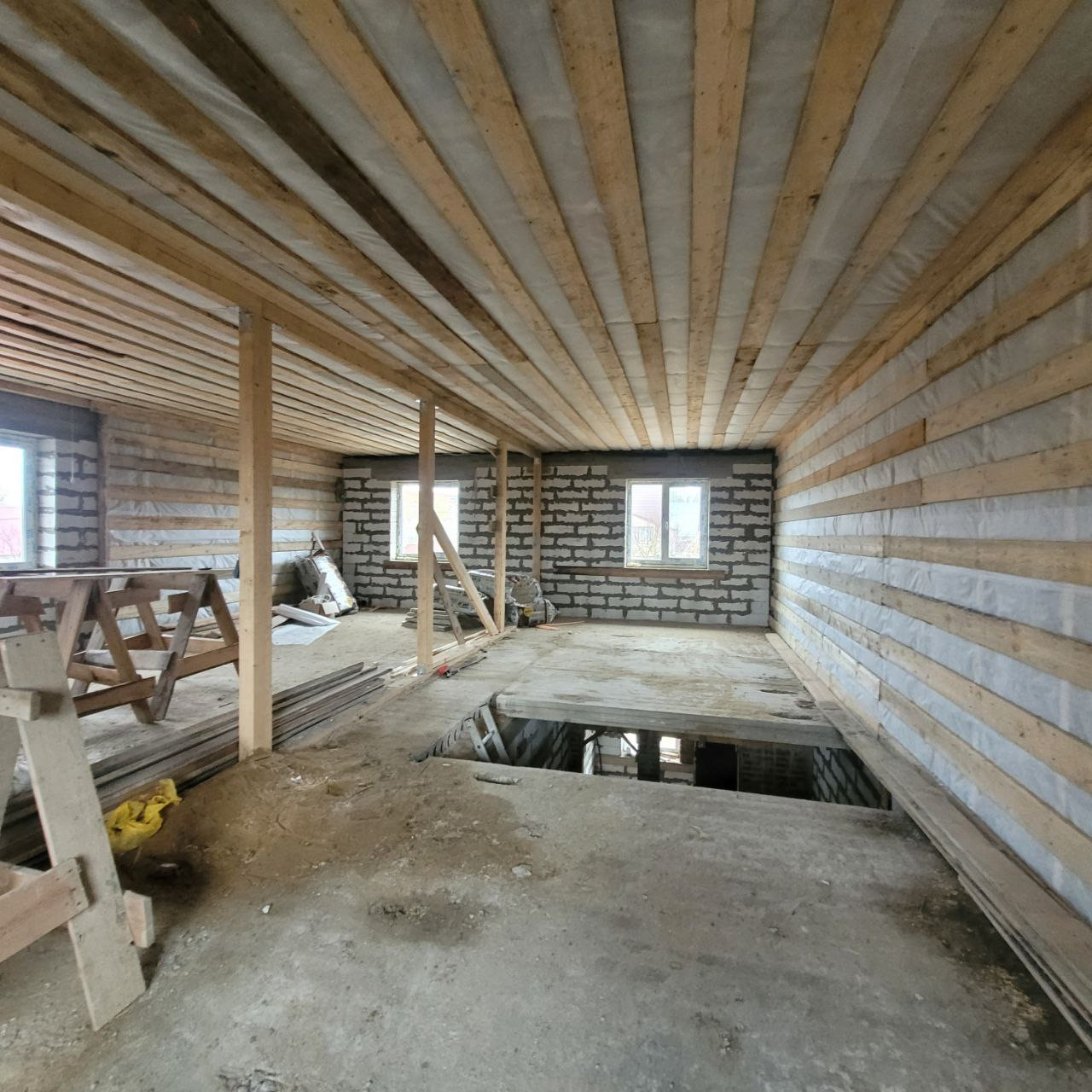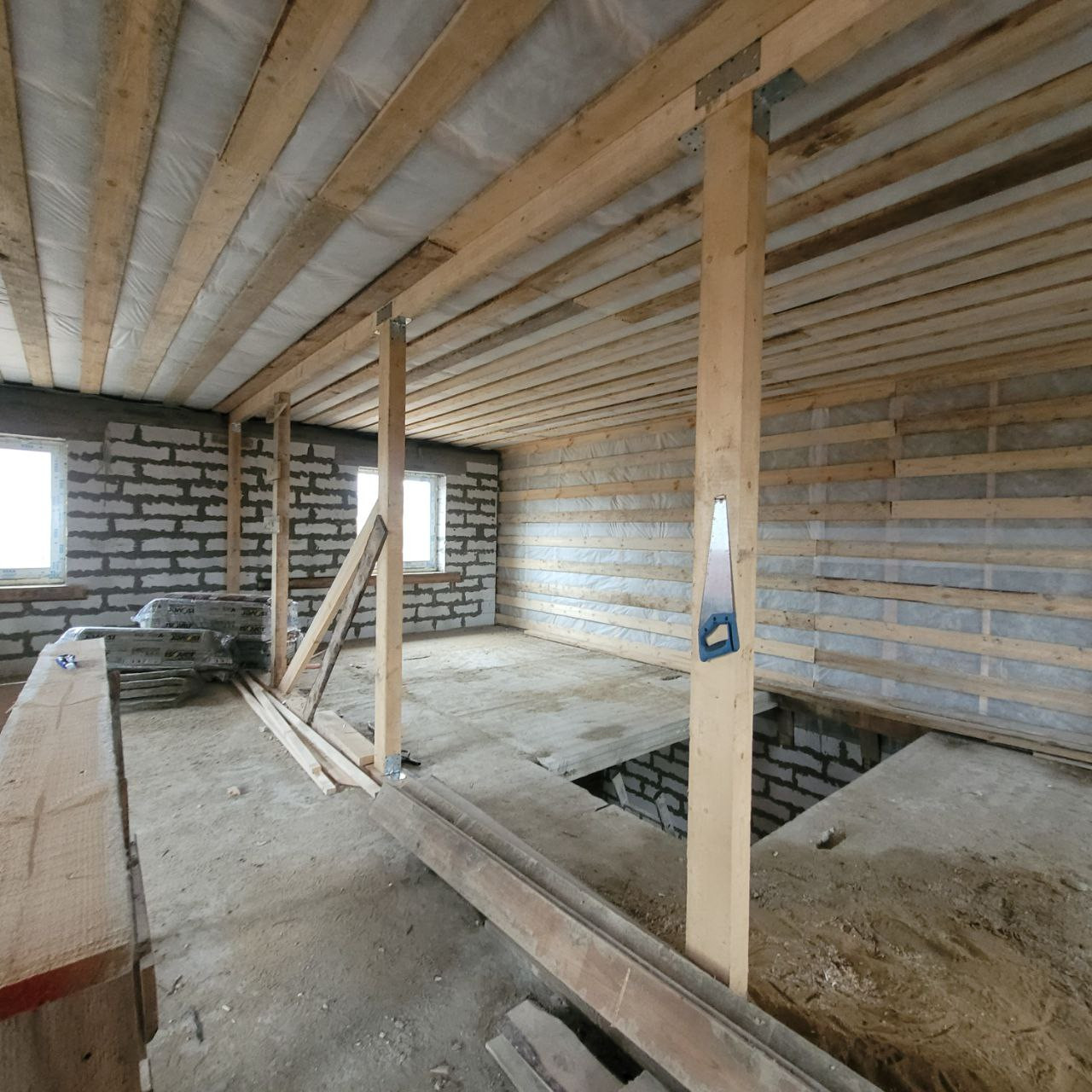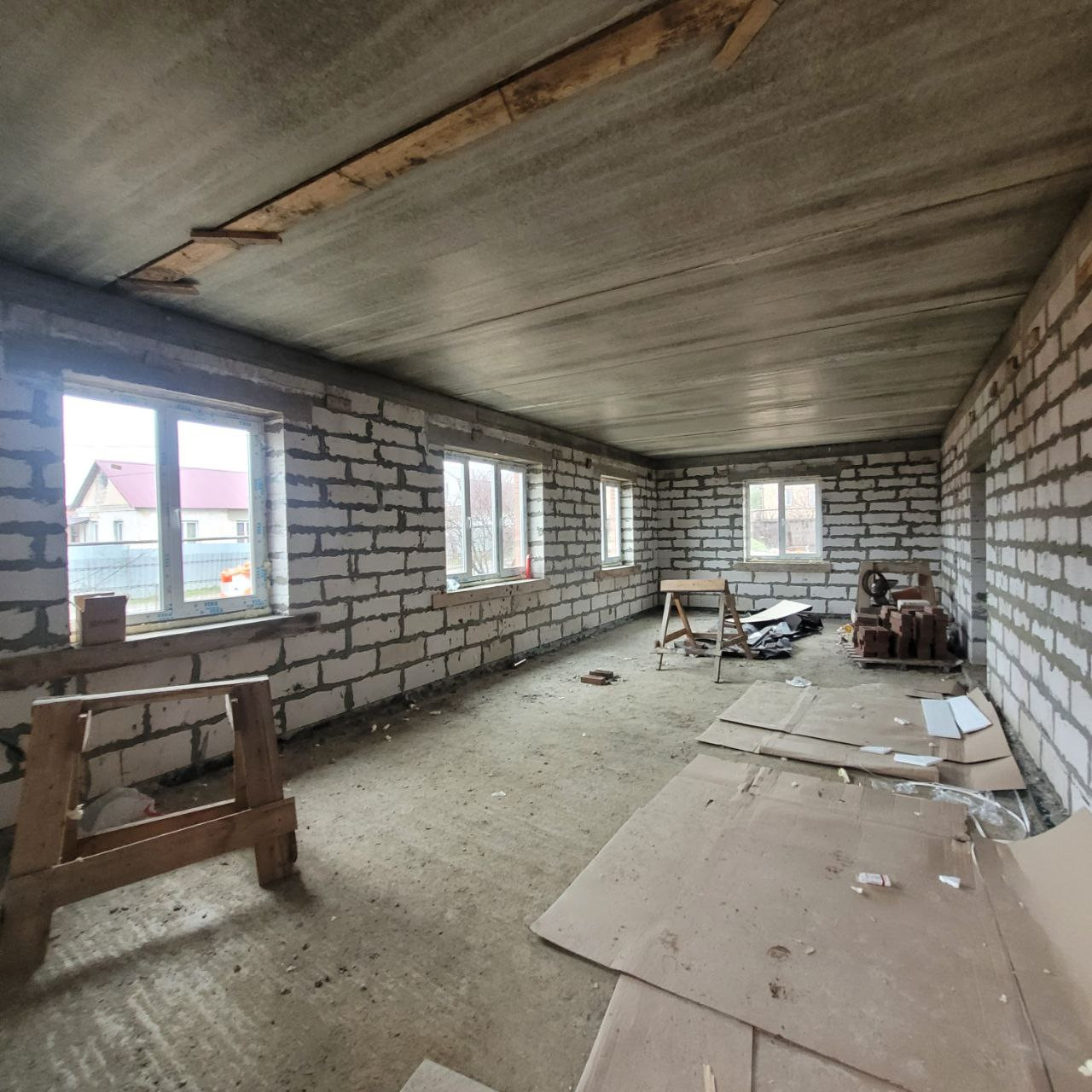 На 1-ом этаже свободная планировка для создания кухни-гостиной, спальни, прихожей, с\у и котельной. На 2-ом этаже четыре комнаты и санузел.