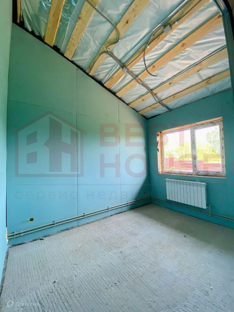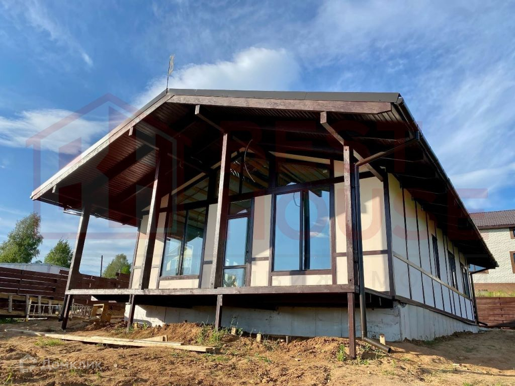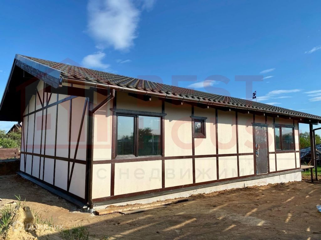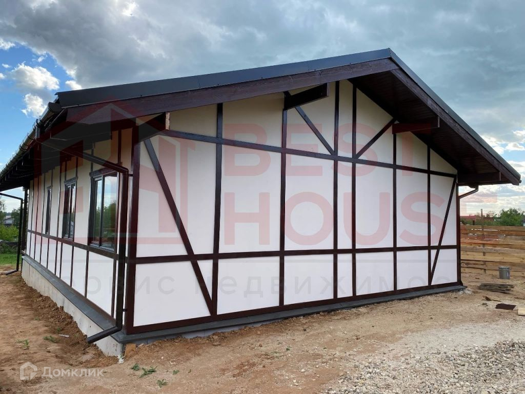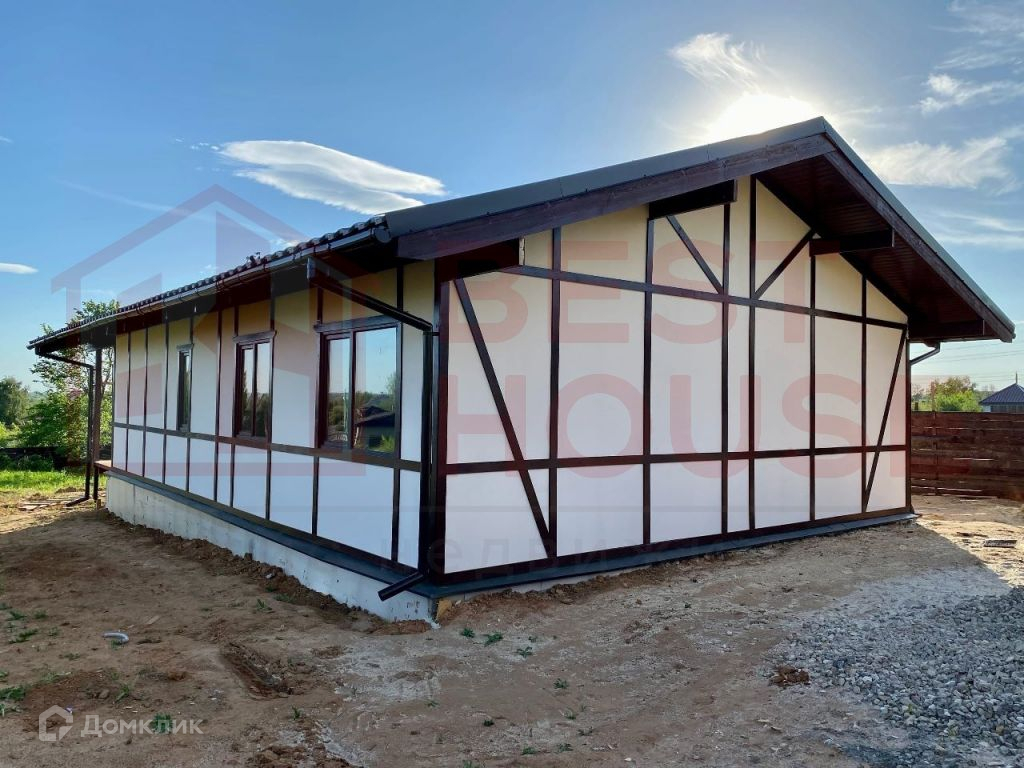 В доме есть две полноценные спальни, зал, совмещённый с кухней, два санузла, комната для сауны, комната - детская или кабинет, прихожая и хозяйственная комната для складирования.Технические аспекты: - Фундамент сделан не из грешных винтовых свай, а из полноценного, качественного бетона (производство НН). Буронабивные армированные сваи (глубина 1, 8м), лента, плита пола - всё утеплено экструдированным пенополистиролом.- Стены и крыша дома сделаны по каркасной технологии. Толщина качественного минераловатного утеплителя Роквул - 20 см! Этого более чем достаточно даже для самых жгучих морозов.- Снаружи дом сделан из плит ЦСП (цементно-стружечная плита). Внутри - уже сделаны стены из ГКЛ на металлической подконструкции. Всё, что осталось сделать - определиться с материалами отделки стен и полов и закончить внутреннюю отделку.- Внутри стен уже заложена вся электрика, выключатели, выходы под люстры и т.д.- В доме установлены радиаторы отопления.- Уже подключено водоснабжение, установлен новый колодец перед въездом на территорию.- Сделана канализация (3 бетонных кольца диаметром 1, 5 м).- Дом уже поставлен на кадастровый учёт и ведётся работа по догазификации. На данный момент делается проект подключения. Газ будет подключен в самое ближайшее время.- Уже установлены ворота и калитка с отделкой деревом.- Внутри дома уложена фольгированная пароизоляционная плёнка, которая отражает тепловое излучение и делает дом ещё более тёплым.- Пол веранды сделан из качественной шпунтовки.- Установлены водостоки и водоотведение под землёй, чтобы не было луж на входе в дом.- Крыша сделана из очень качественной металлочерепицы Металл Профиль Норман 0, 5 мм (по ГОСТу), с гарантией на покрытие 20 лет.- На участке очень удобно разместилась парковка для 1-2 автомобилей.