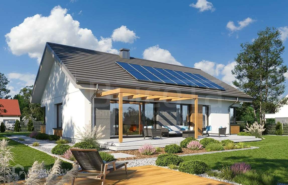 Ночная зона домочадцев состоит из трех удобных спален с большими встроенными шкафами и большой ванной комнатой. Из главной спальни запланирован выход на террасу. Рядом с вестибюлем находятся техническое помещение, а рядом с кухней-подсобное помещение. Весь интерьер здания спроектирован на одном уровне первого этажа, но владельцы имеют доступ к чердачному пространству, которое может быть благоустроено как домашний склад.