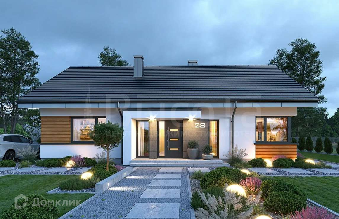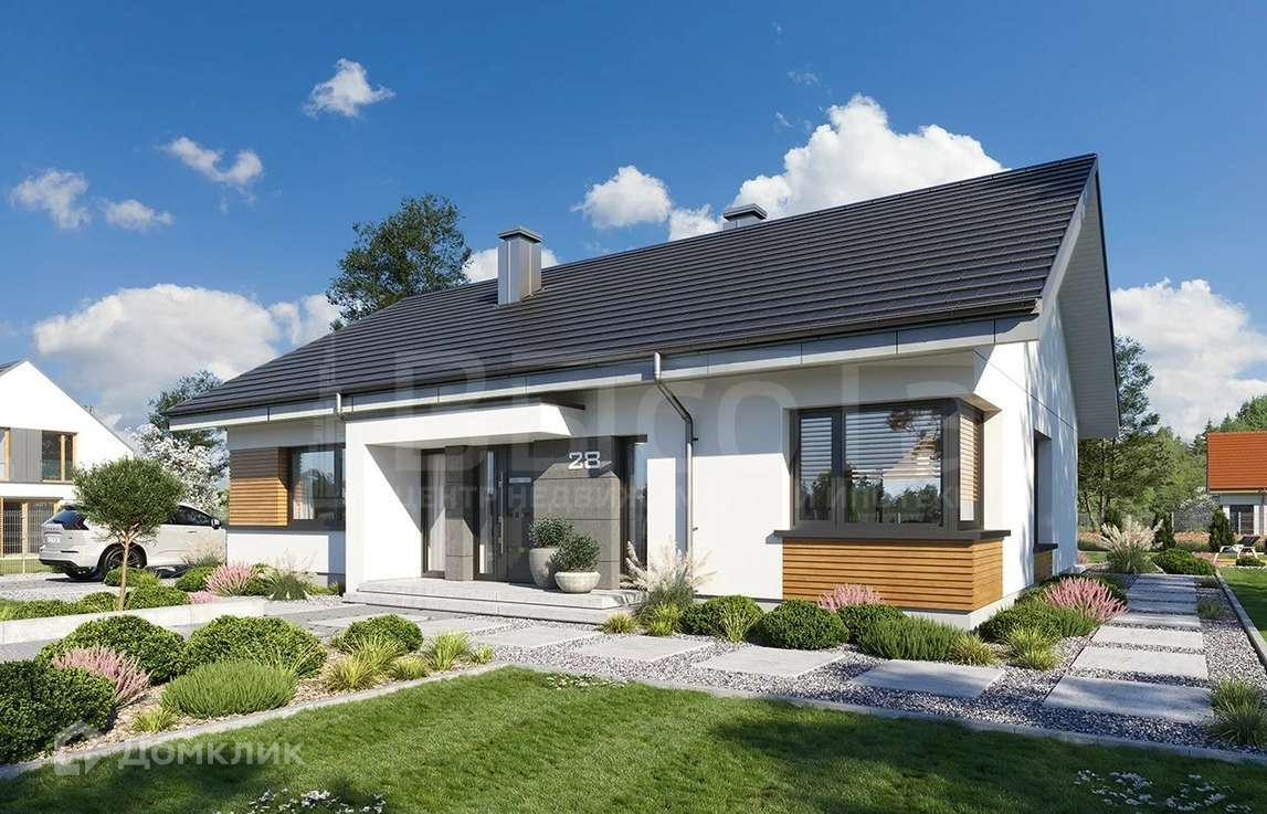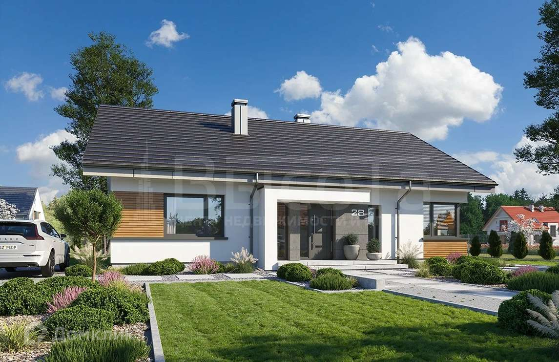 Простой и современный корпус здания сочетается с интересными деталями. Хорошо подобранные материалы и интересная цветовая гамма создают удачное сочетание и красивый внешний вид. Здание выглядит эстетично, глядя на него, мы ощущаем гармонию. Фасад дома украшен презентабельным входом с современным навесом. Со стороны сада расположено красивое панорамное окно с выходом на террасу из гостиной. Контрастное сочетание облицовки стен, красивого остекления окон с белым фасадом дает интересный, элегантный силуэт дома.