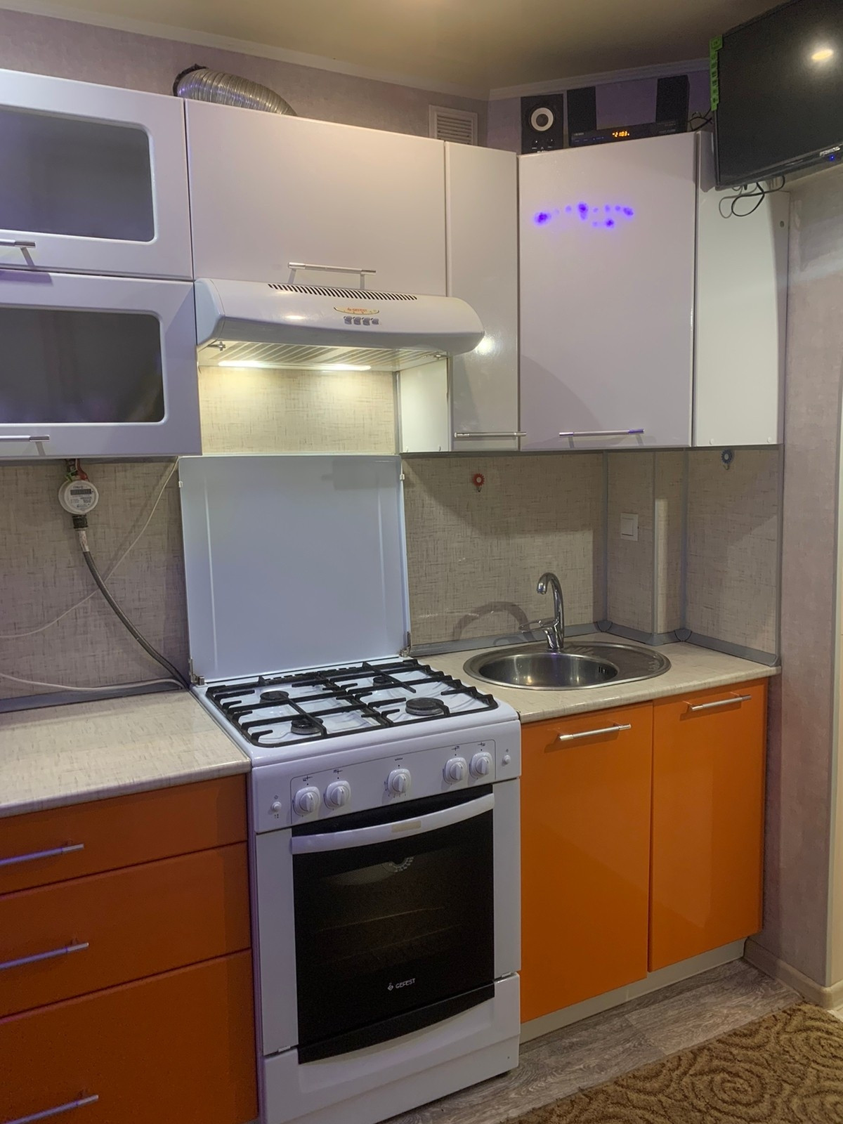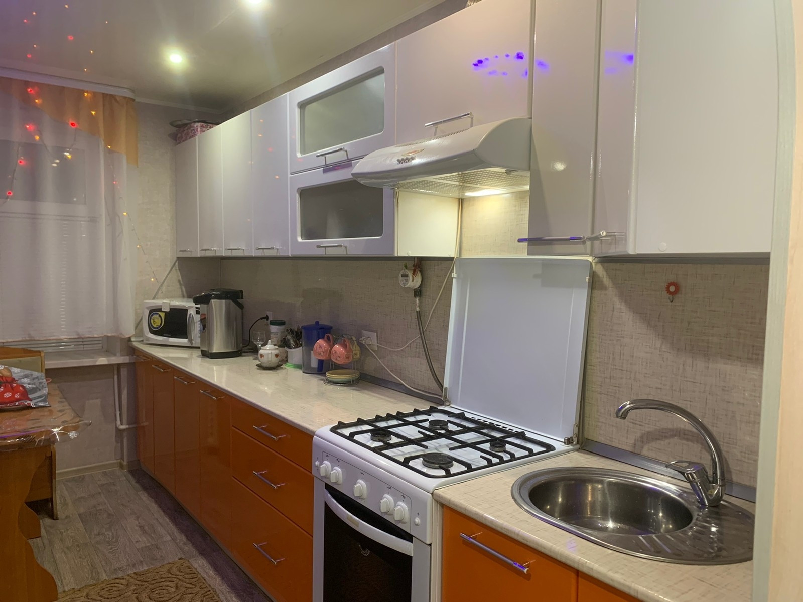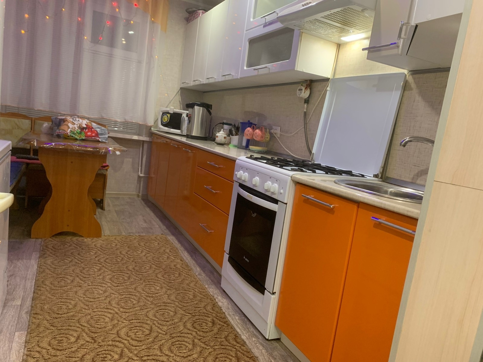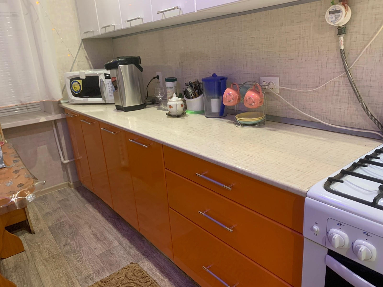 В квартире остаётся кухонная гарнитура,газовая плита,бойлер для горячей воды,частично мебель