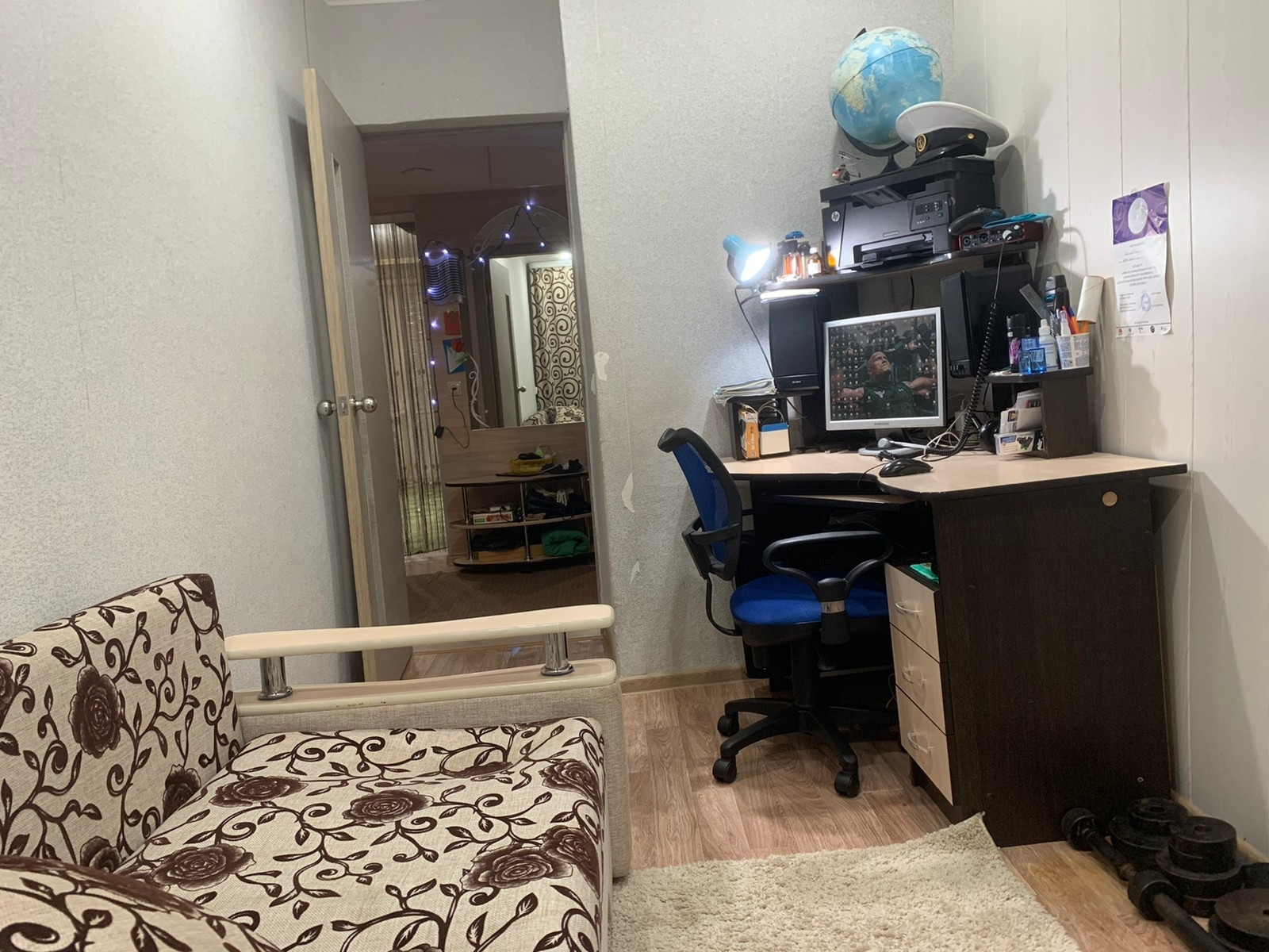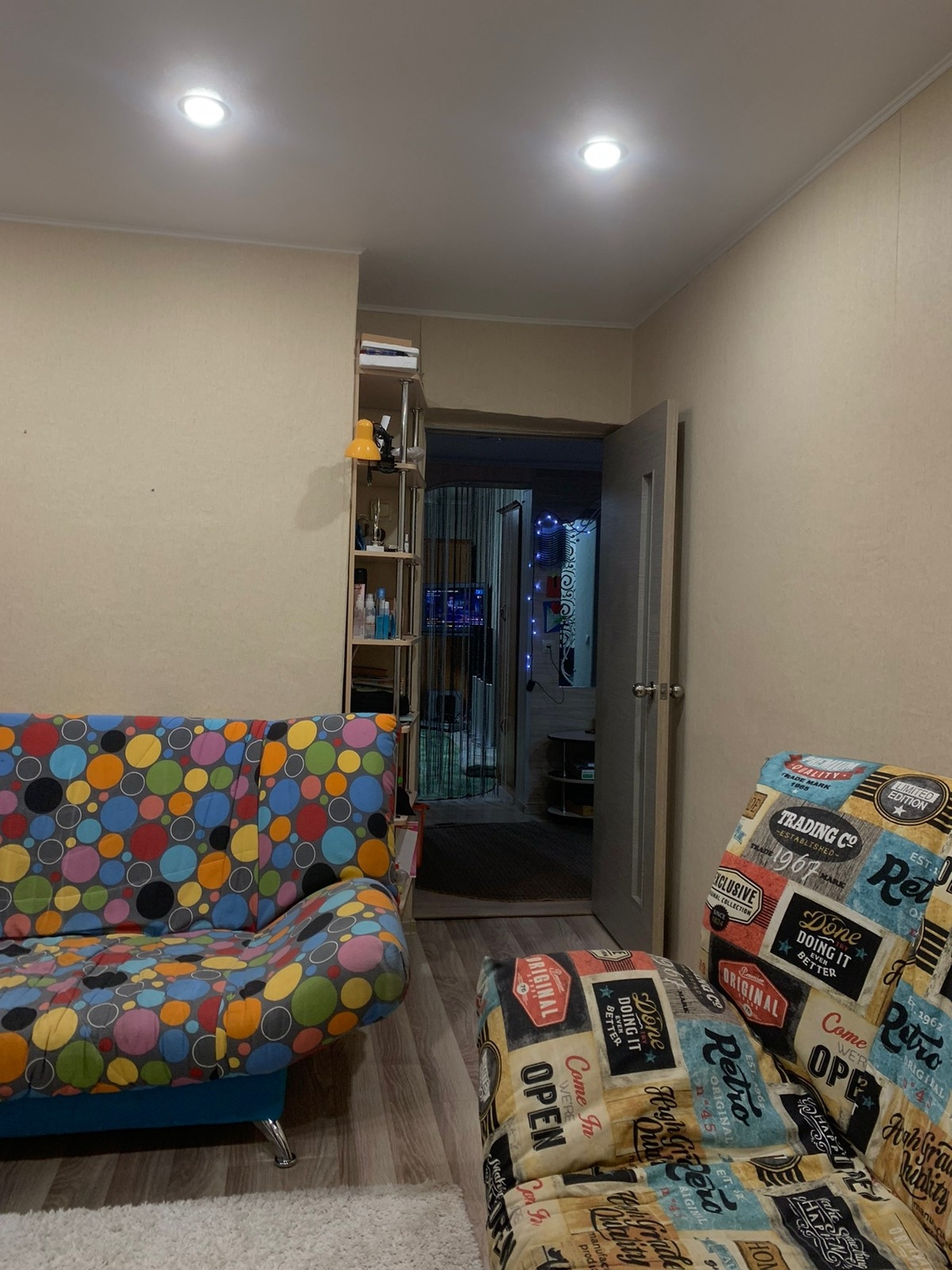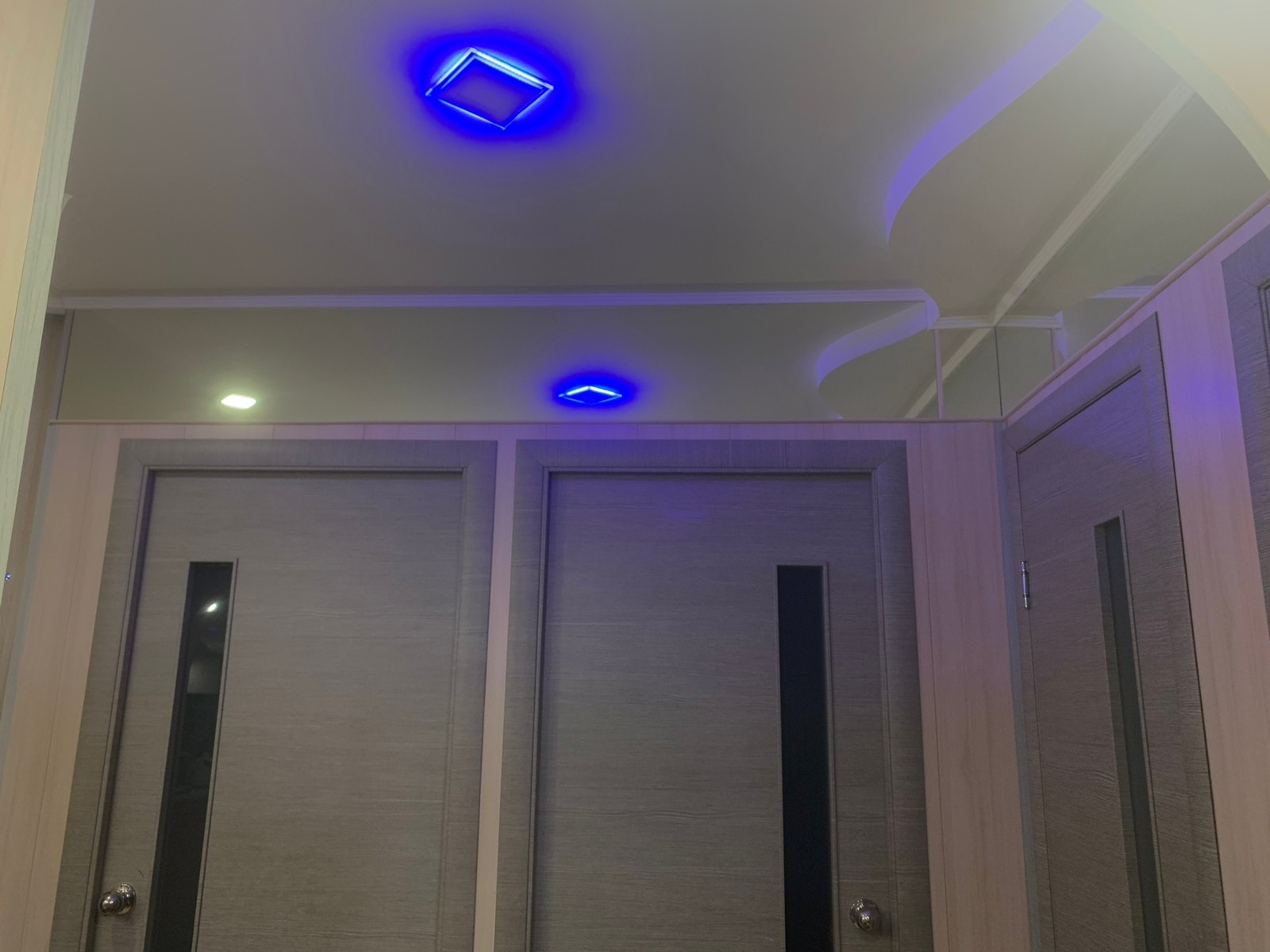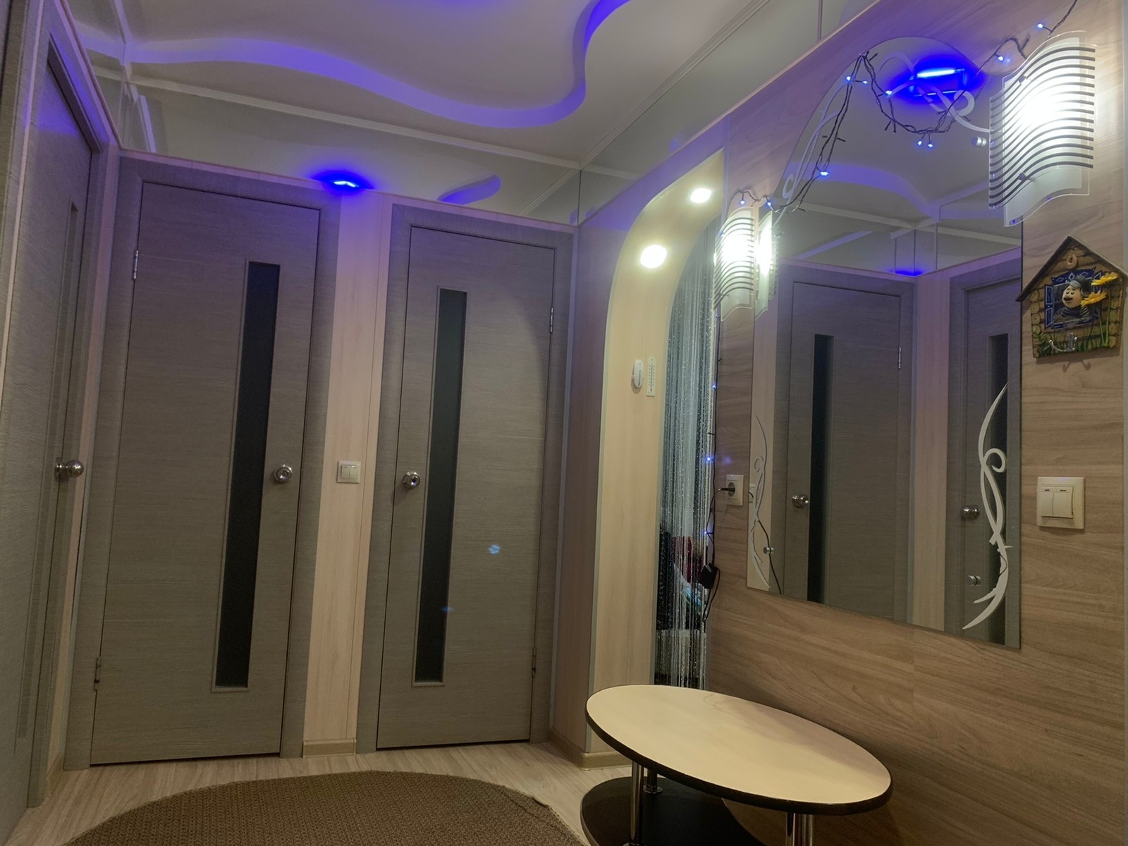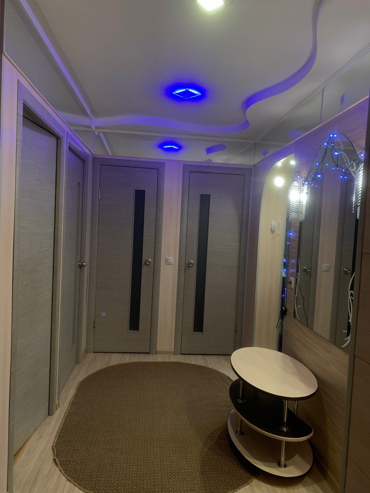 На полу линолеум,в прихожей ламинат,потолки натяжные