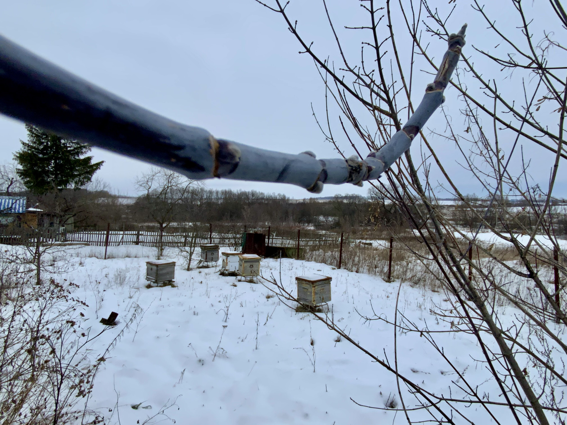 На большом участке пасека с омшаником и шестью ульями, в низу под участком речка и пруд.