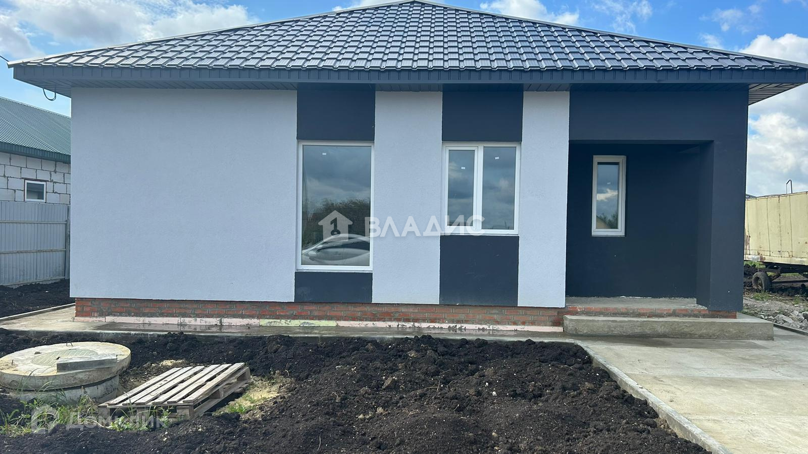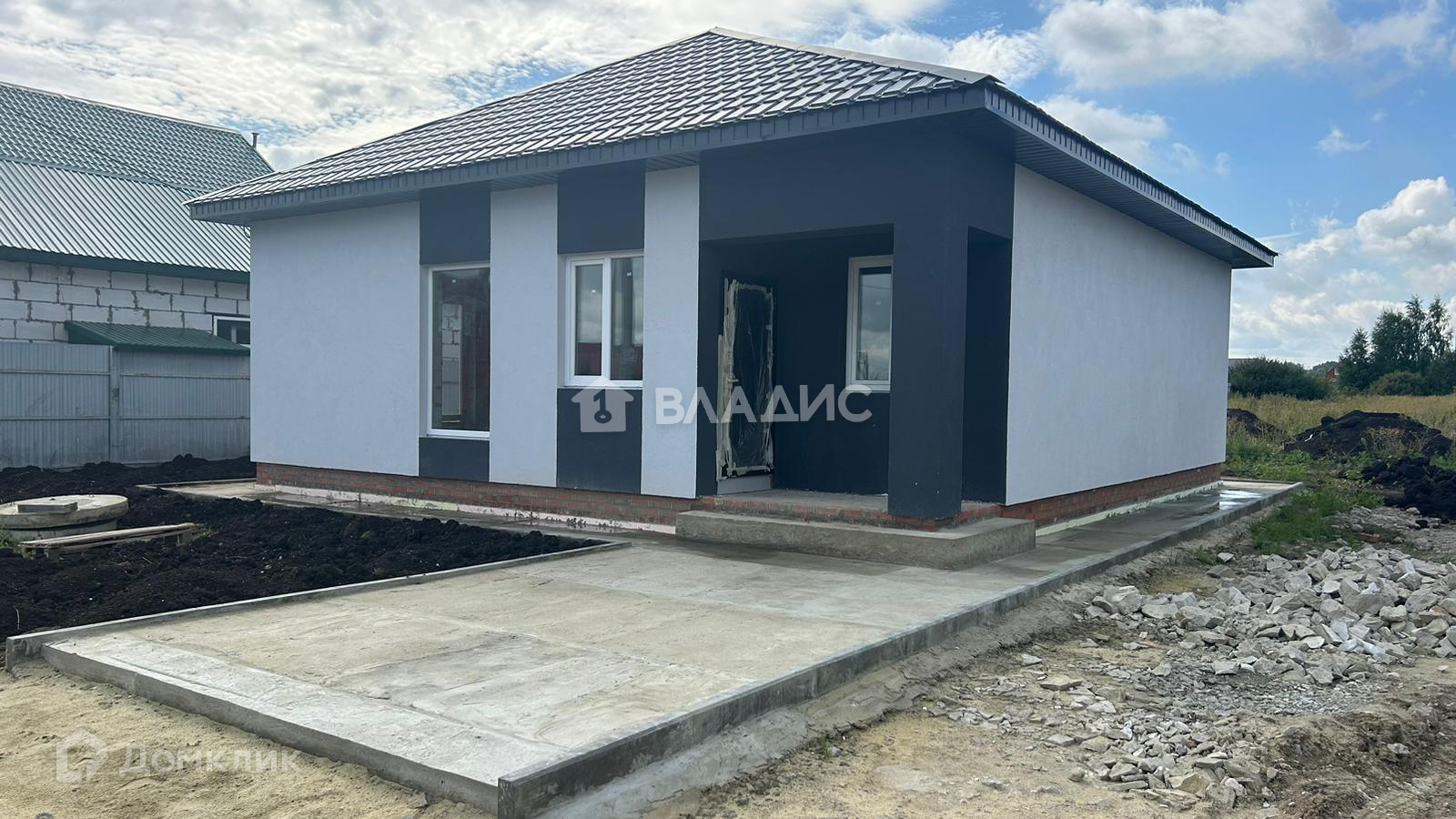 Электрический котел +радиаторы установлены, вокруг дома залита стяжка, установлены бордюры, завезен чернозем.