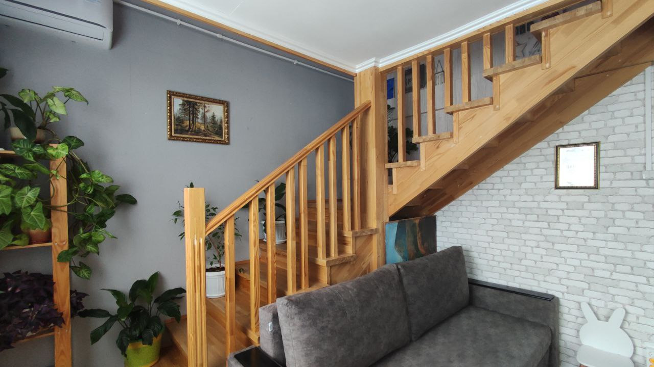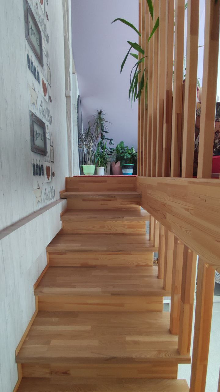 Межэтажная лестница выполнена из качественного материала (бук), он не подвержен сколам, вмятинам, как из дешёвого материала, покрыта лаком.