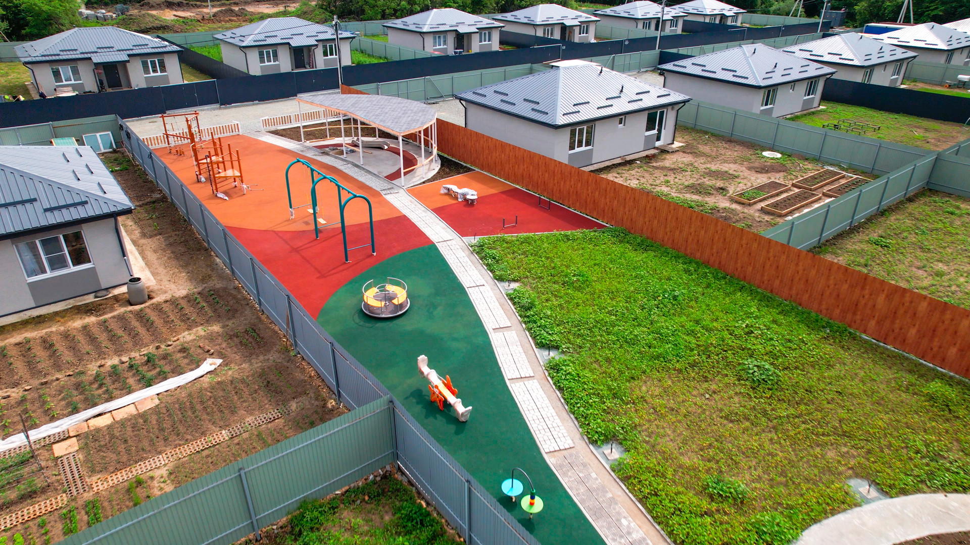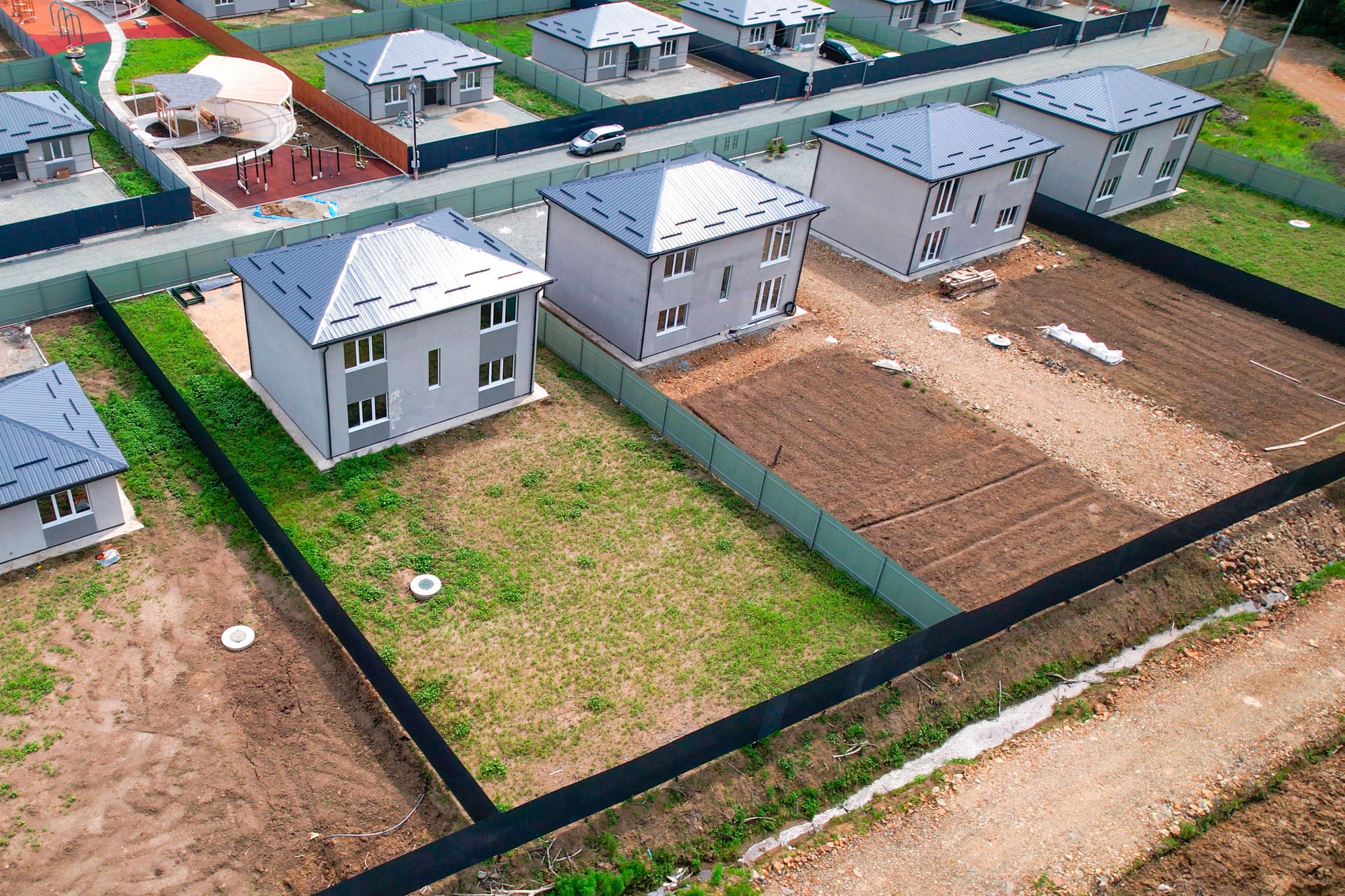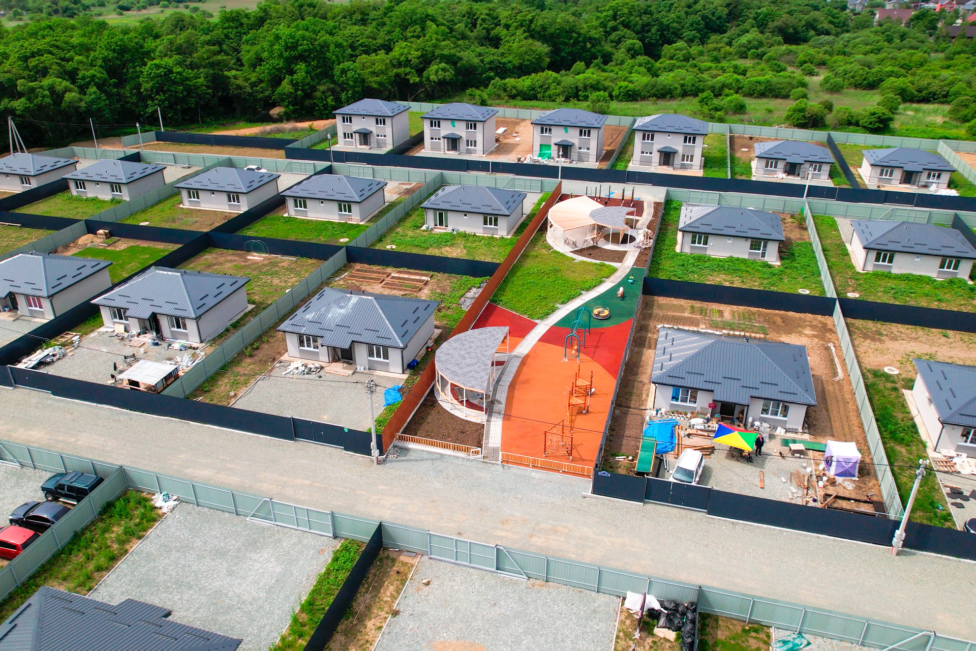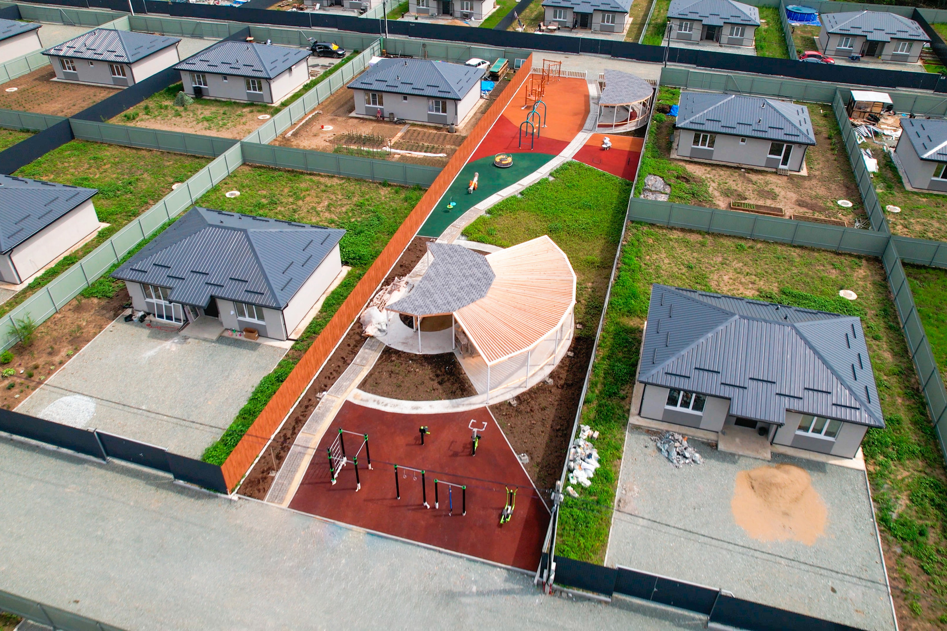 Закрытая территория(шлагбаум), большое общественное пространство, включающее в себя детскую площадку, спортивную зону с тренажерами и большую прогулочную зону со скамейками для отдыха. Предусмотрено уличное освещение. На территории коттеджного поселка осуществлен качественный дренаж дорог, в основании уложен скальный грунт, поверхность полотна отсыпана щебнем.