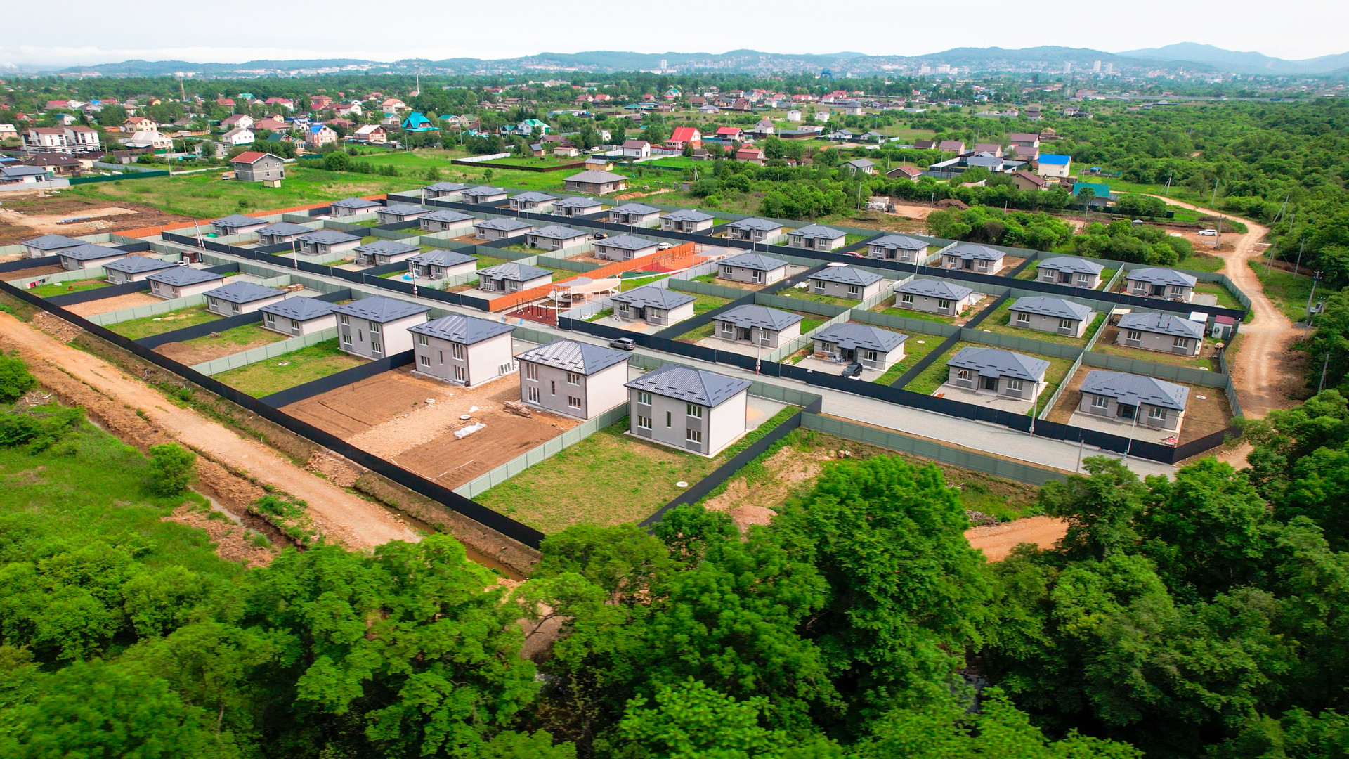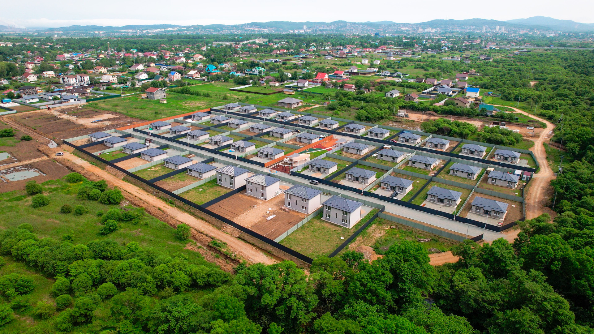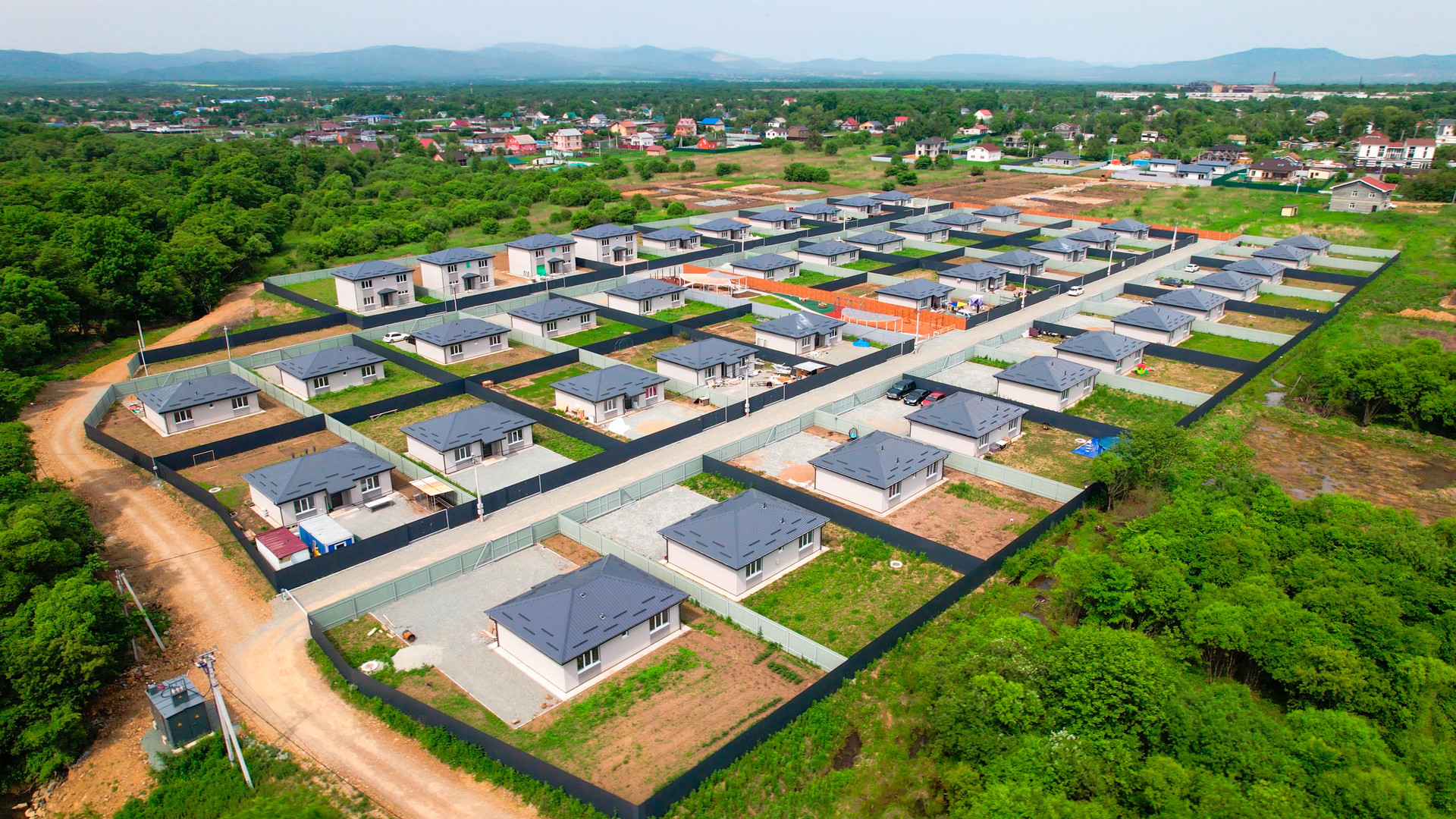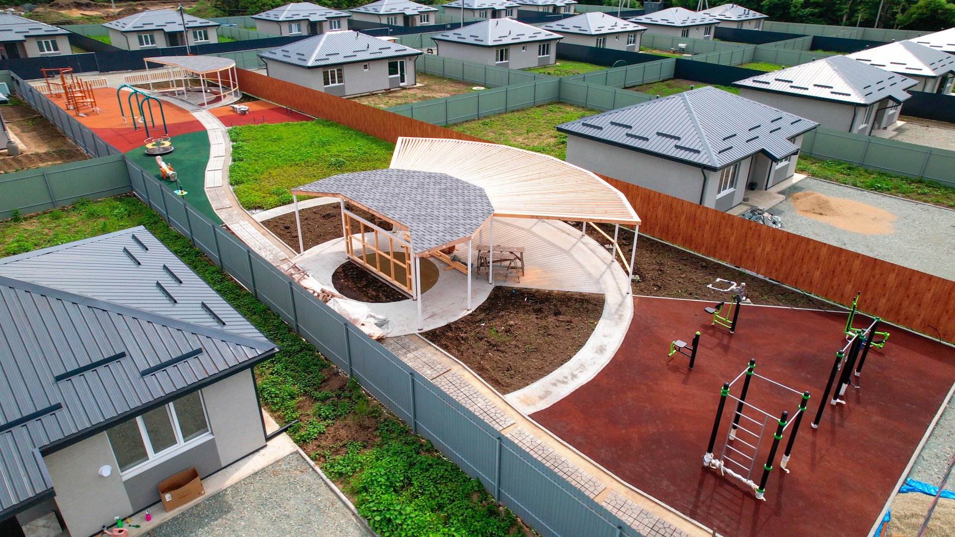 Закрытая территория(шлагбаум), большое общественное пространство, включающее в себя детскую площадку, спортивную зону с тренажерами и большую прогулочную зону со скамейками для отдыха. Предусмотрено уличное освещение. На территории коттеджного поселка осуществлен качественный дренаж дорог, в основании уложен скальный грунт, поверхность полотна отсыпана щебнем.