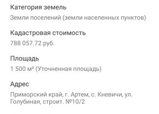Продается земельный участок площадью 1720 кв.м. с видом разрешенного использования «Для ведения личного подсобного хозяйства (приусадебный земельный участок)» по адресу: Приморский край, г. Артём, с. Кневичи, ул. Марии Цукановой, в районе д. 31а. В соответствии с правилами землепользования и застройки на земельном участке разрешается построить жило... |