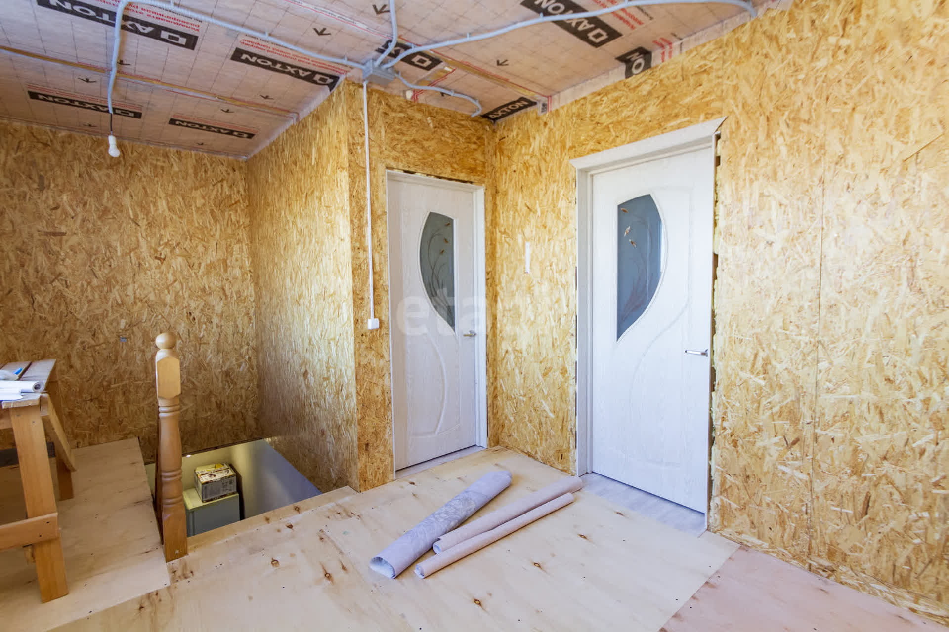 Внутренняя отделка - штукатурка, обои. Отделка второго этажа: стены - плиты ОSВ.