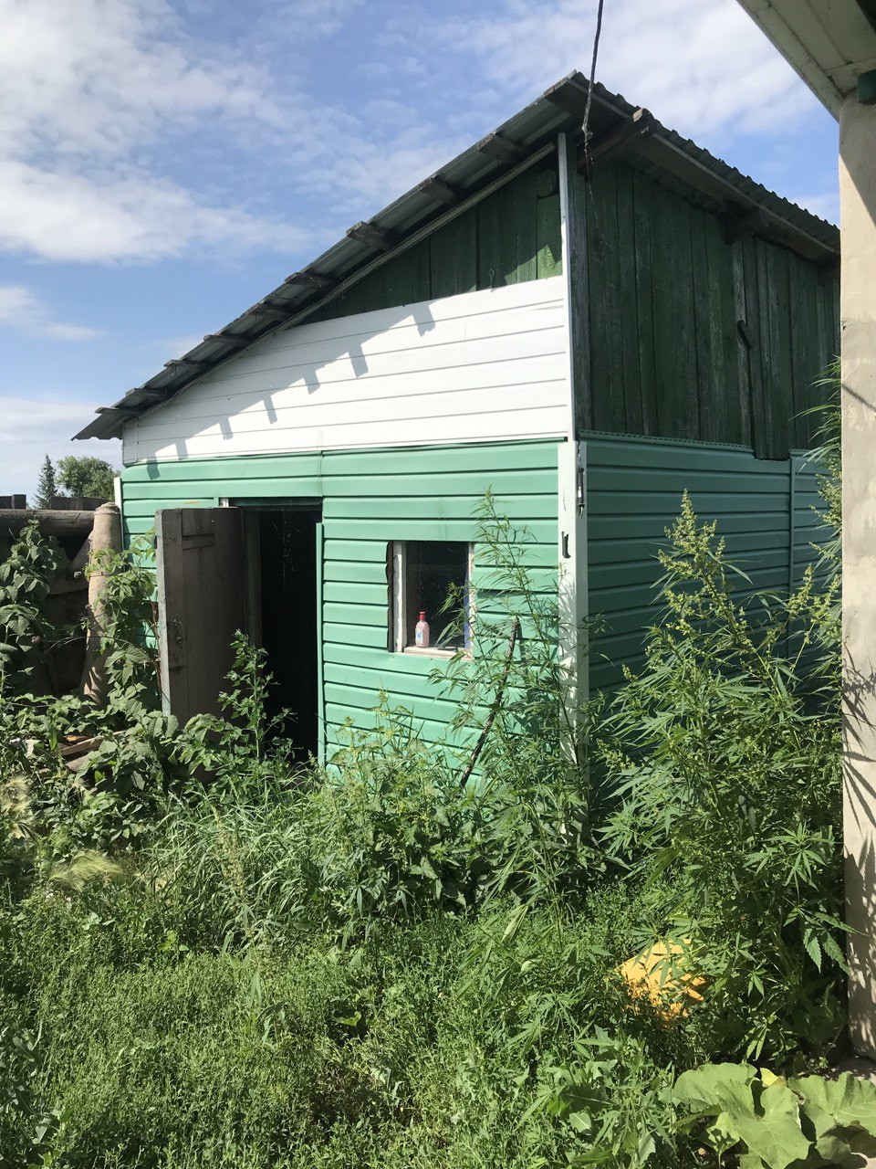 На участке несколько яблонь, малина, смородина, вишня, груша, теплица.