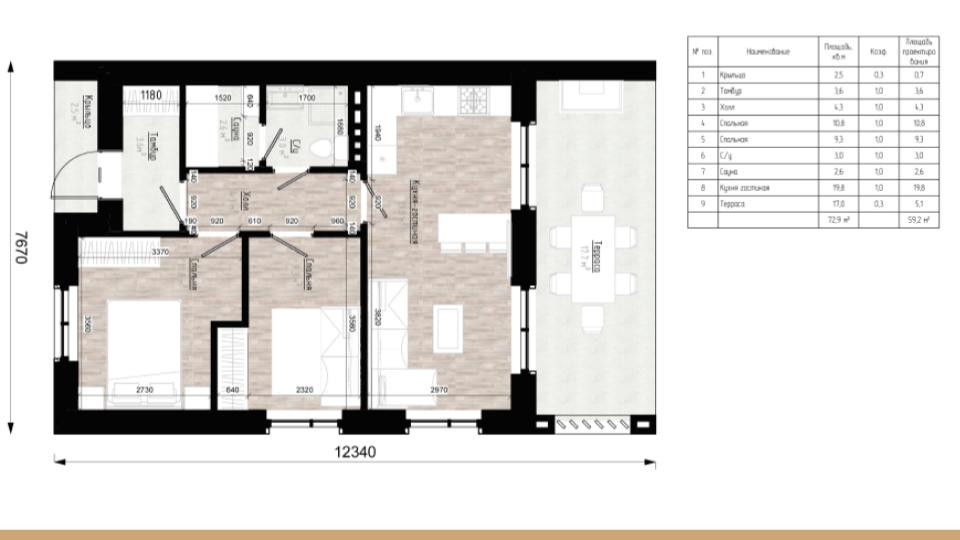 Предлагаем приобрести новый загородный дом, площадью 73 м² от застройщика. В доме 2 спальни(10,8 м², 9,3м²), кухня-гостиная 19,8 м², совмещенный с/у 3 м², сауна 2,6 м².
